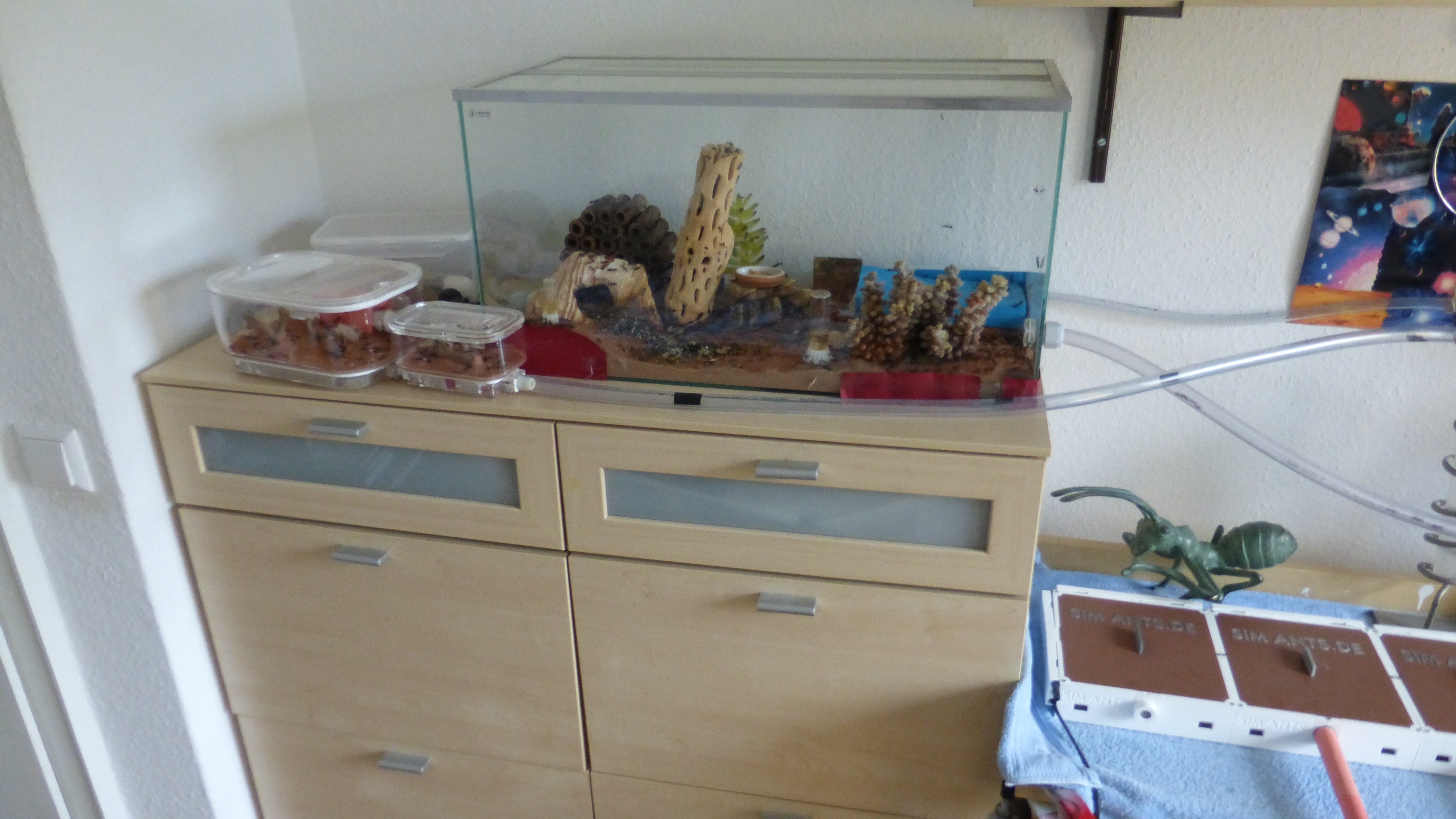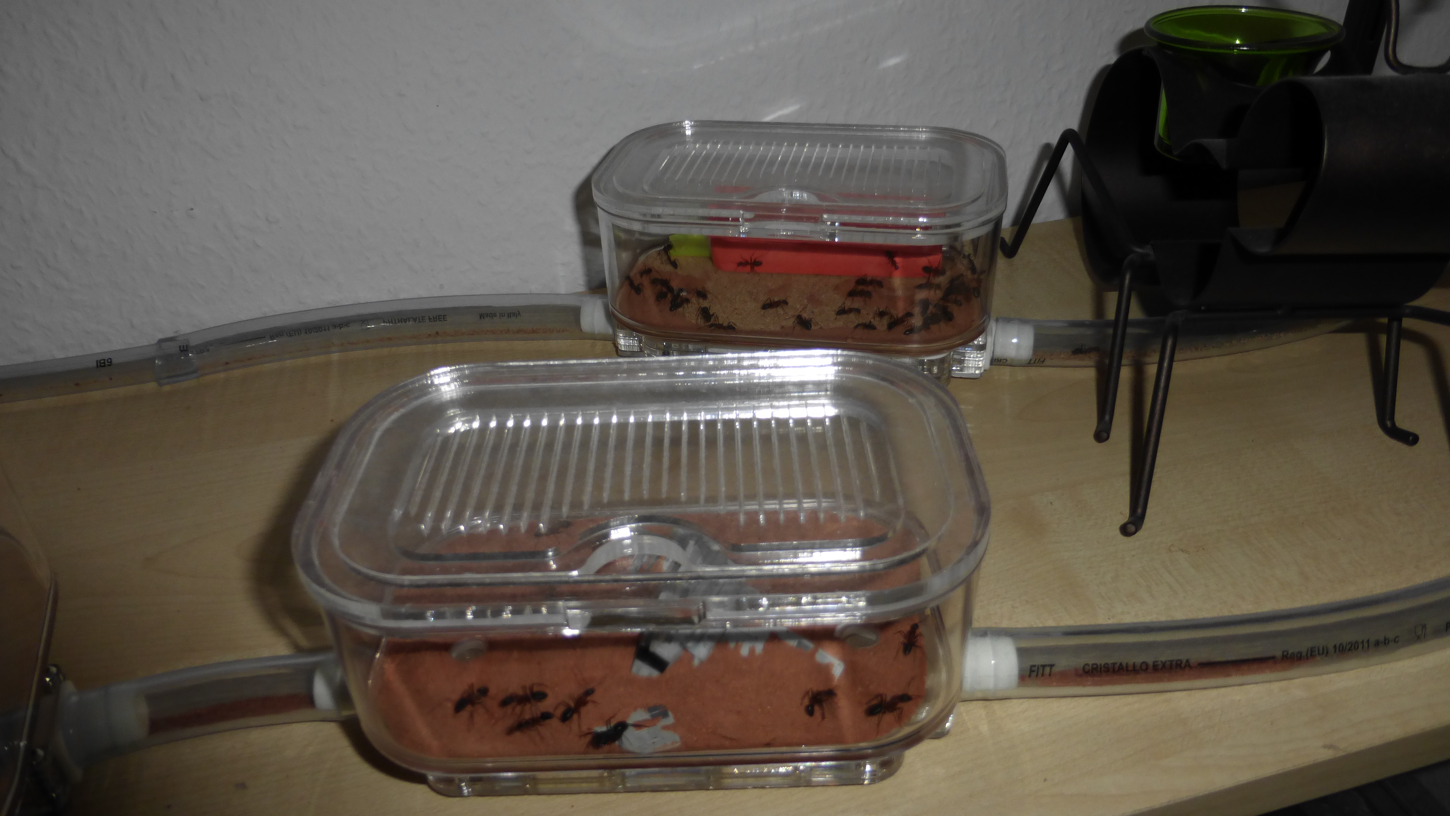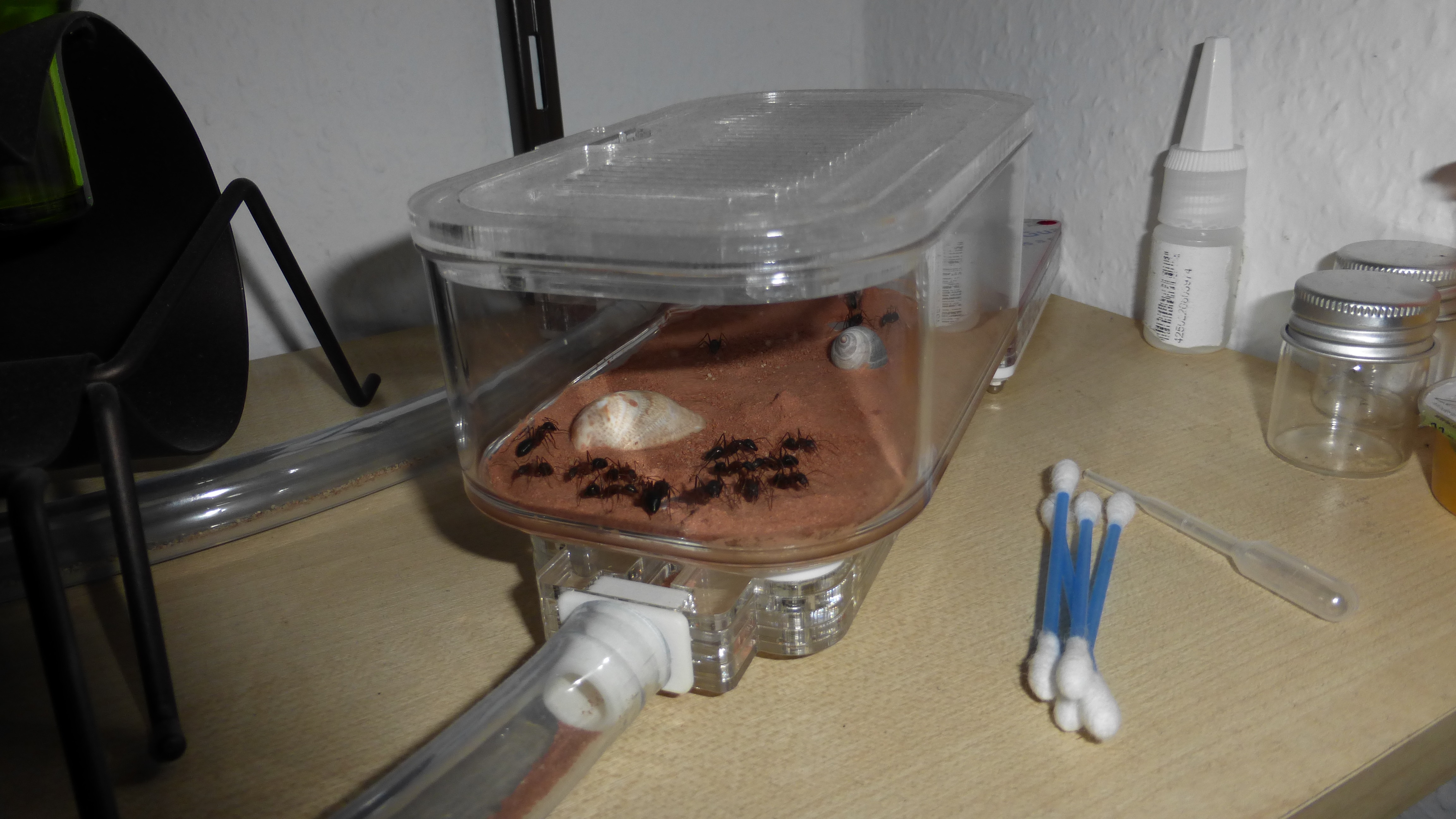 Das Shrimpsröhrenhotel ist voller als je zuvor, scheinbar sind ein paar Ameisen aus der benachbarten Plastikbox hierher umgezogen. Mittlerweile gleicht es praktisch einem dieser japanischen Kapselhotels.