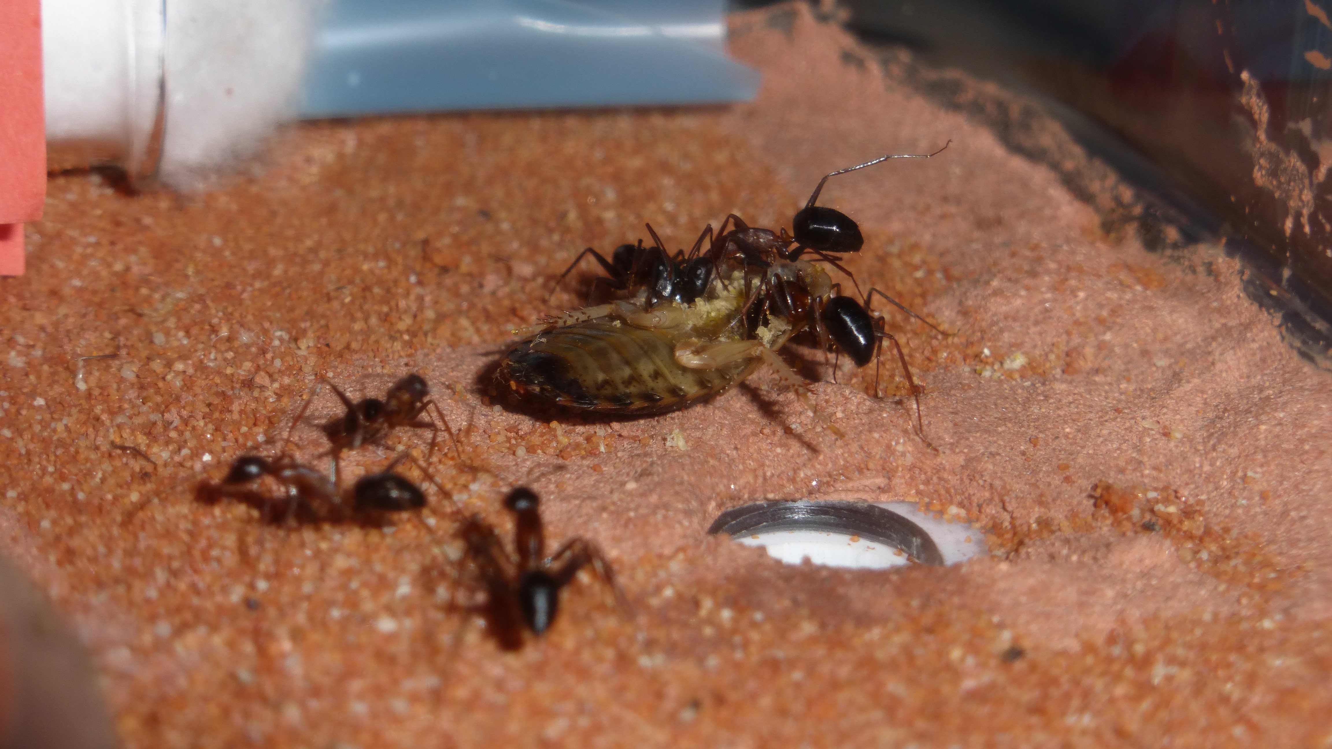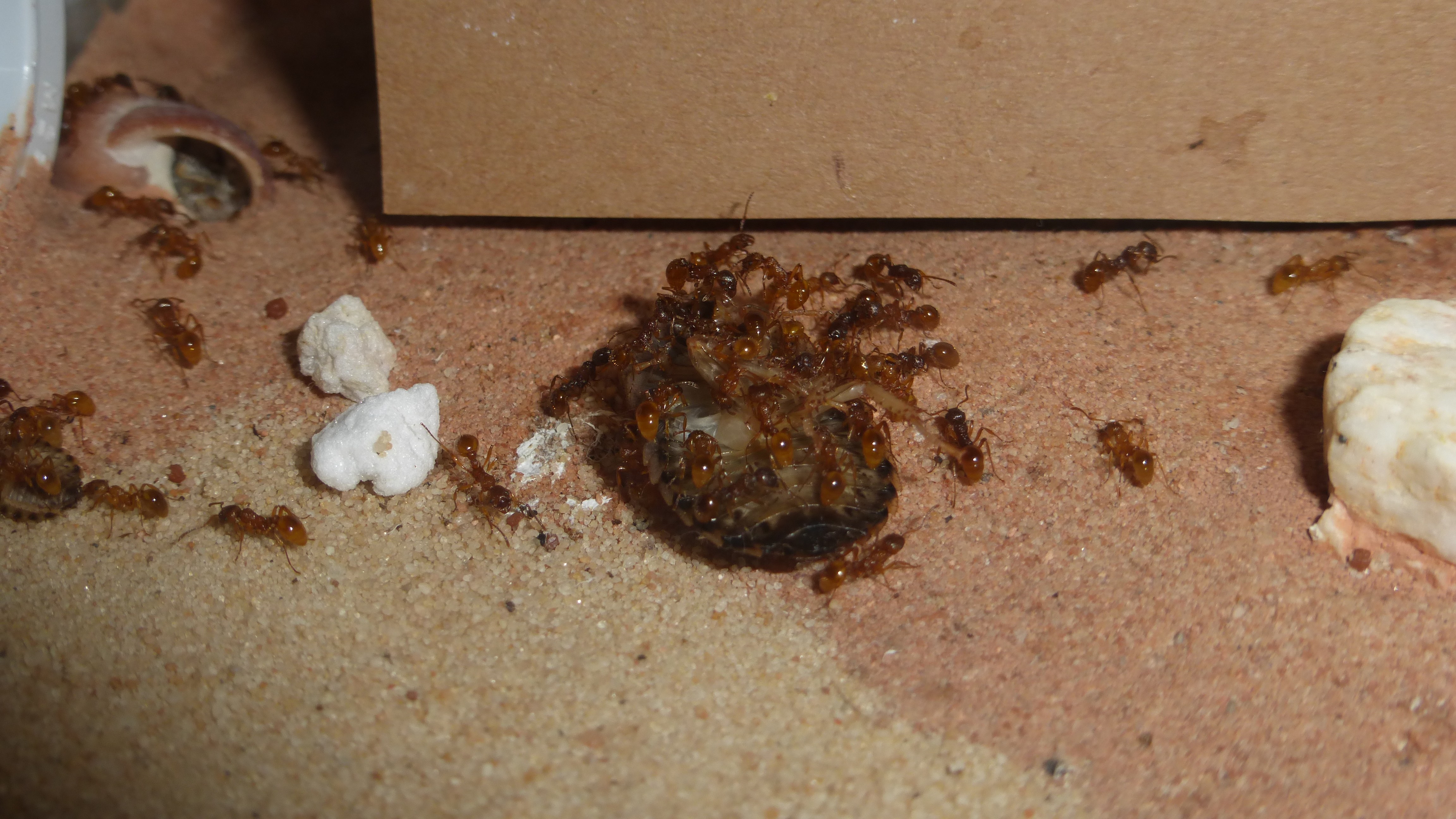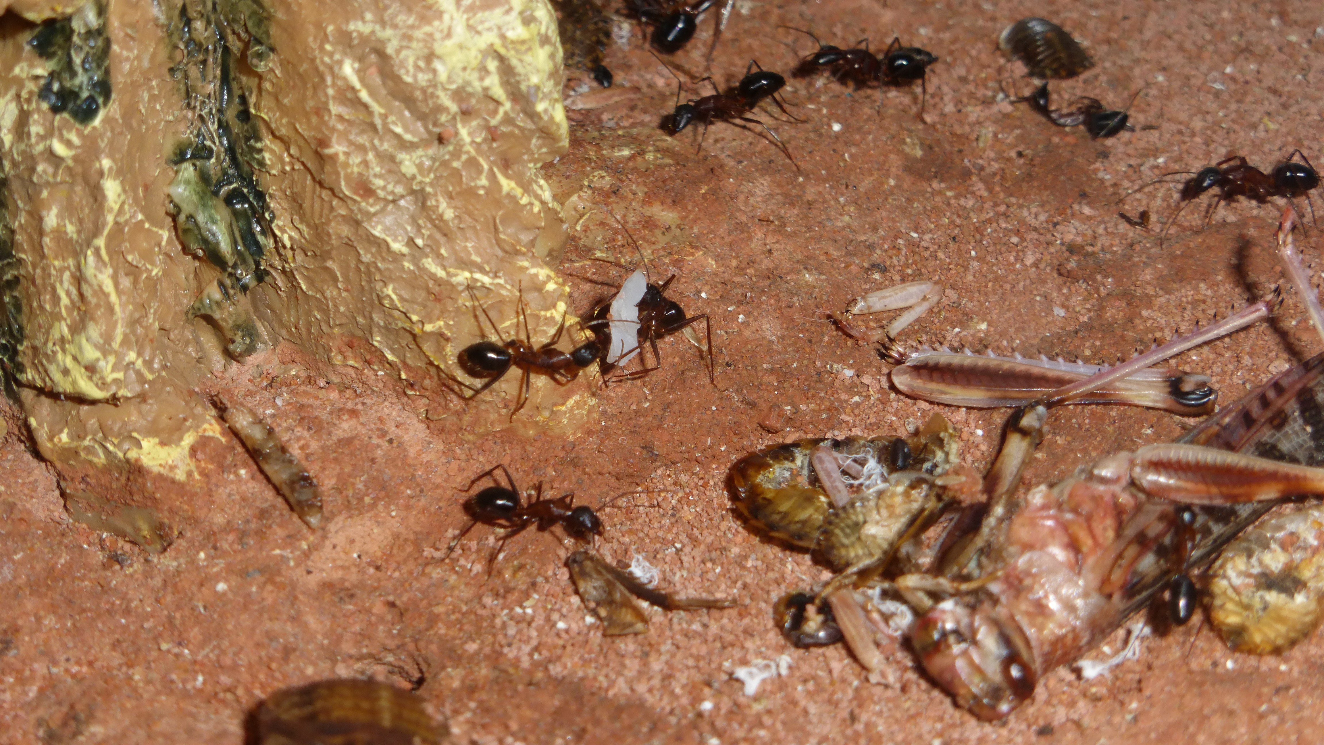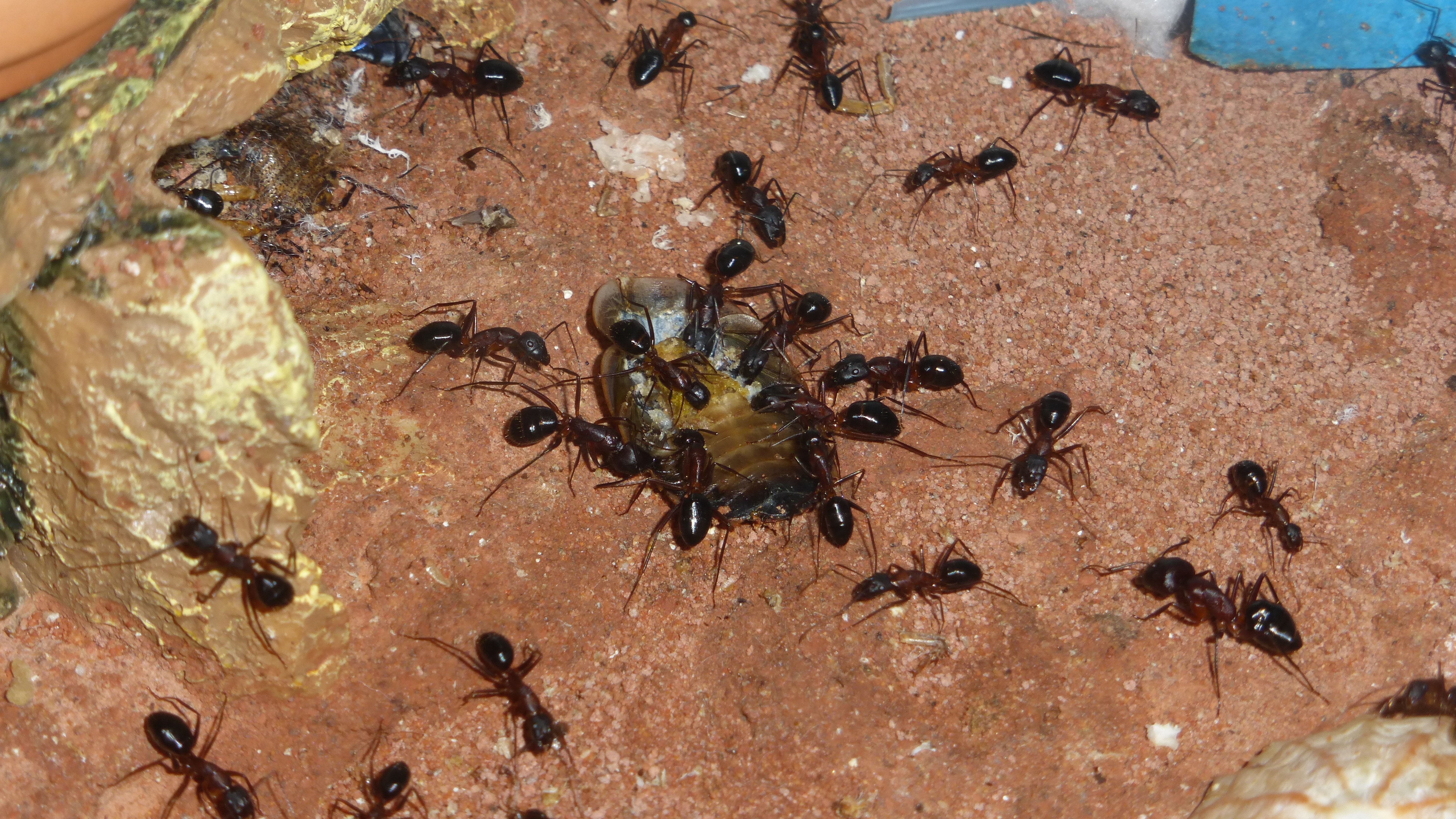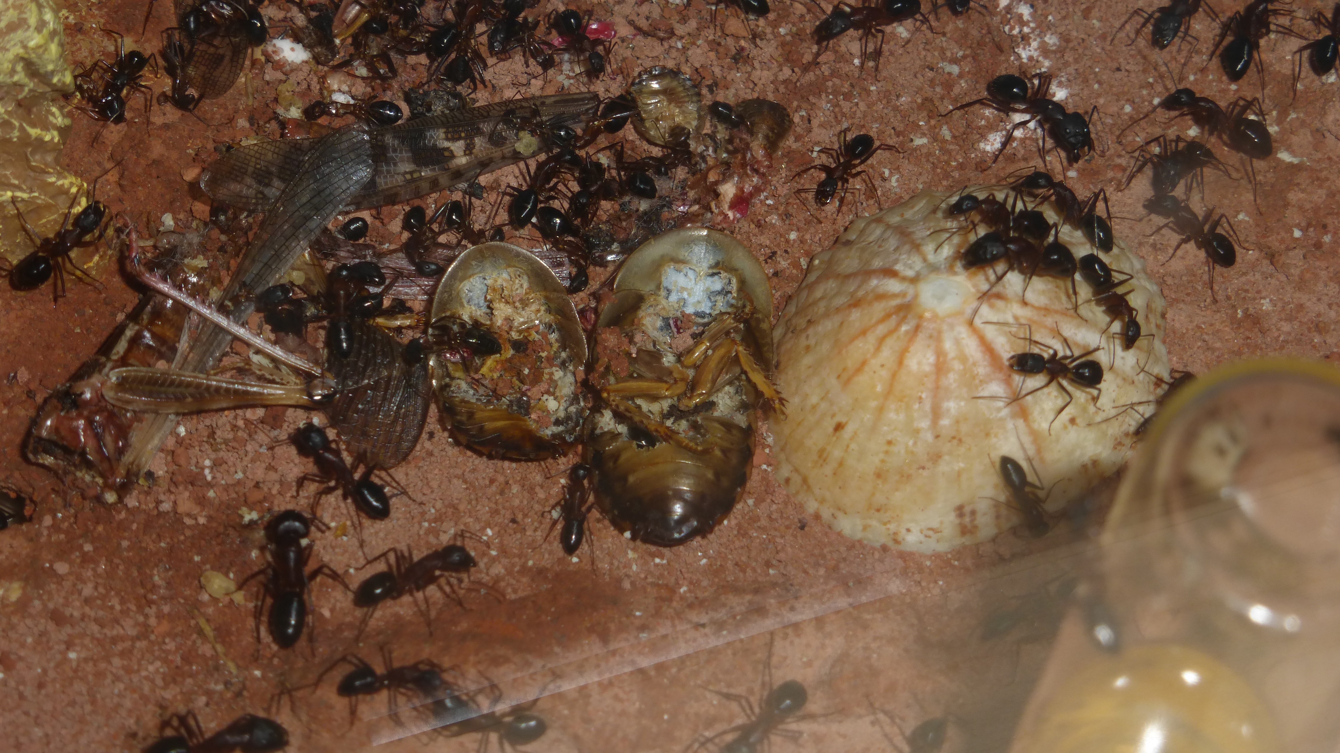 Die Myrmica machen sich weiterhin gut, hier zerlegen sie grad ne kleine Schabe.