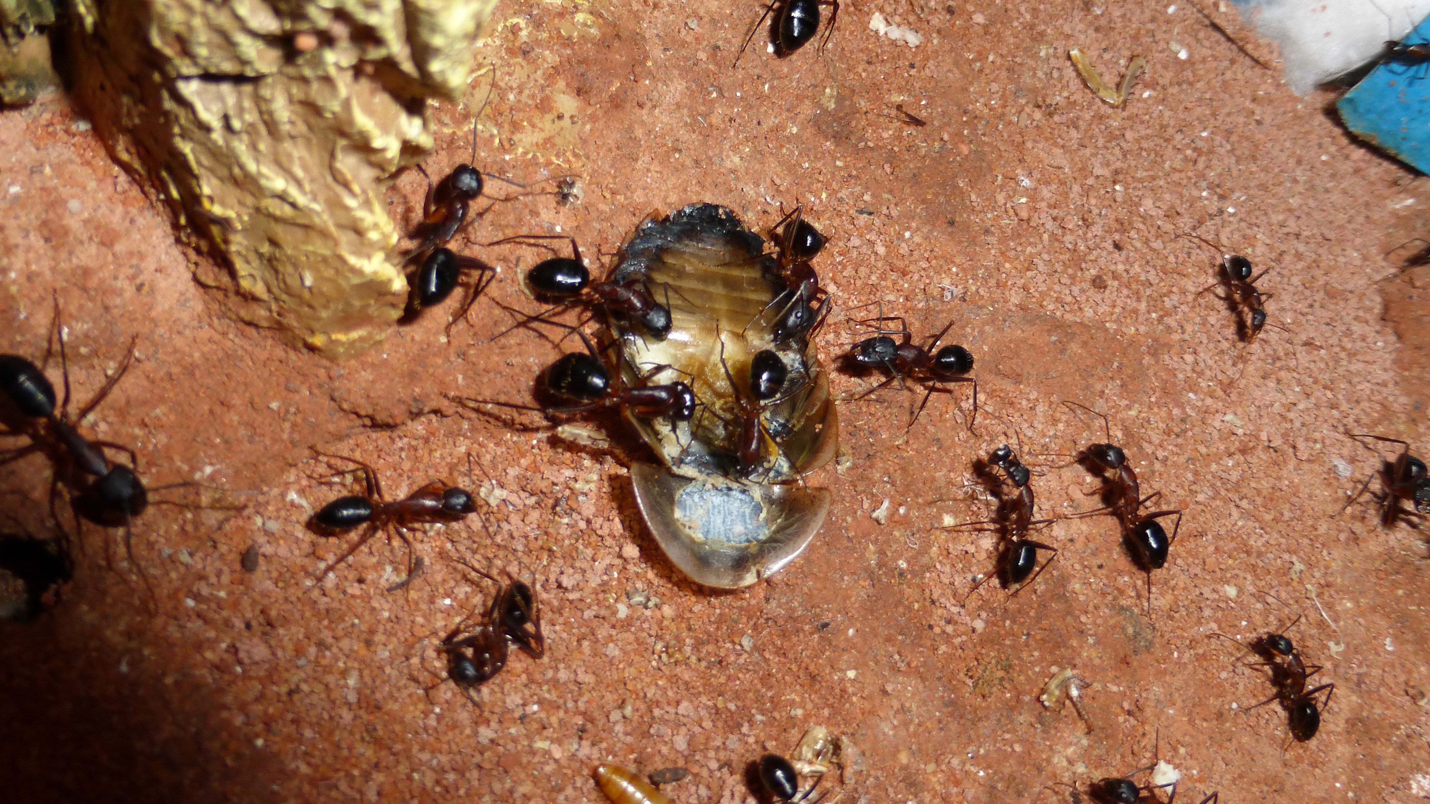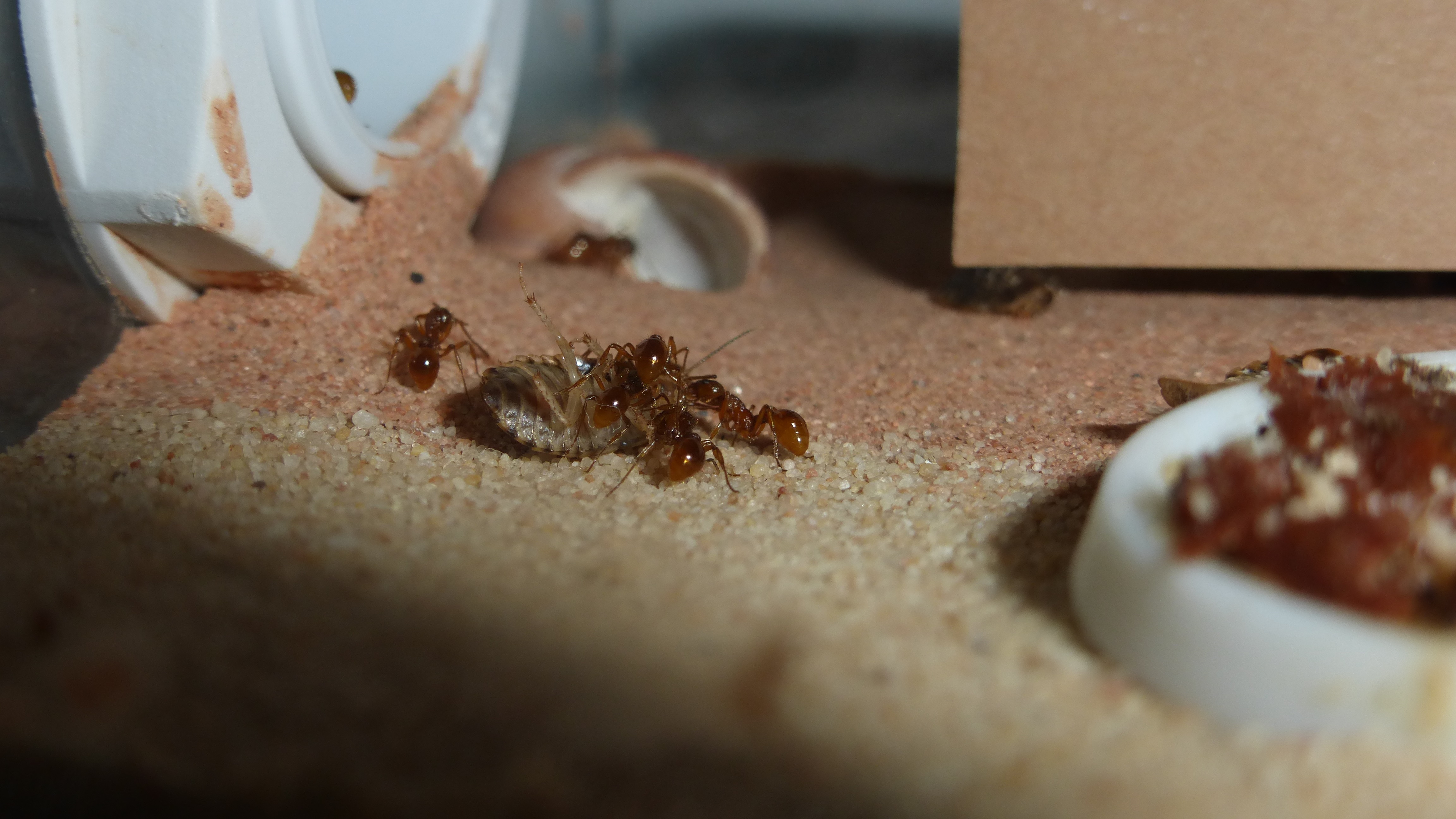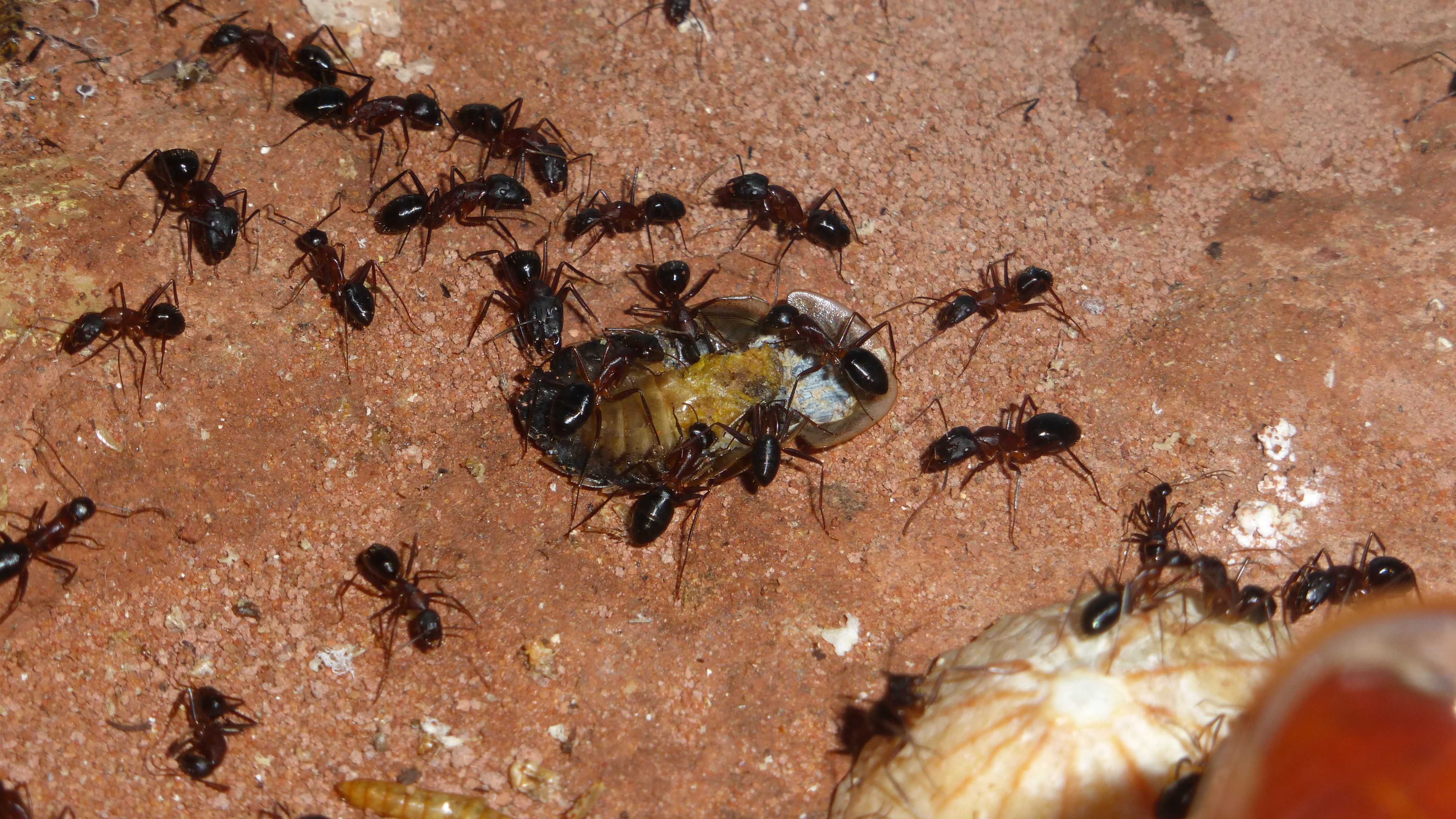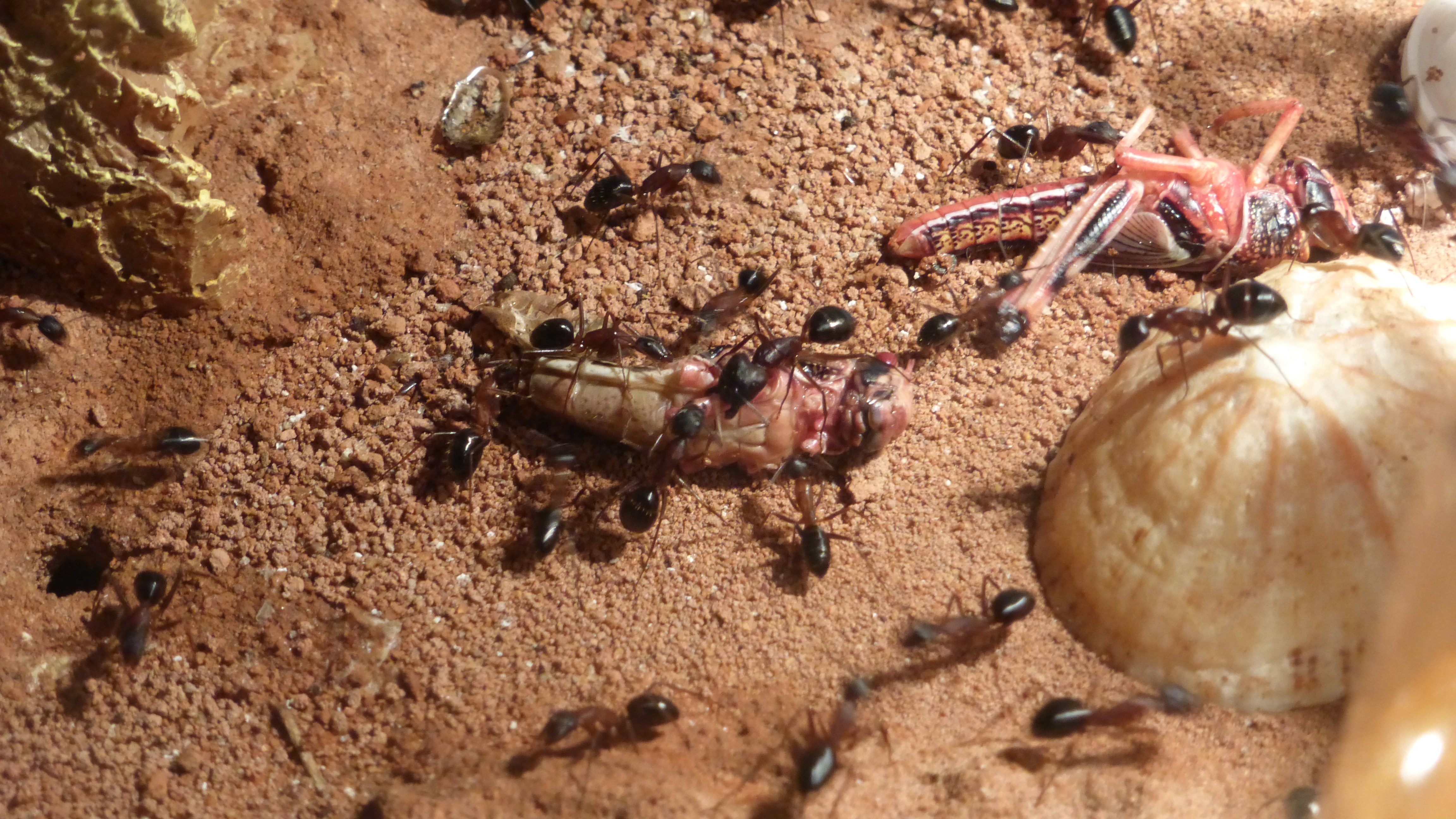 Die Myrmica machen sich weiterhin gut, hier zerlegen sie grad ne kleine Schabe.