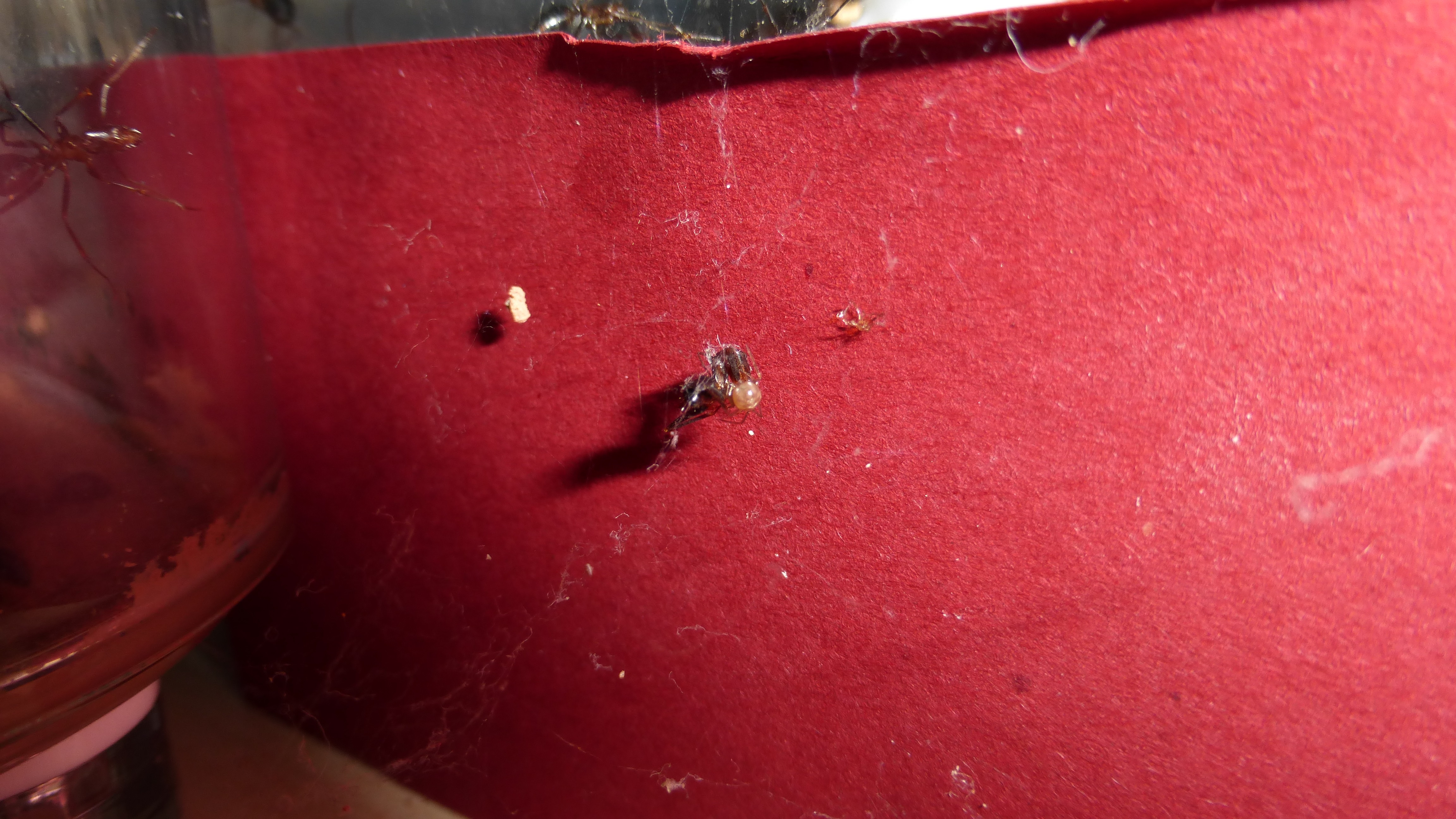 Sieht so aus als hätten wir eine Grenzwache. Die Ameise ist wohl beim saubermachen entwischt und wurde beim Versuch zurück zur Kolonie zu kommen von der Spinne erwischt.