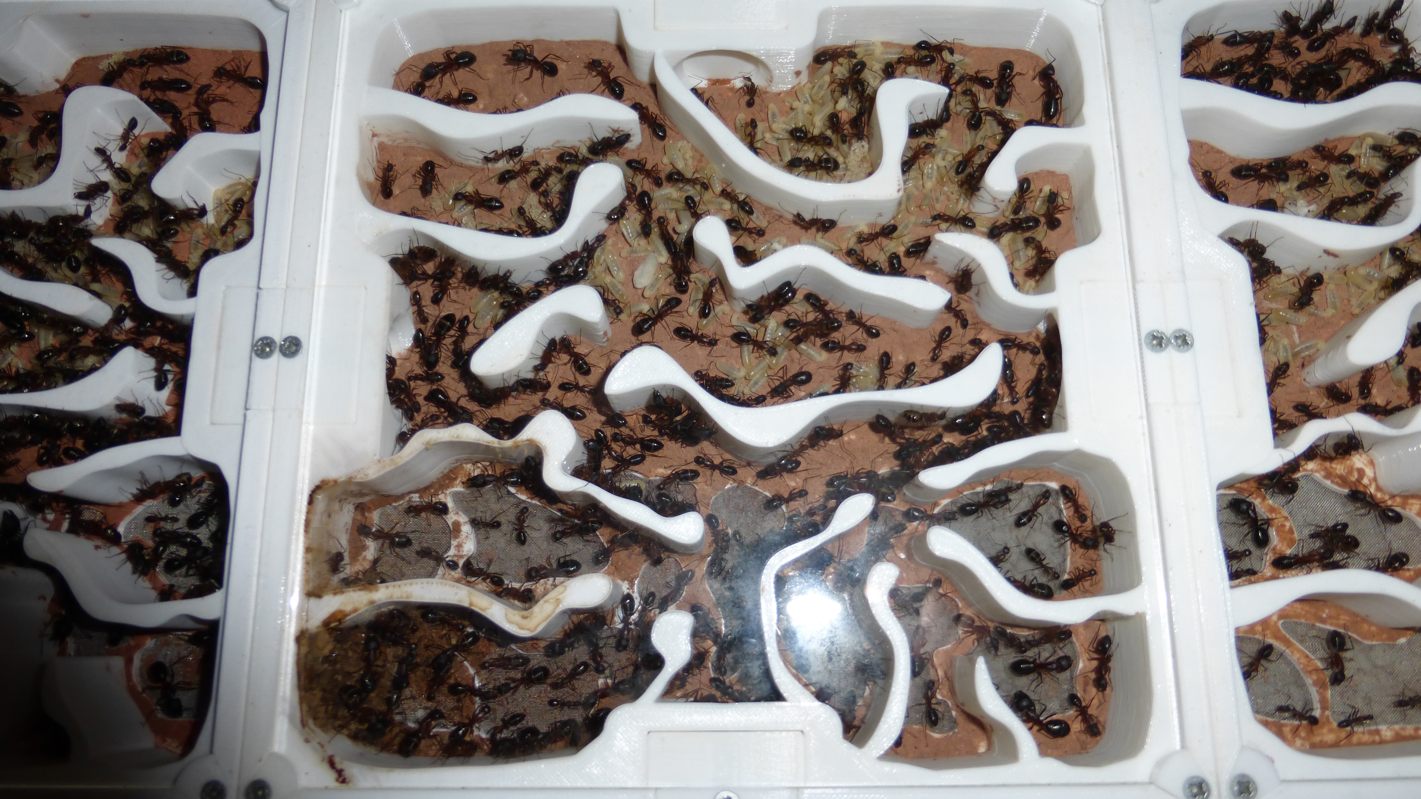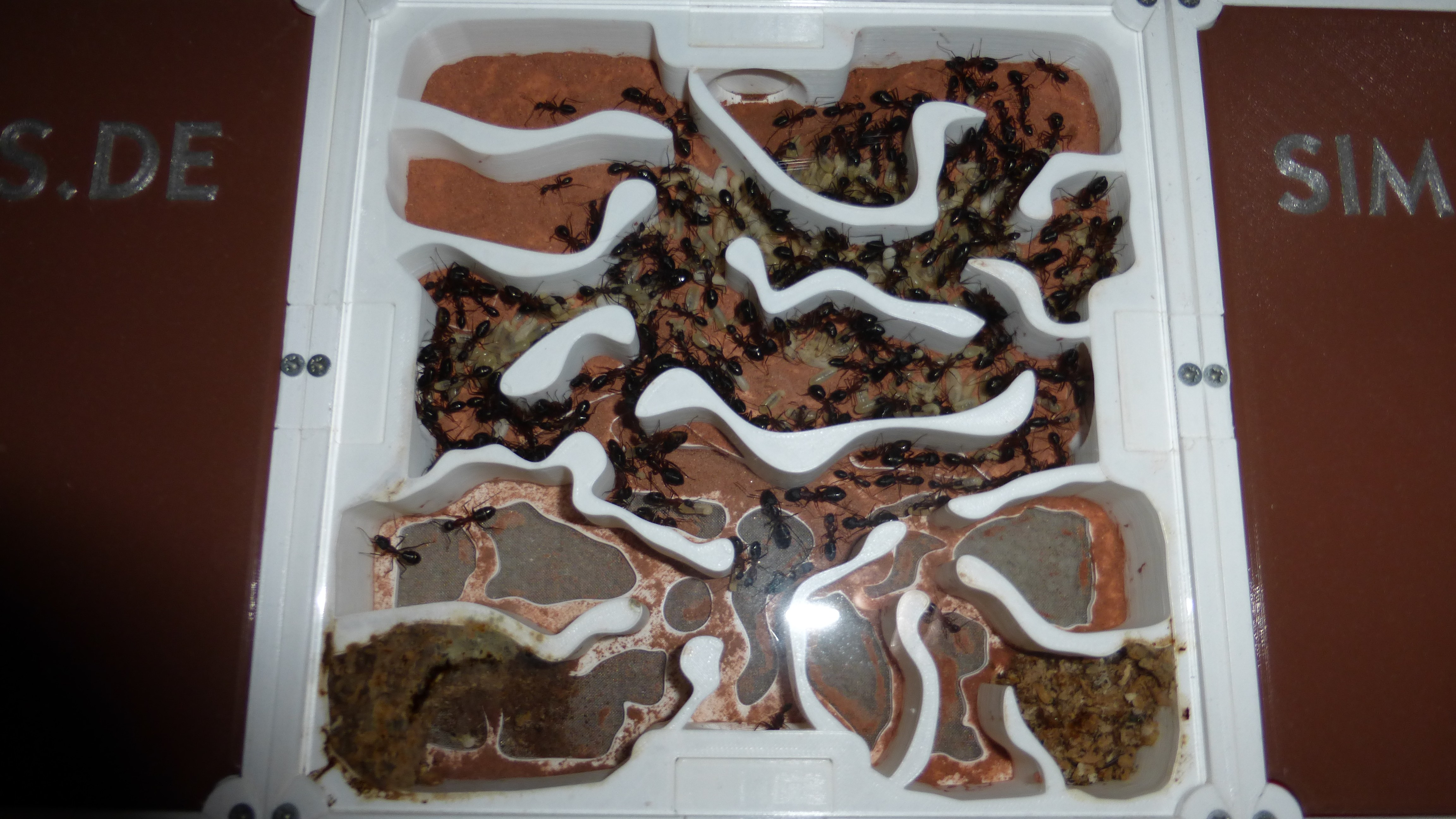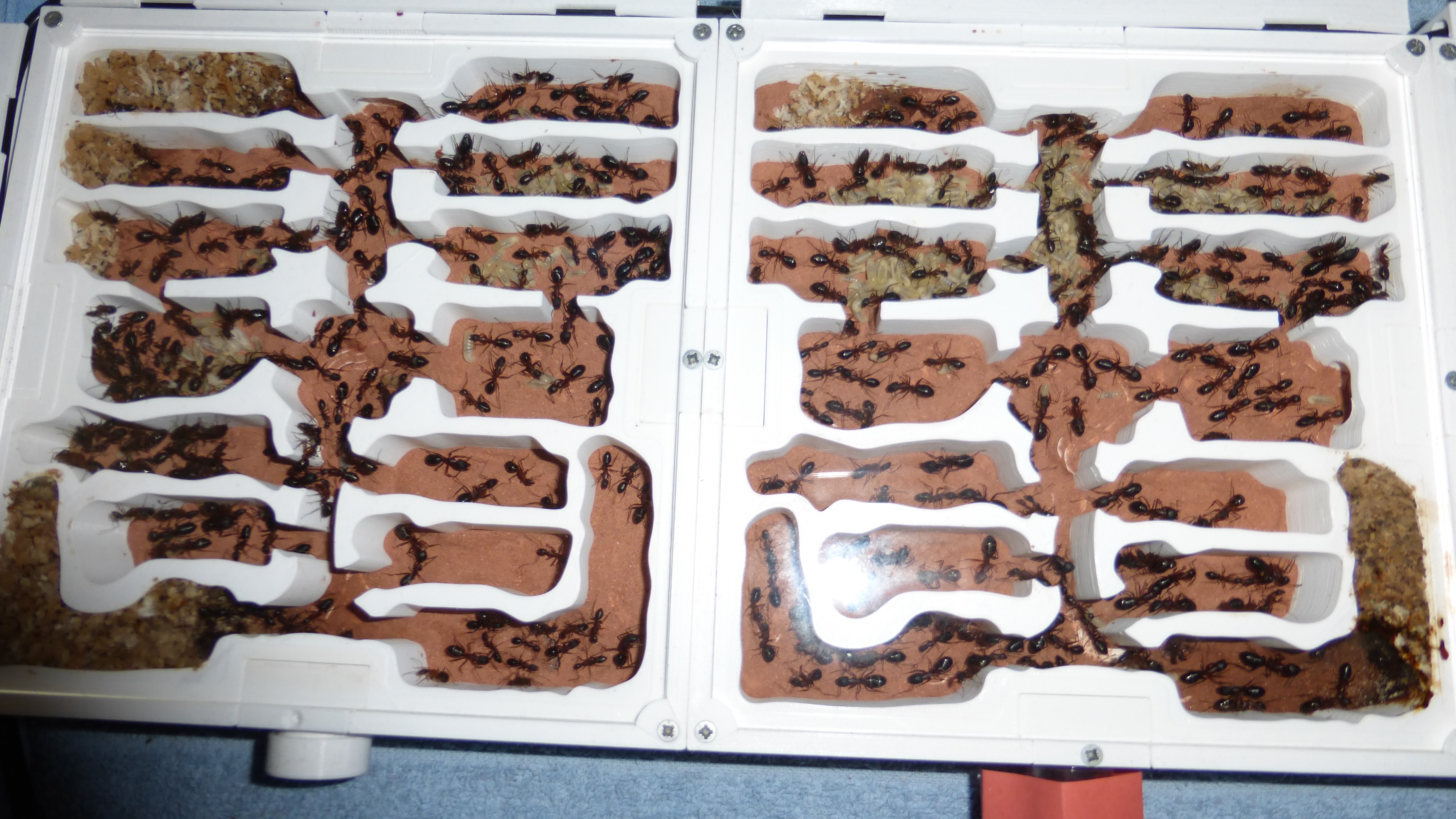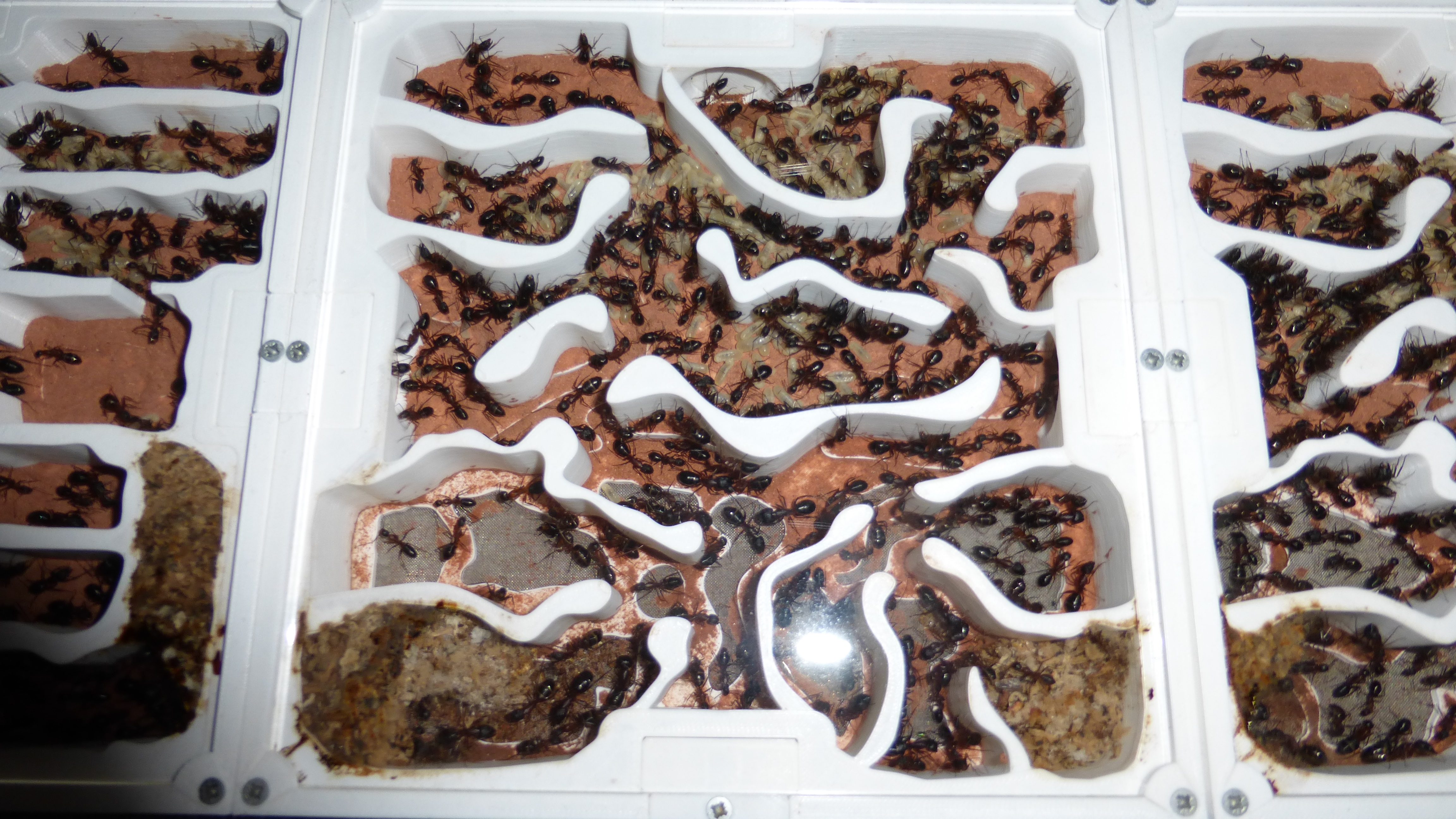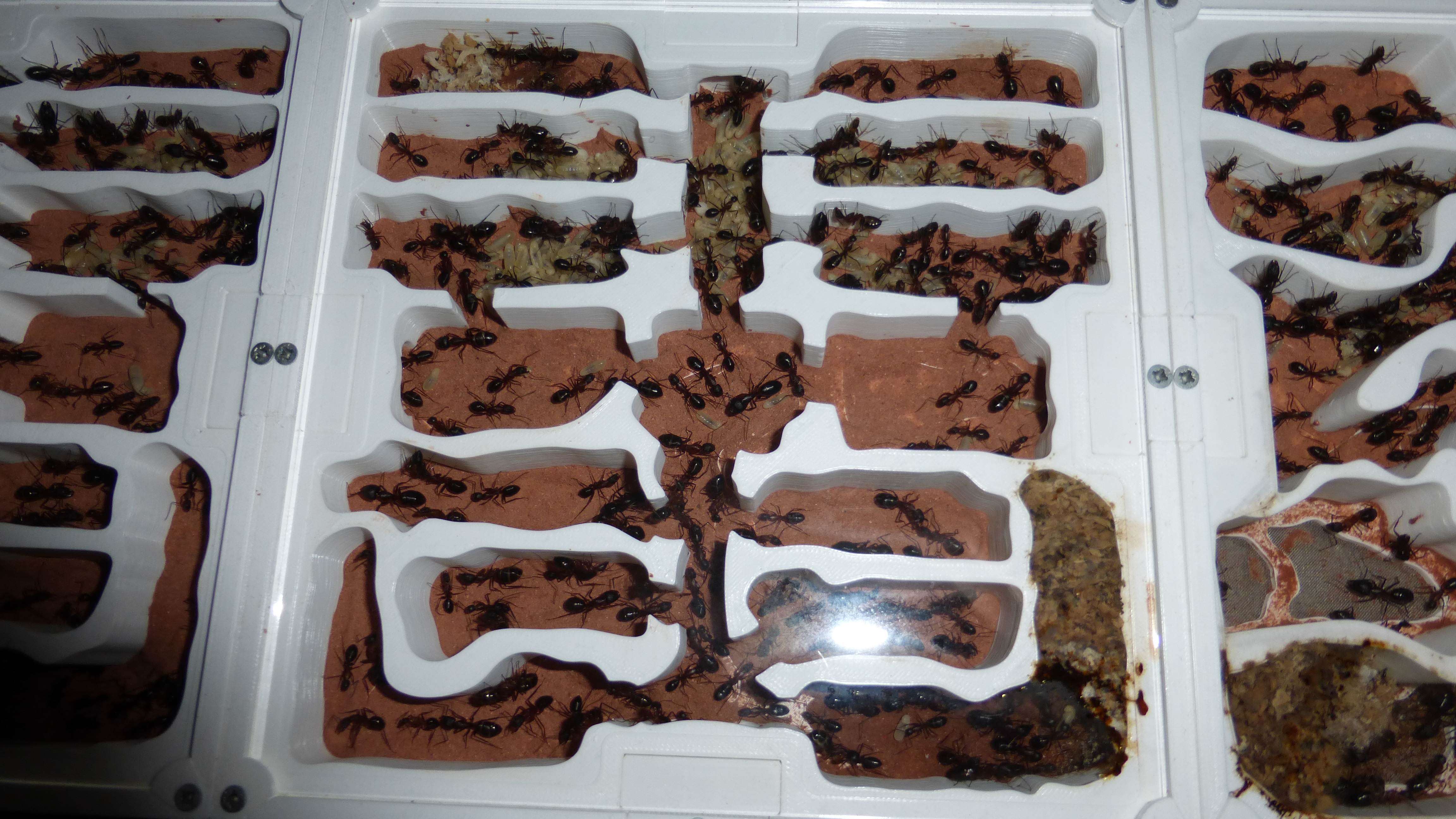 Sieht noch immer ein bisschen leer aus, aber die Königin ist kürzlich ins Nest zurückgezogen und in den Wasser-RGs und einigen Kammern häufen sich Klümpchen kleiner Larven.