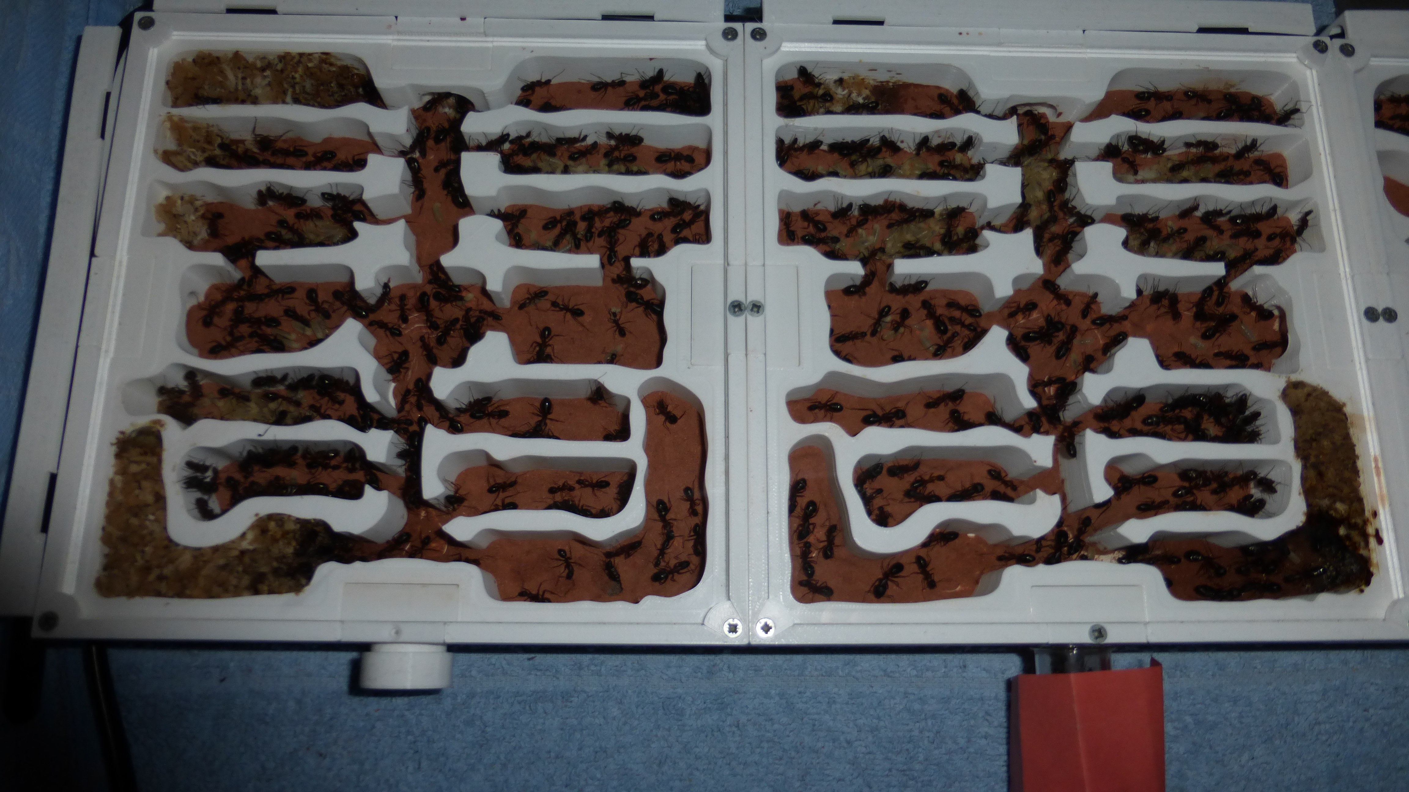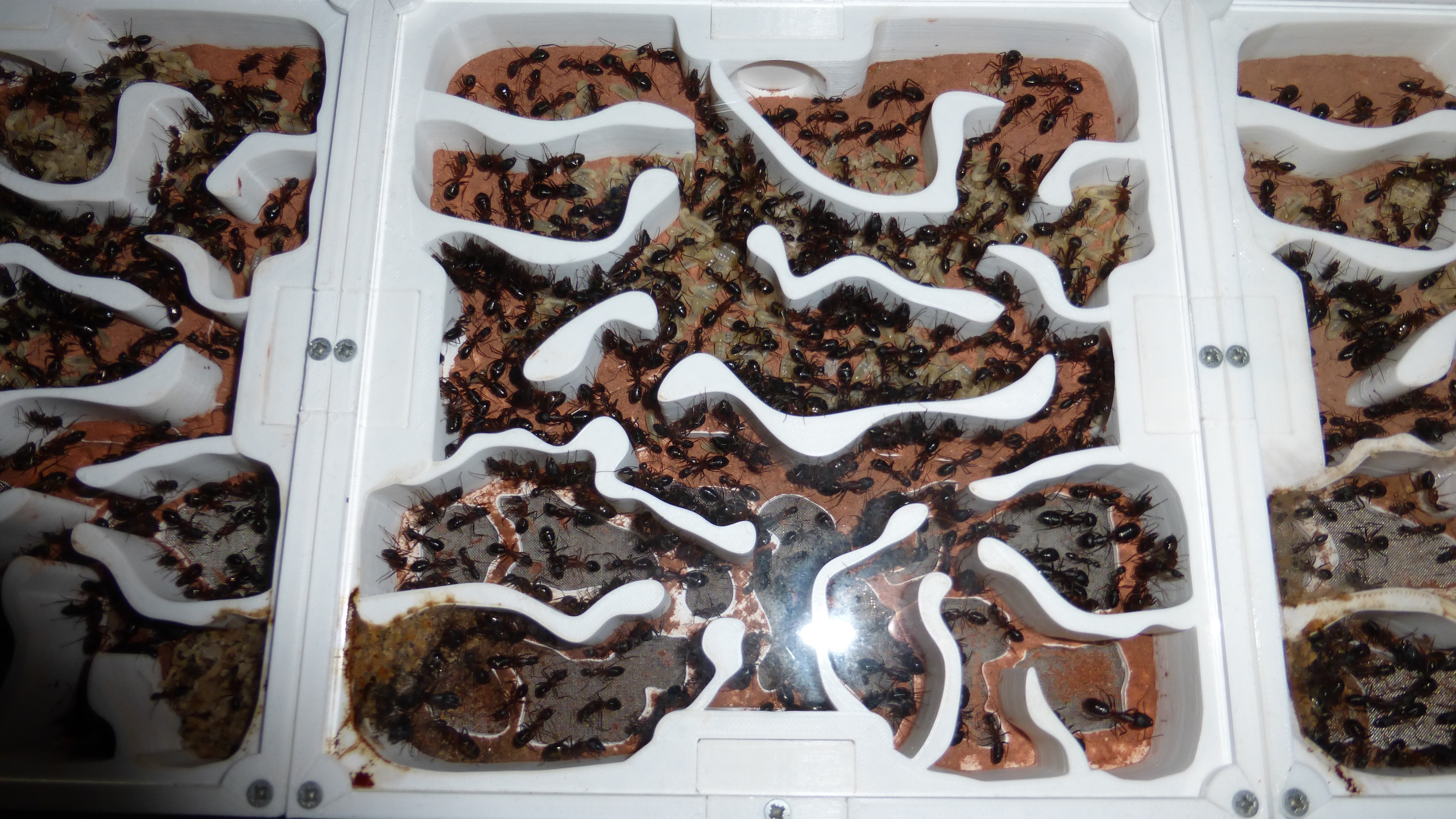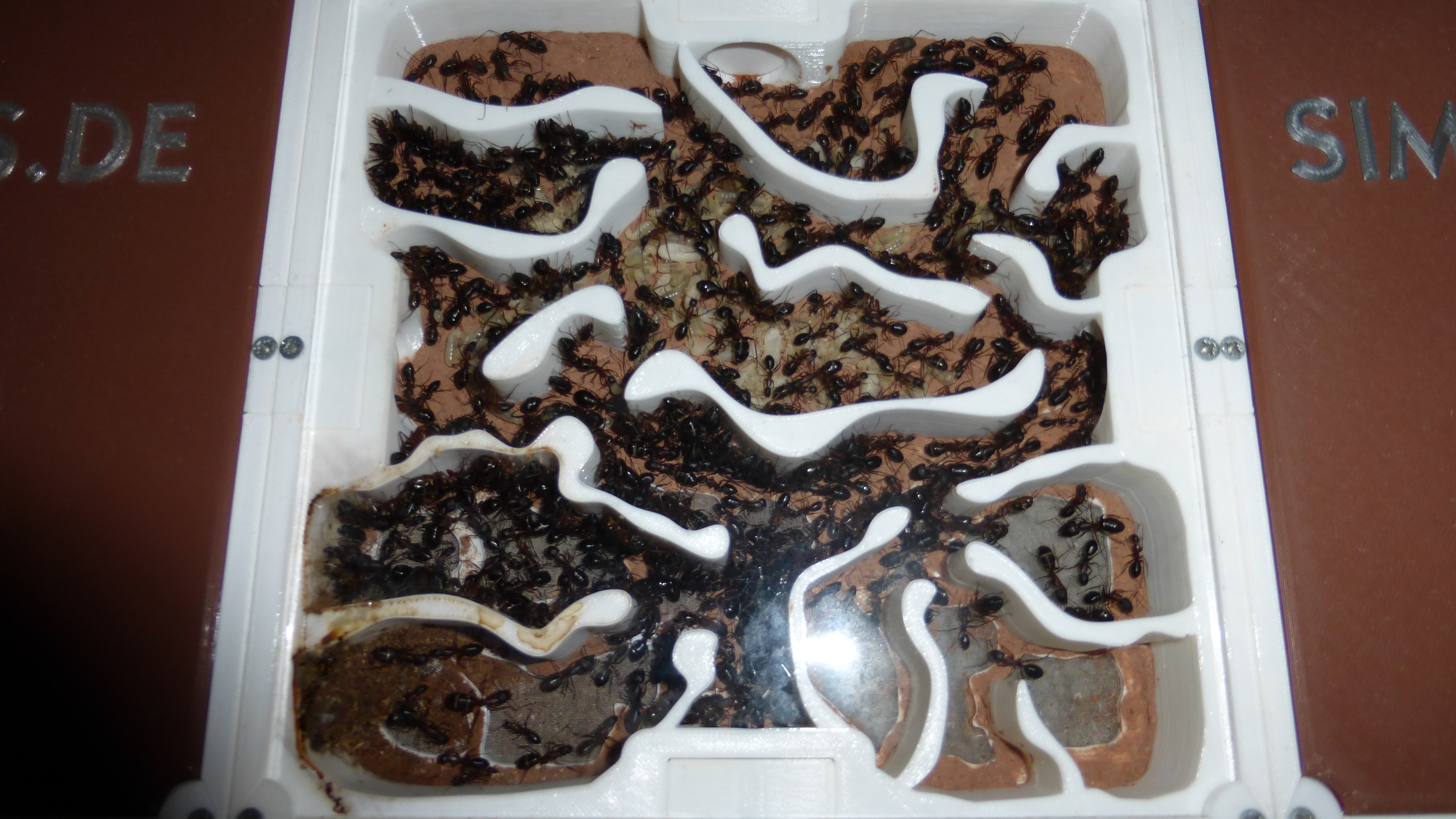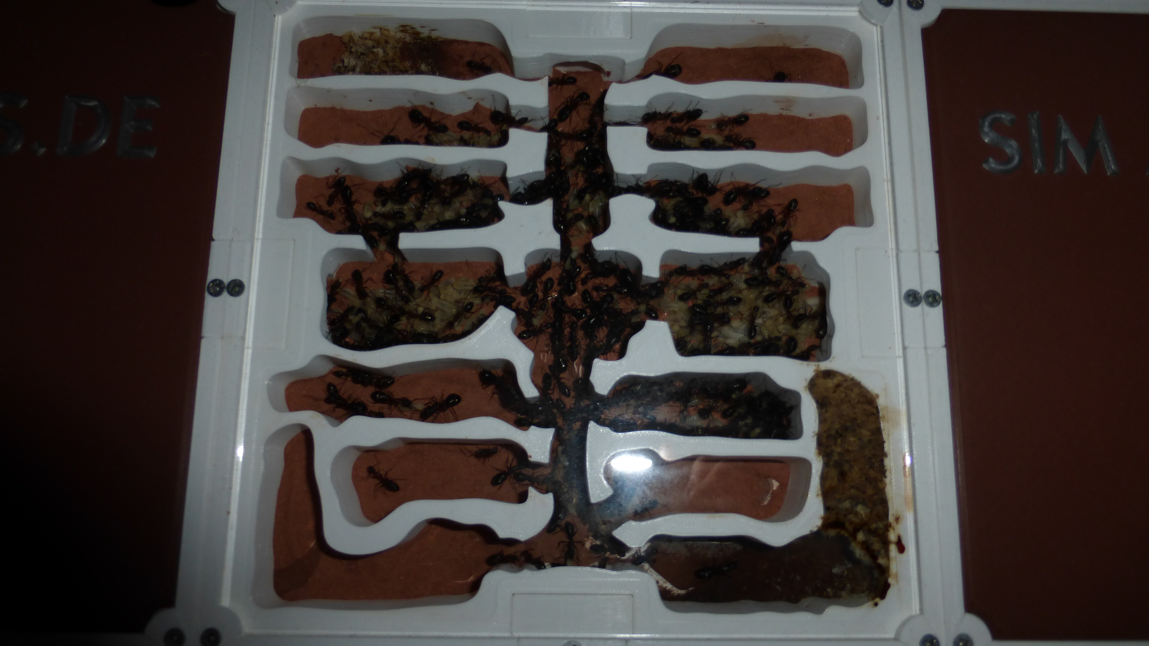 Sieht noch immer ein bisschen leer aus, aber die Königin ist kürzlich ins Nest zurückgezogen und in den Wasser-RGs und einigen Kammern häufen sich Klümpchen kleiner Larven.