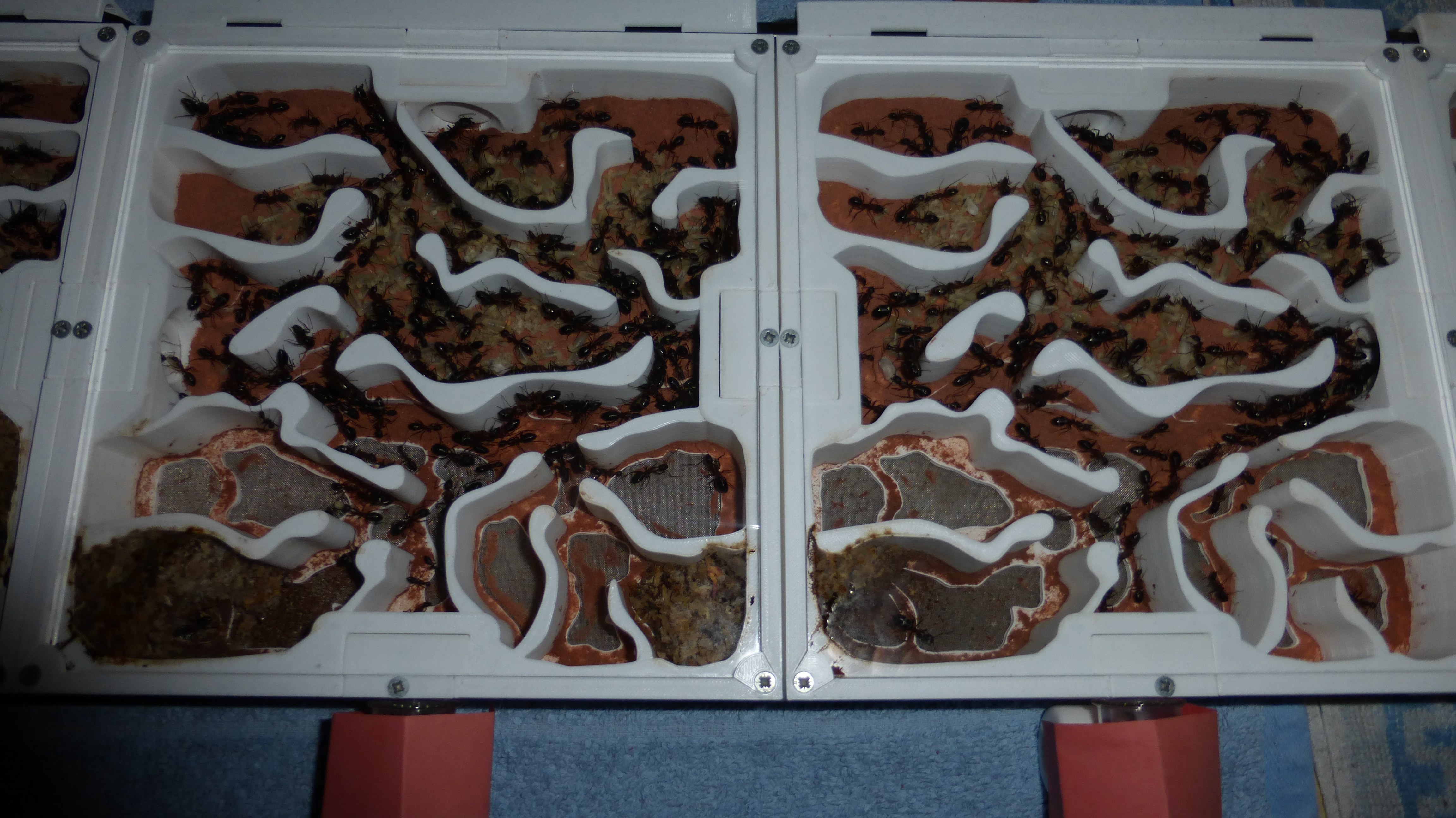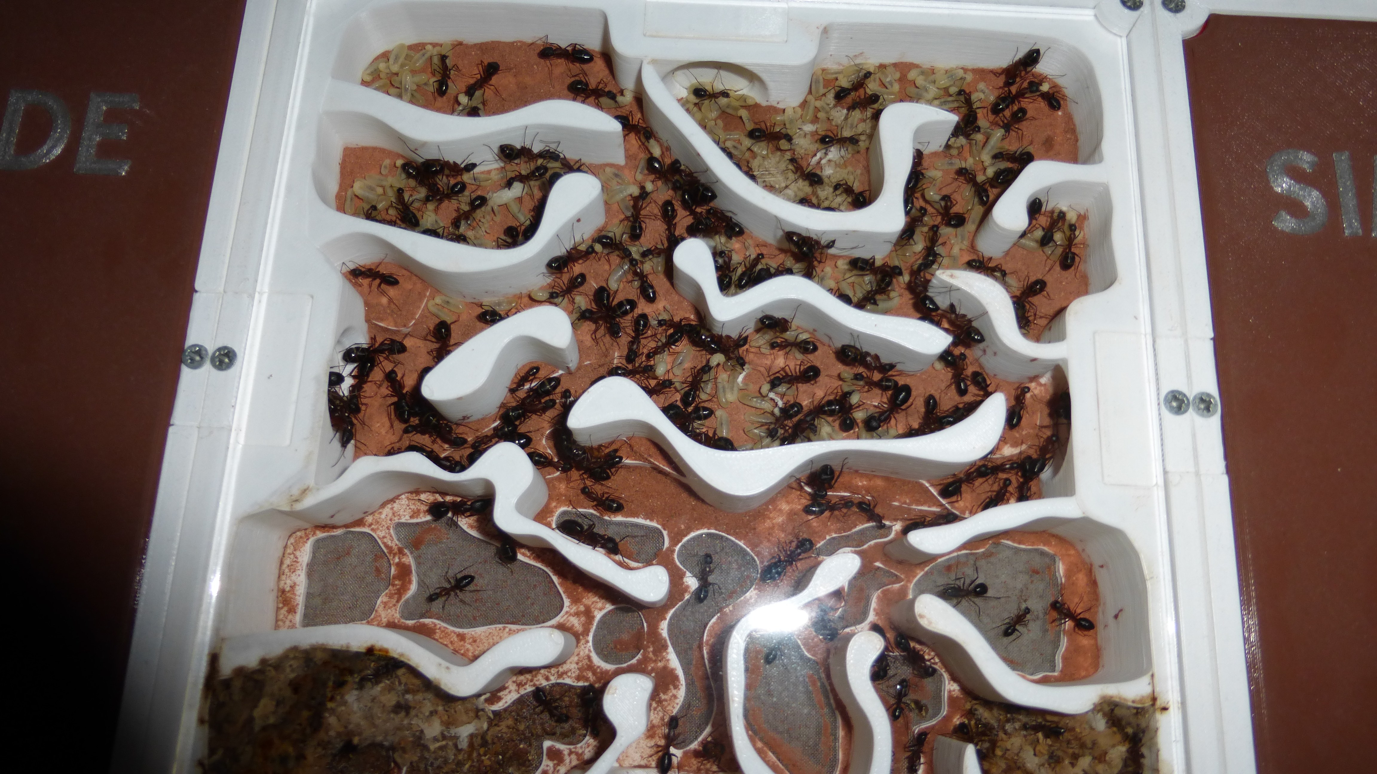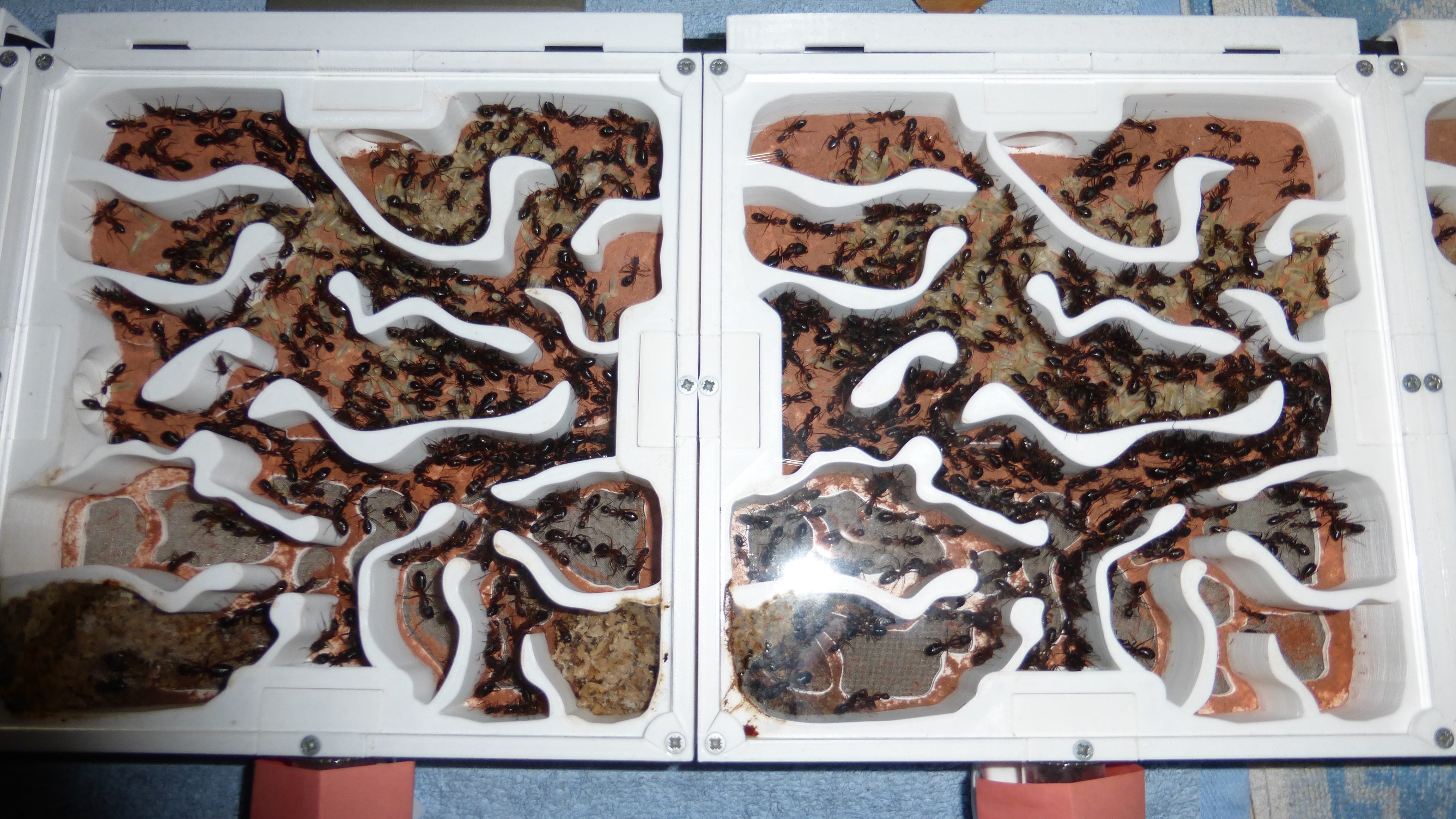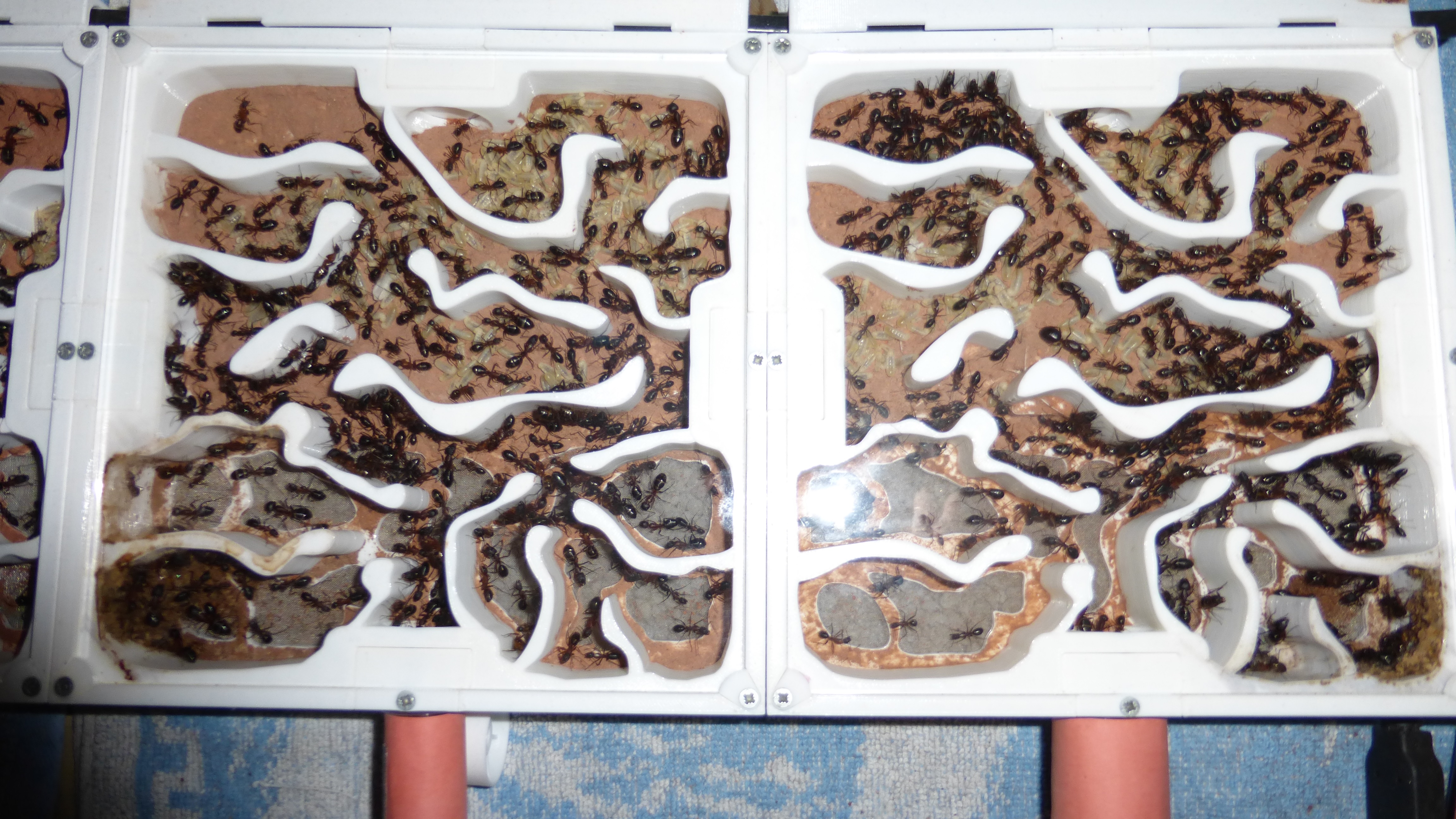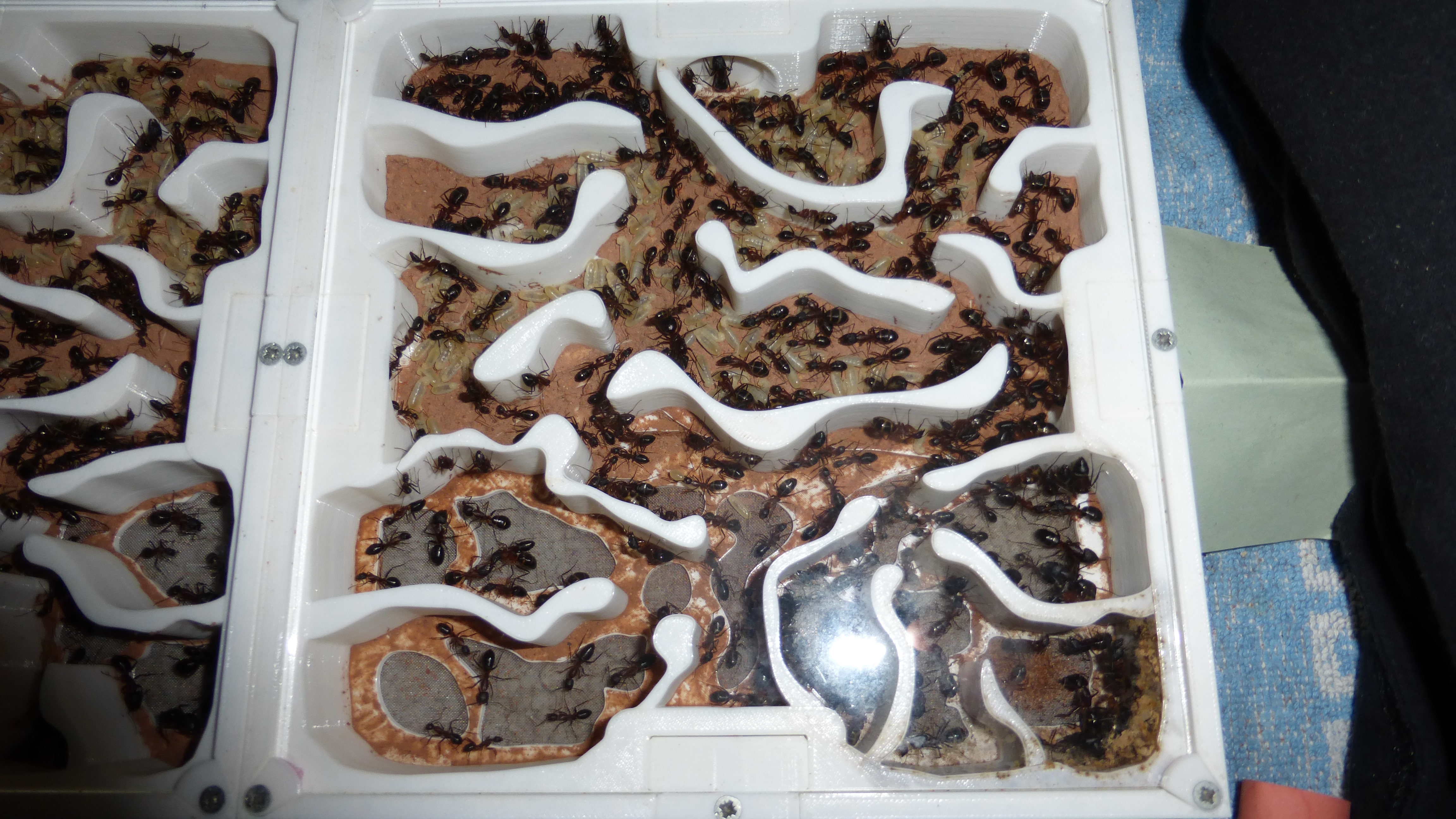 Sieht noch immer ein bisschen leer aus, aber die Königin ist kürzlich ins Nest zurückgezogen und in den Wasser-RGs und einigen Kammern häufen sich Klümpchen kleiner Larven.