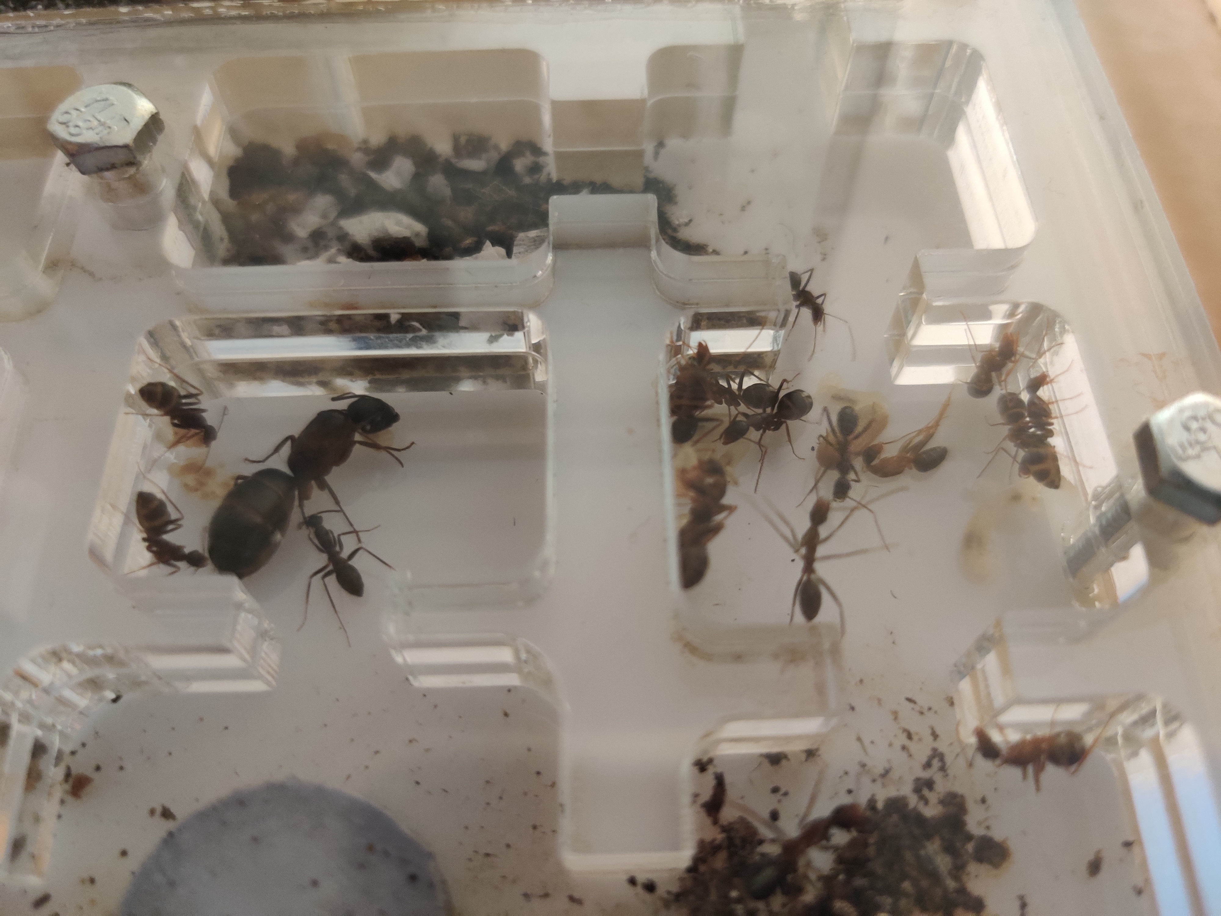 Ich wollte schon vor einer Weile ein Update geben, hatte es aber nicht geschafft. Die Kolonie entwickelt sich recht gut (in meinen Augen) und ist über den Sommer ordentlich gewachsen. Es sind nun insgesamt 18 Arbeiterinnen. Eine ist leider gestorben, aber es könnte sein, dass diese zu den Pygmäen gehört hat (die ja bekanntlich nicht so lange leben). Hier mal ein kleiner Überblick über die Aufteilung in den Kammern.