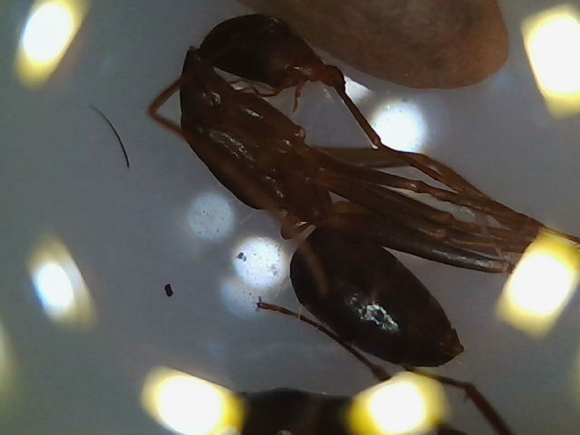 Ich habe noch ein faszinierendes Video gemacht. Dort sieht man, wie die Ameise versucht zu laufen und von einer anderen Arbeiterin unterstützt wird.