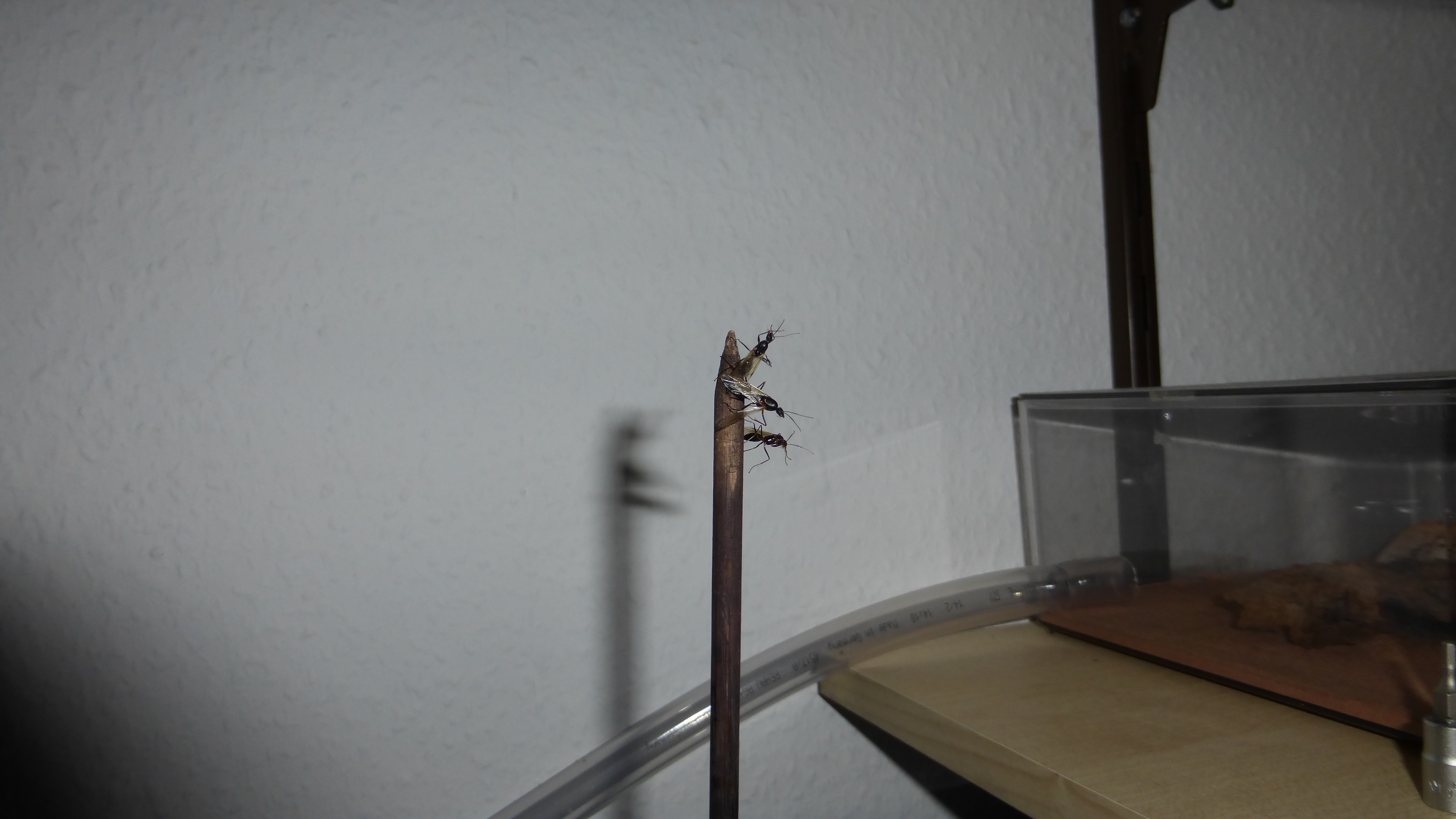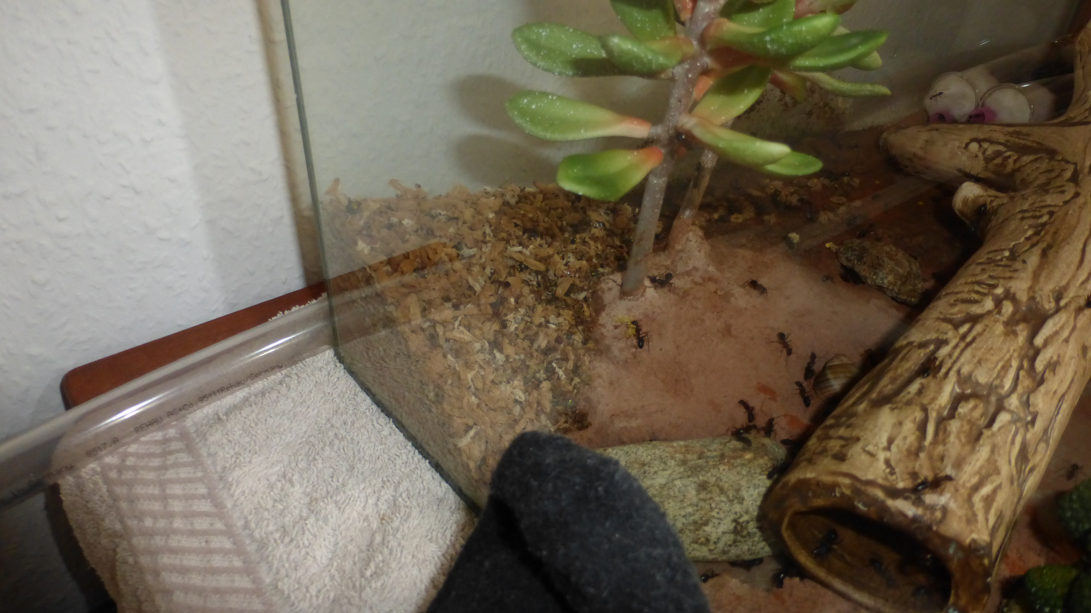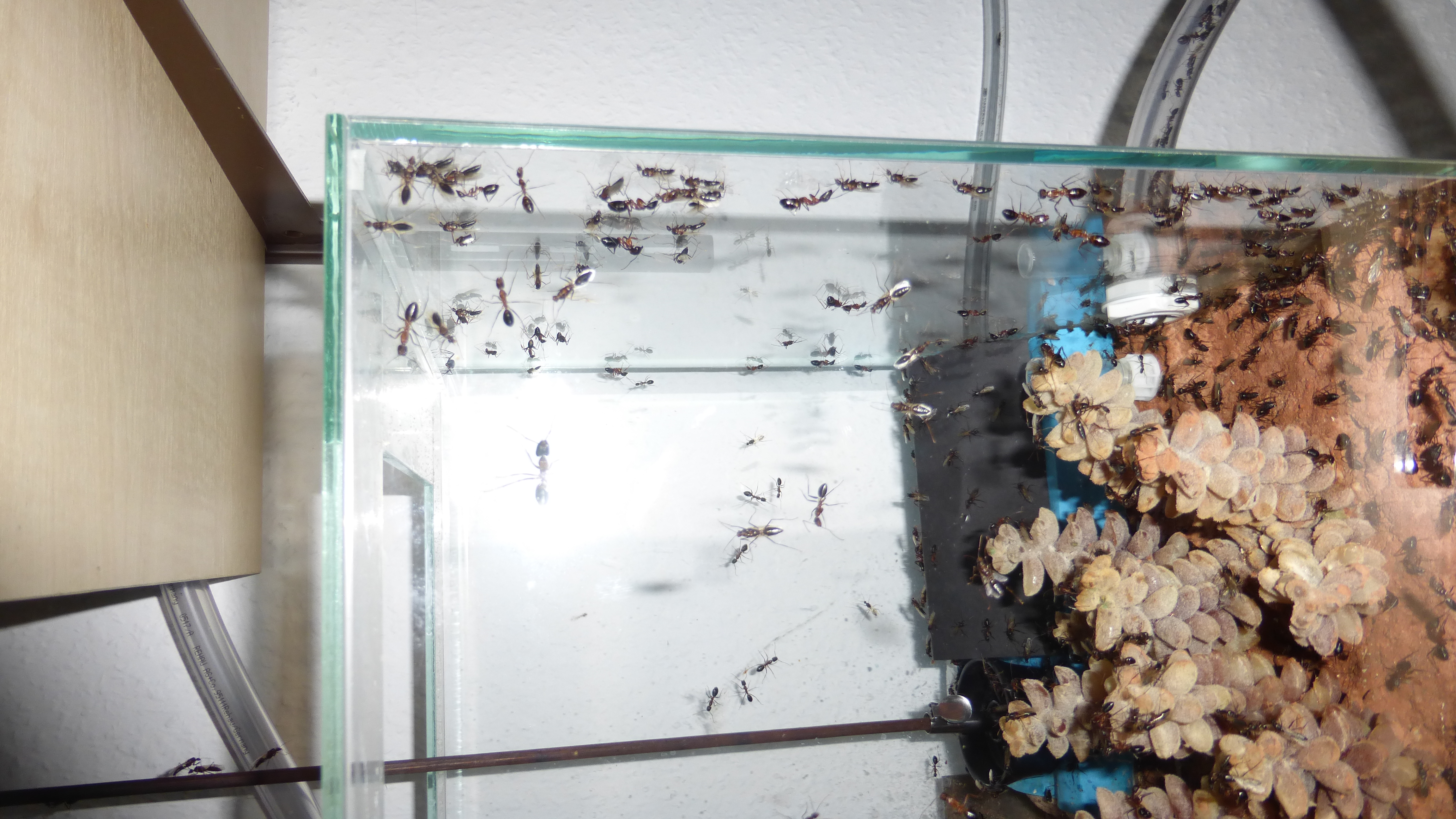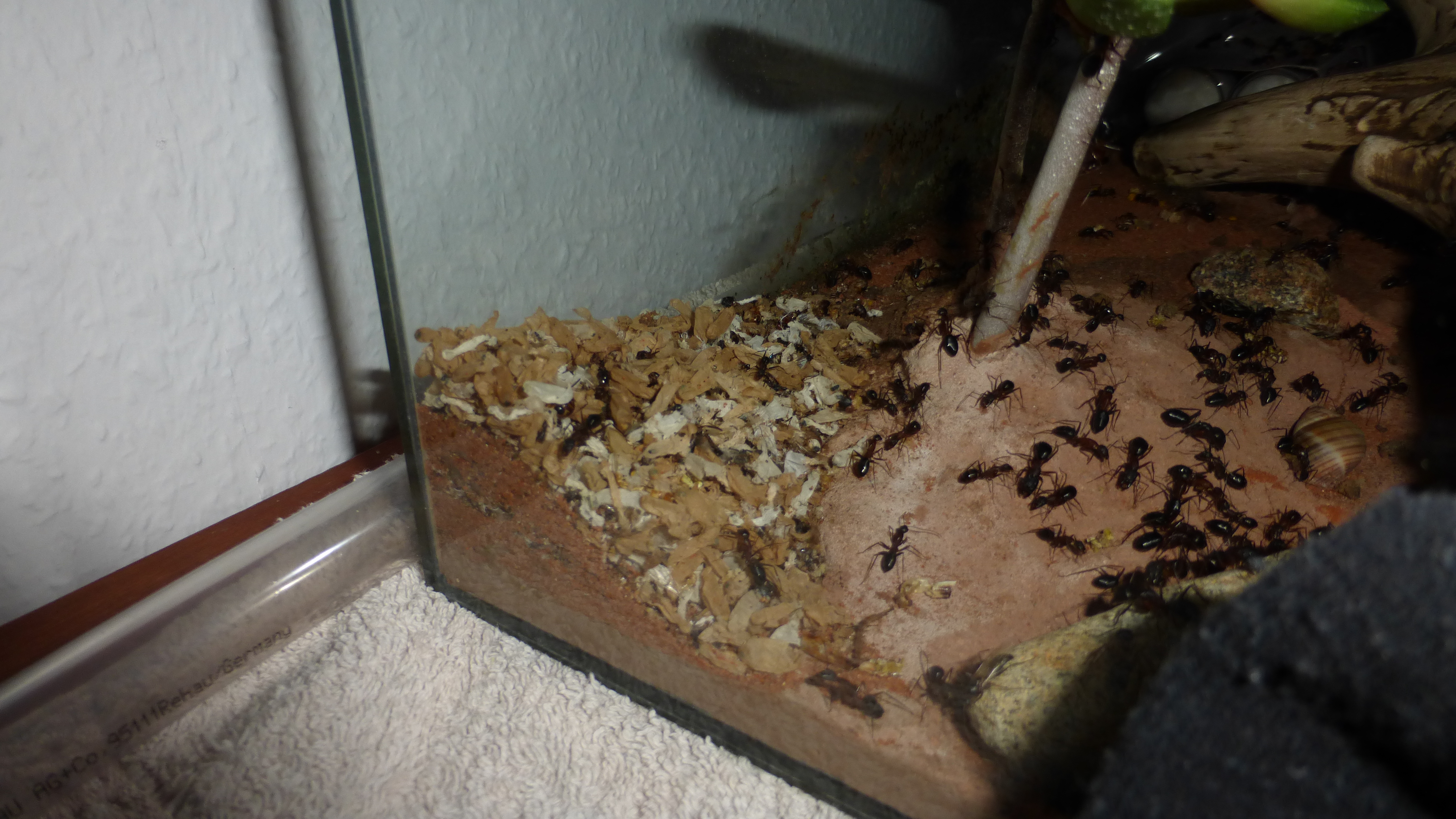 Hier ist ein interessanter Vergleich - Bild 1 zeigt die Ameisen im Becken bei Raumtemperatur, Bild 2 mit aktiver Wärmelampe (die hängt über der unteren rechten Ecke, ich schalte die so zweimal in der Woche für ne halbe Stunde an, um ein Minimum an winterlichem Sonnenschein zu simulieren.