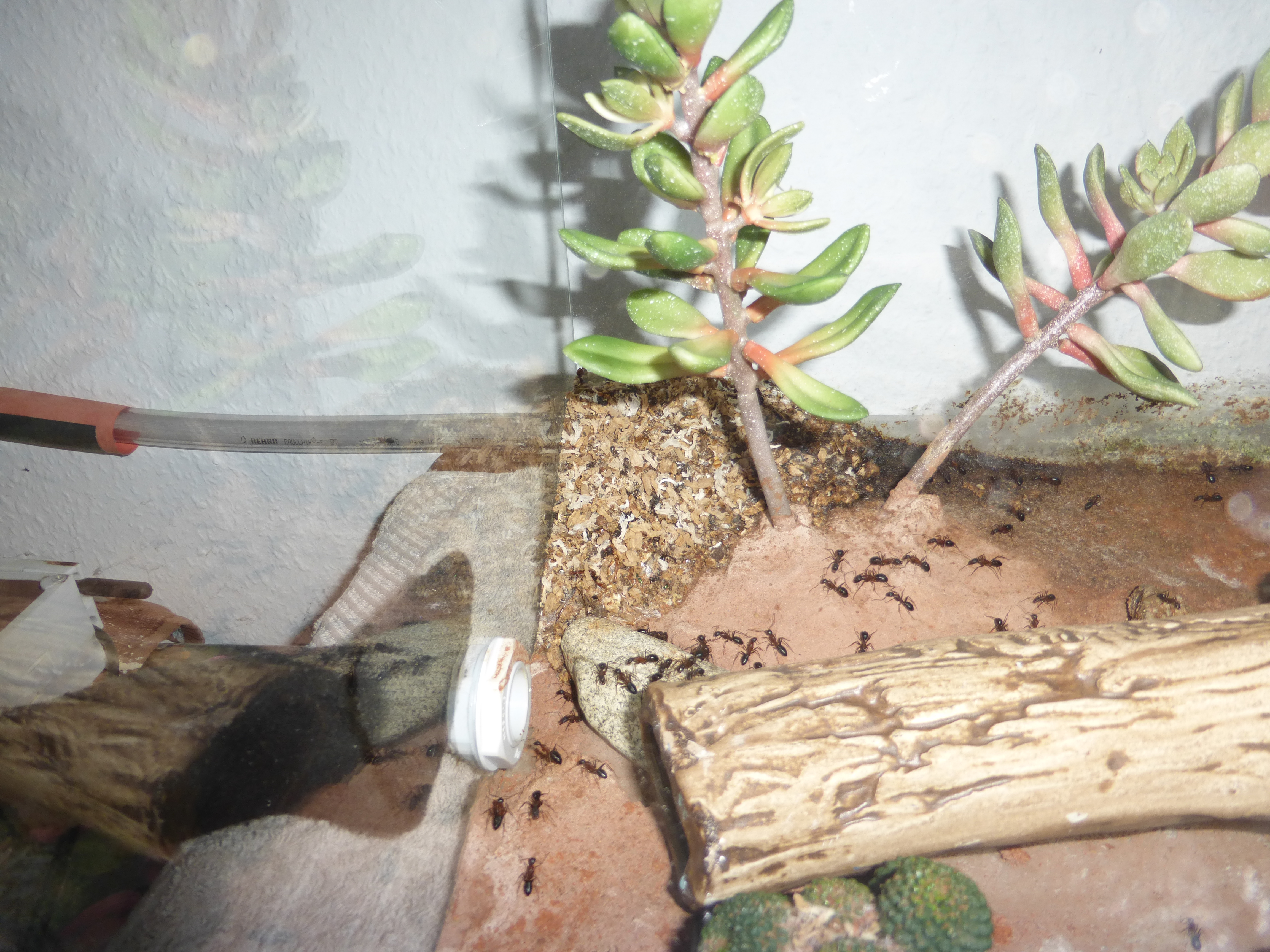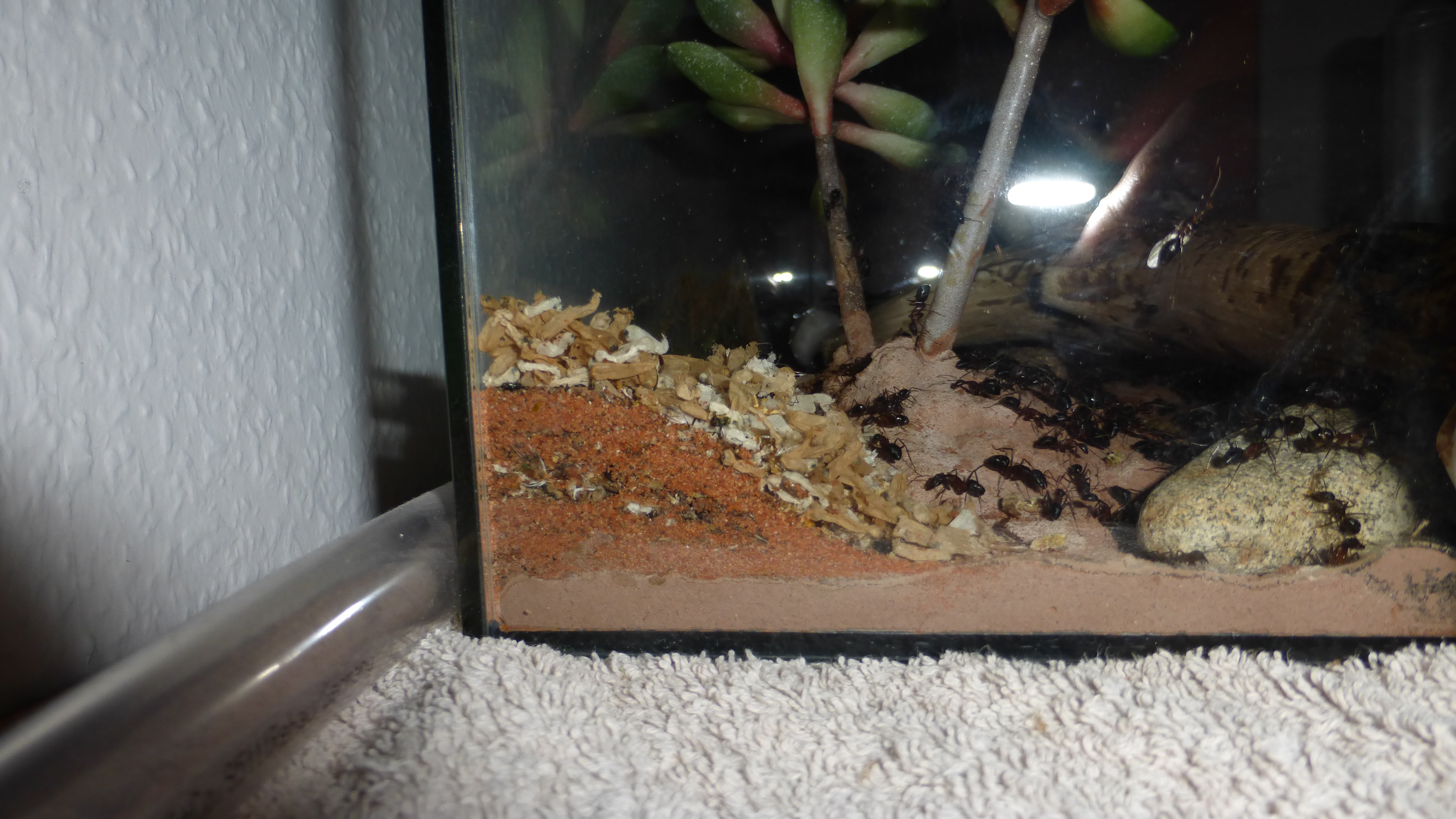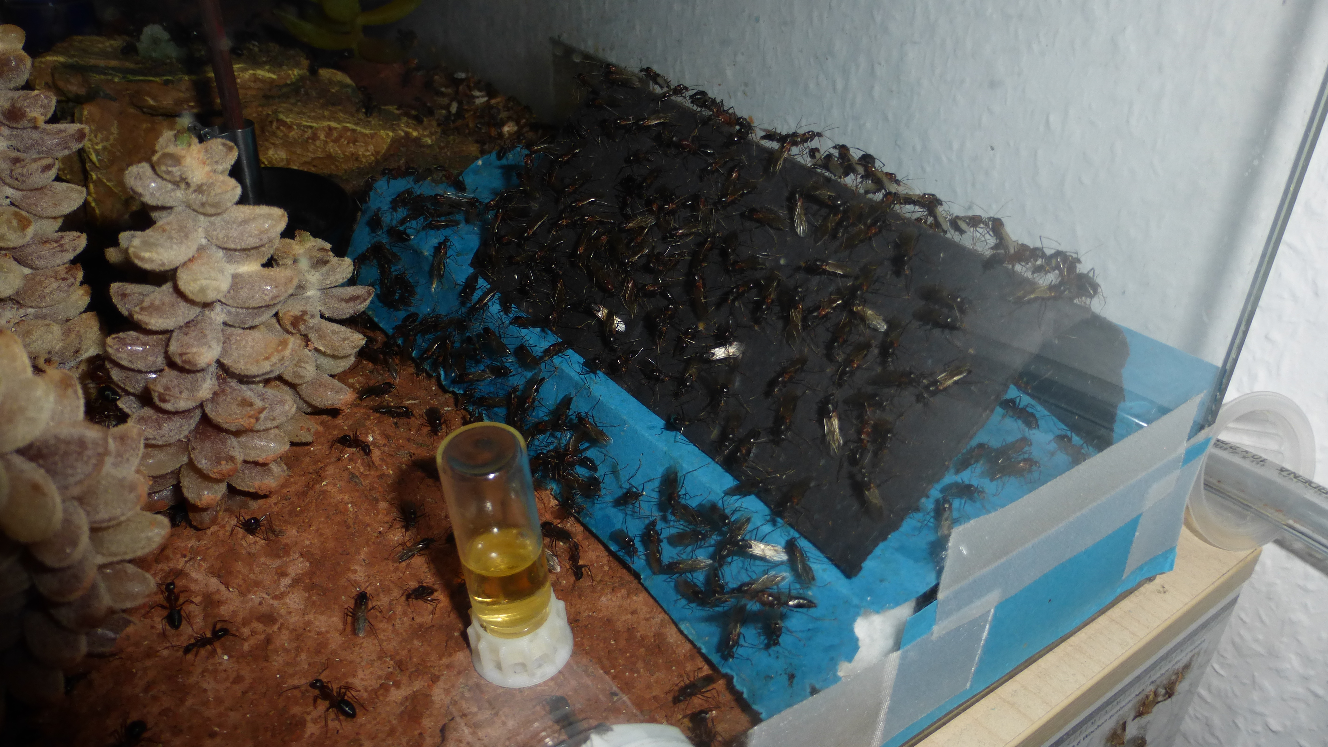 Hier ist ein interessanter Vergleich - Bild 1 zeigt die Ameisen im Becken bei Raumtemperatur, Bild 2 mit aktiver Wärmelampe (die hängt über der unteren rechten Ecke, ich schalte die so zweimal in der Woche für ne halbe Stunde an, um ein Minimum an winterlichem Sonnenschein zu simulieren.