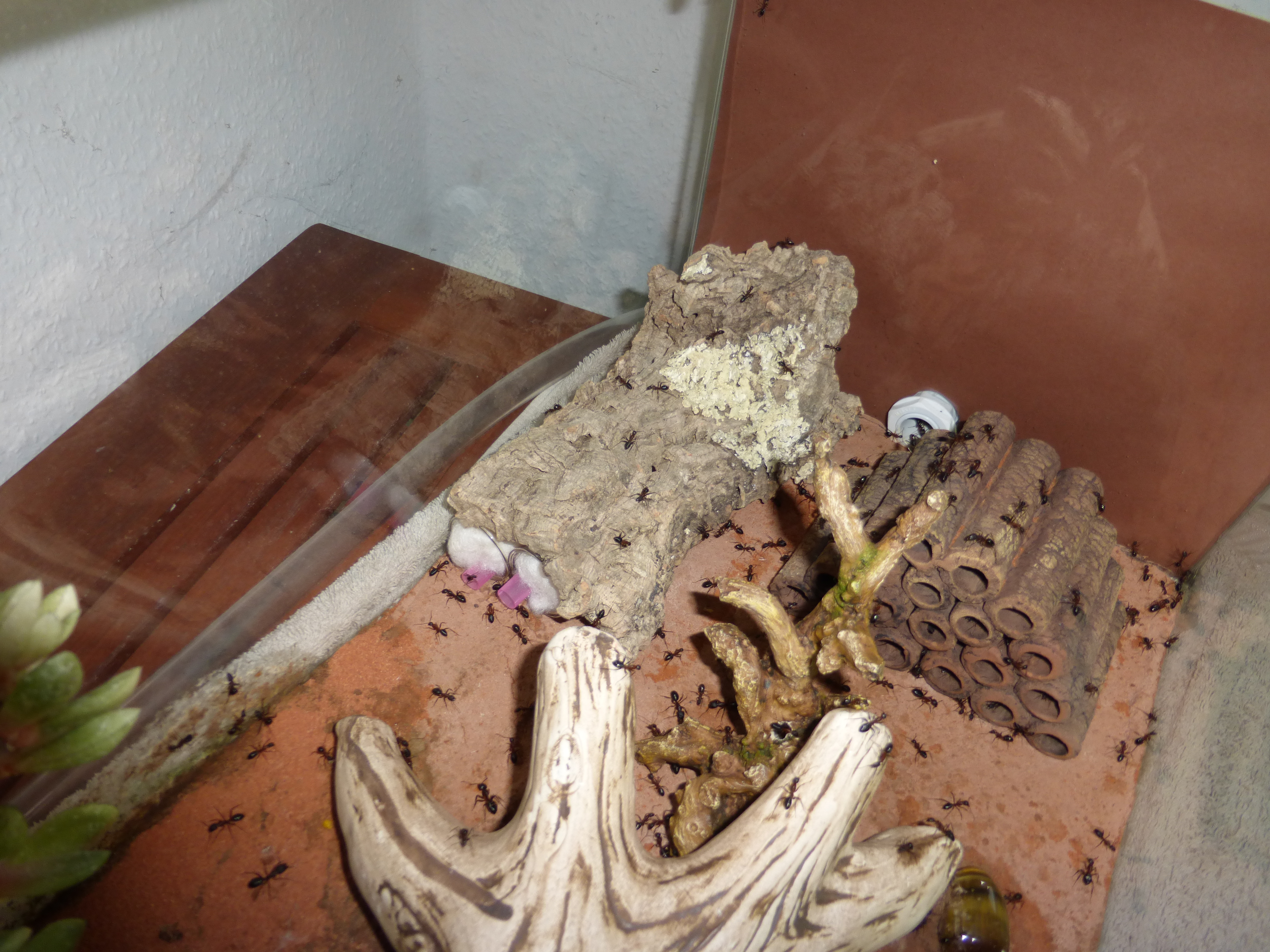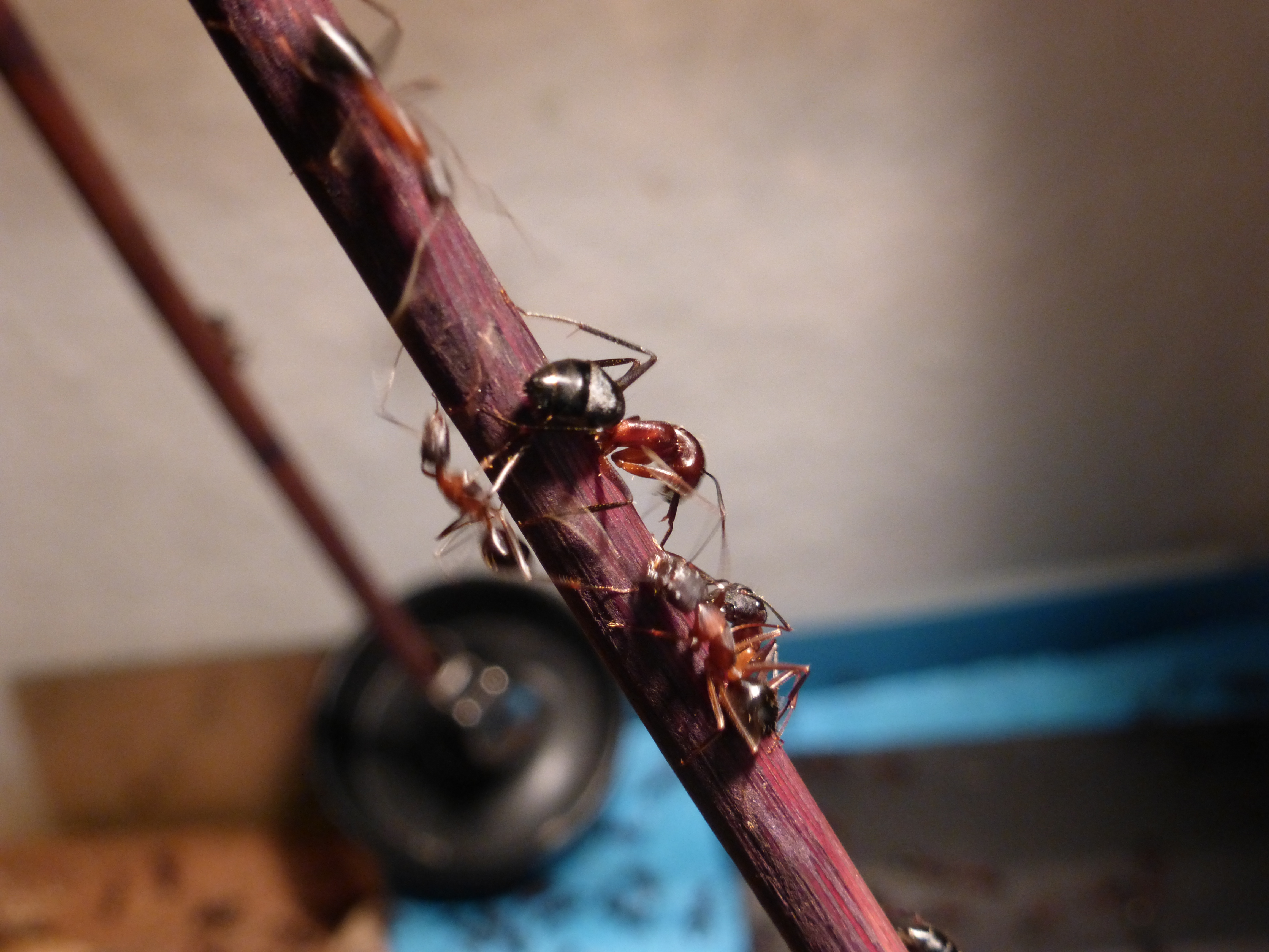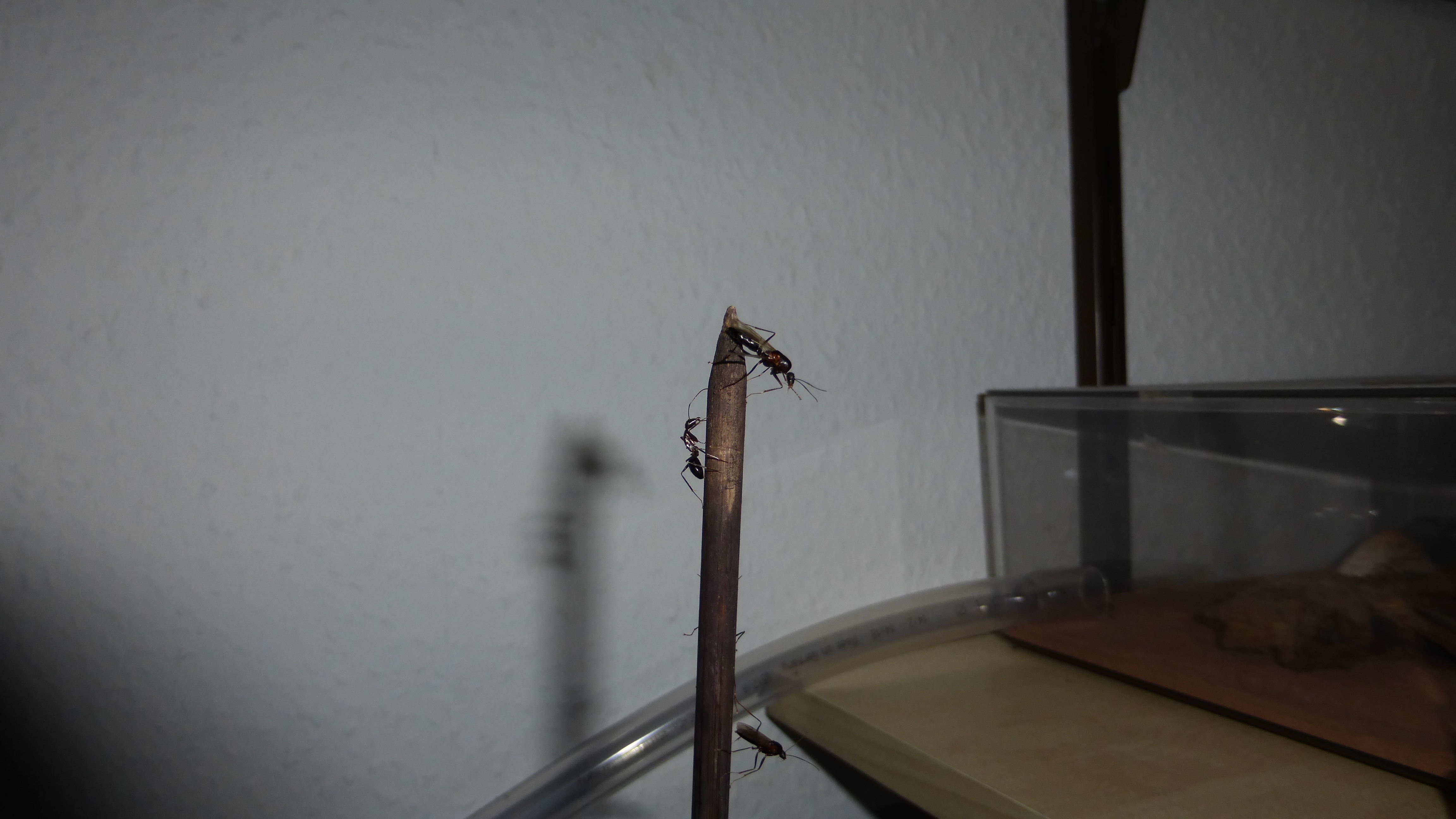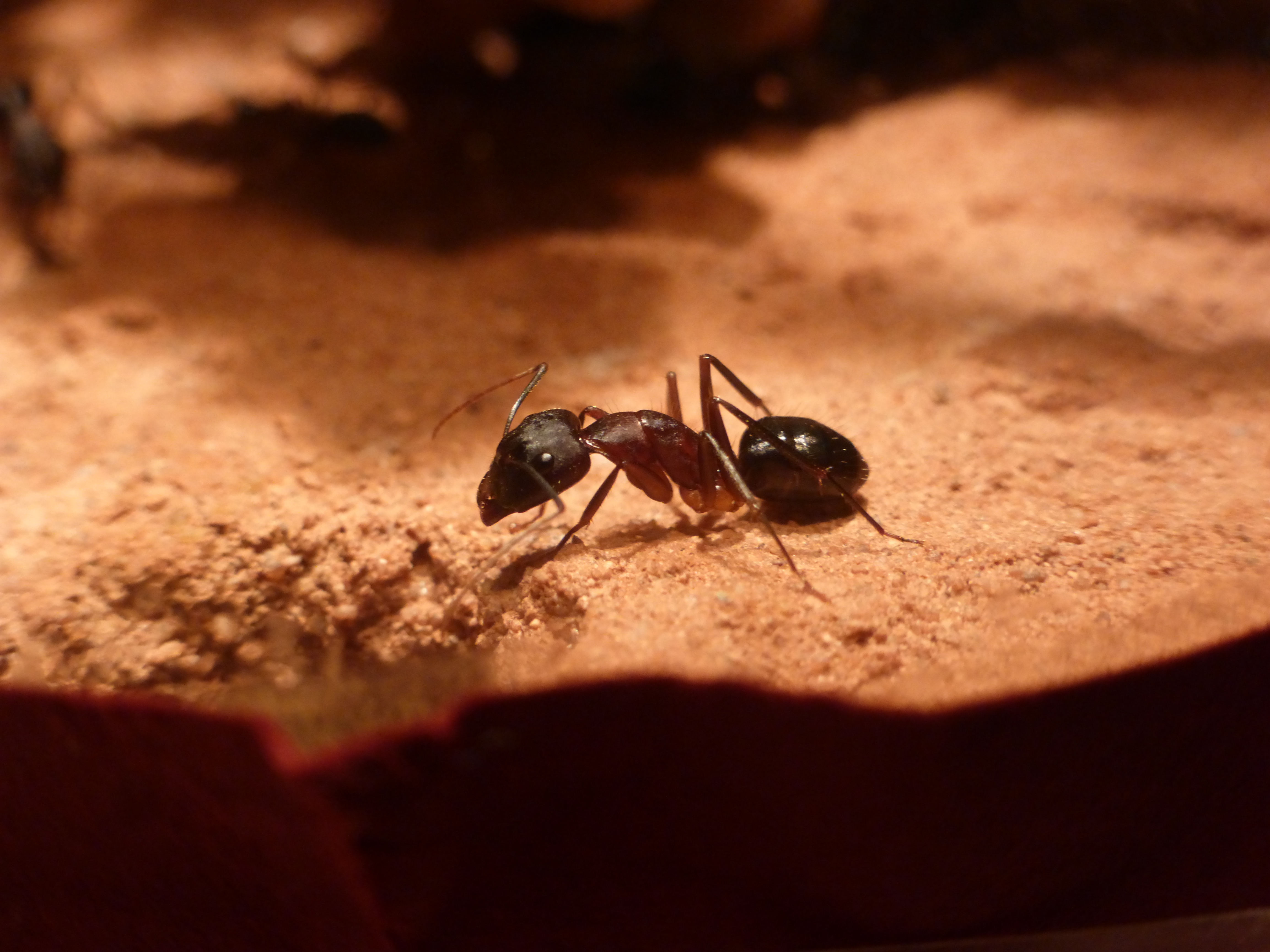 Hier ist ein interessanter Vergleich - Bild 1 zeigt die Ameisen im Becken bei Raumtemperatur, Bild 2 mit aktiver Wärmelampe (die hängt über der unteren rechten Ecke, ich schalte die so zweimal in der Woche für ne halbe Stunde an, um ein Minimum an winterlichem Sonnenschein zu simulieren.