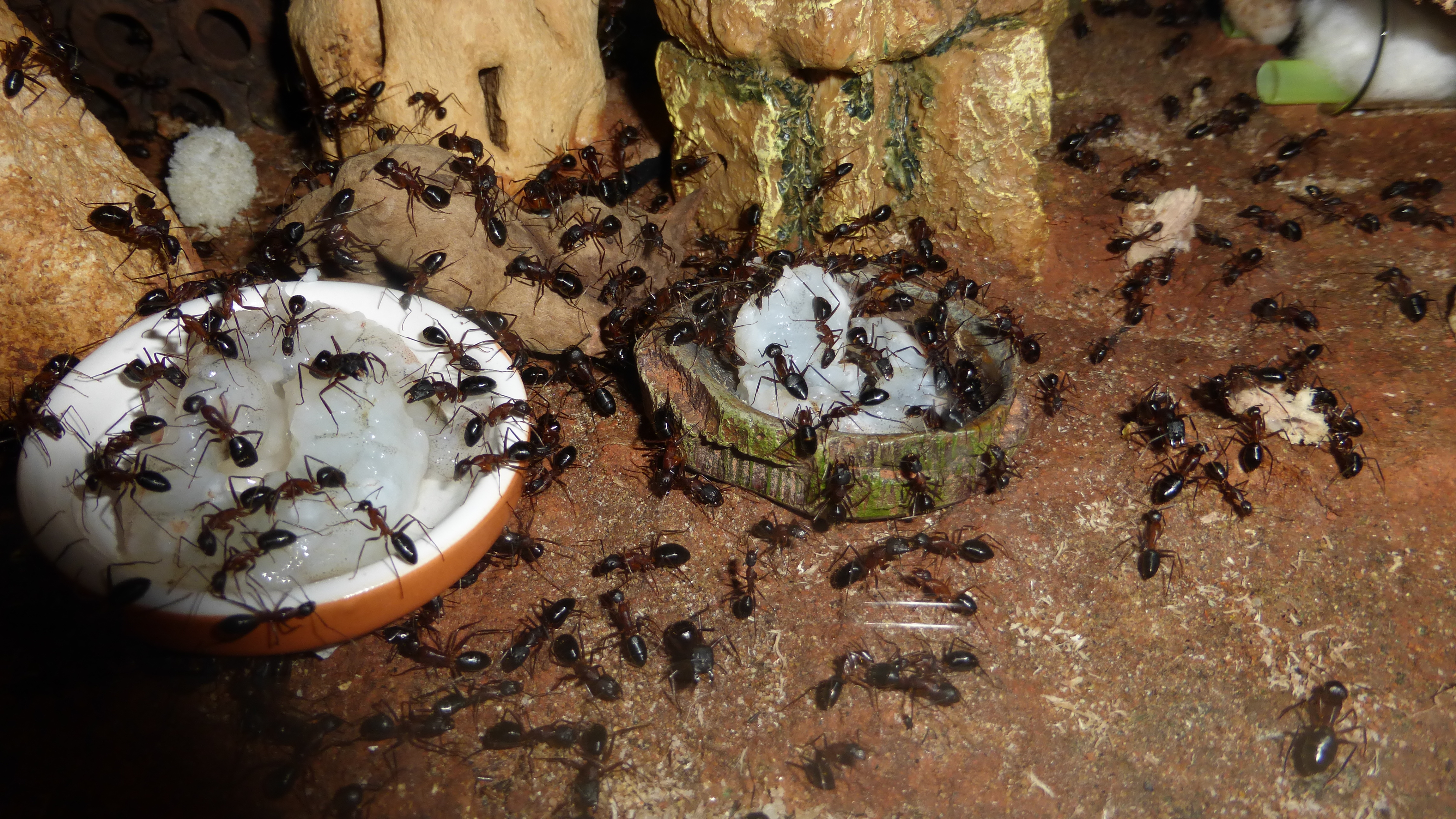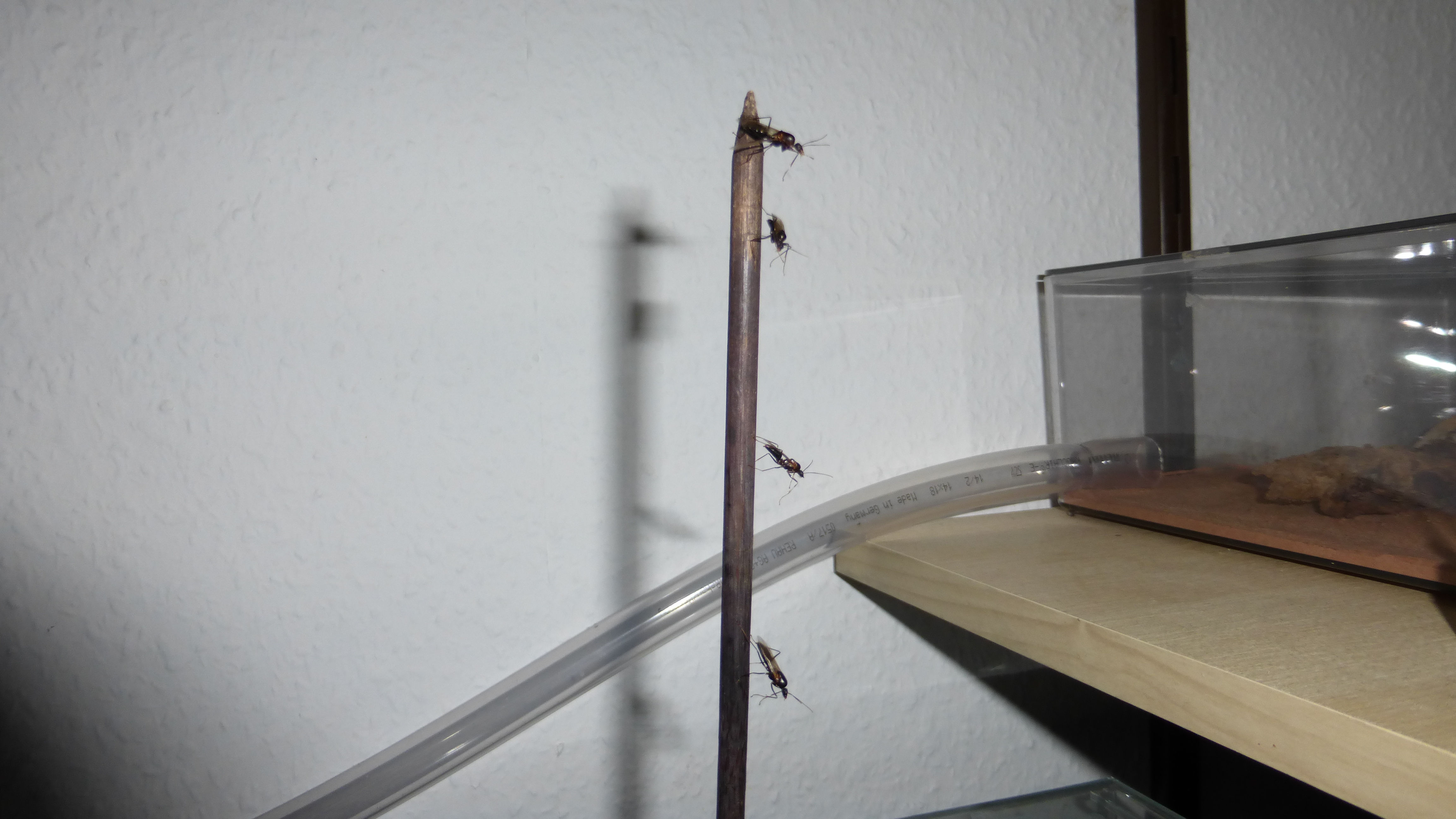 Viel ist nicht los, sie sind recht inaktiv und essen/trinken nicht viel. FĂĽr den kleinen Zuckerspender hier im Becken brauchen sie 3-4 Tage.