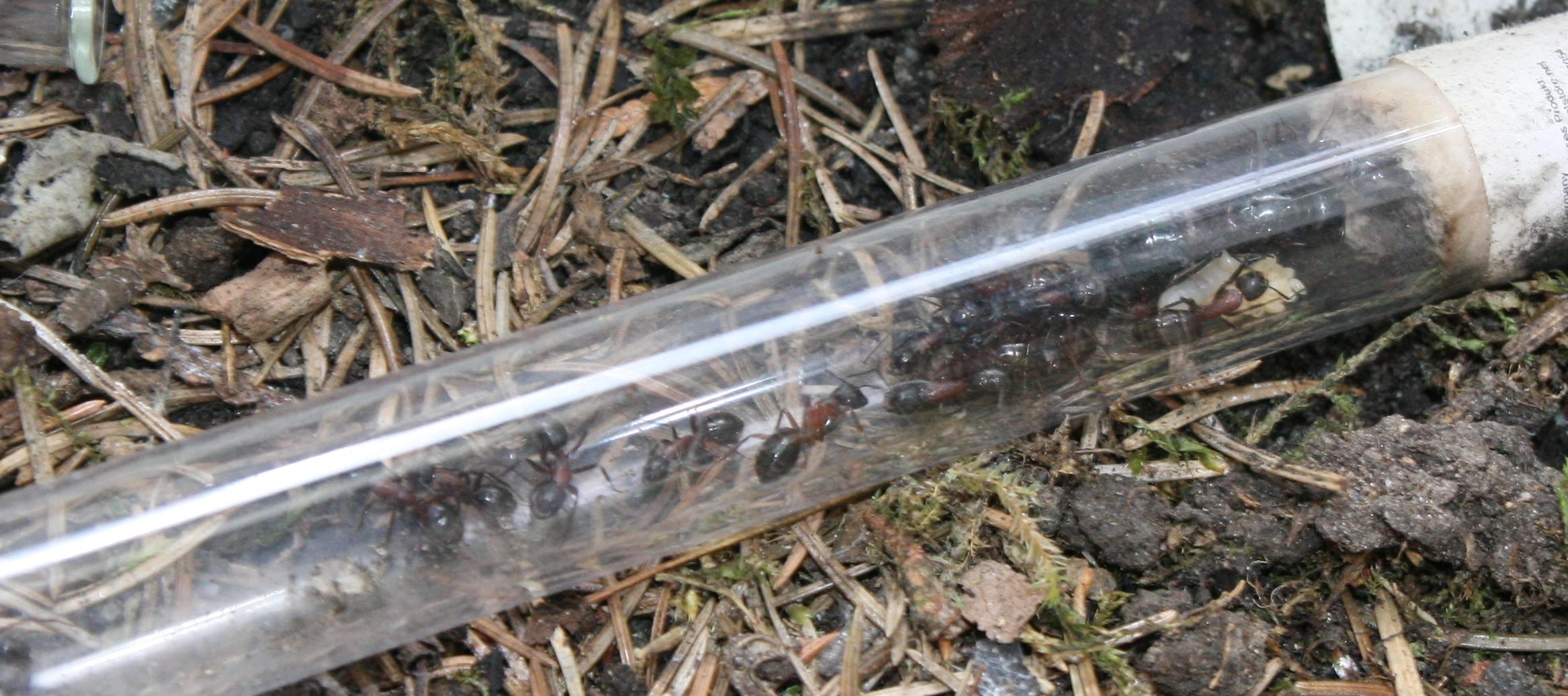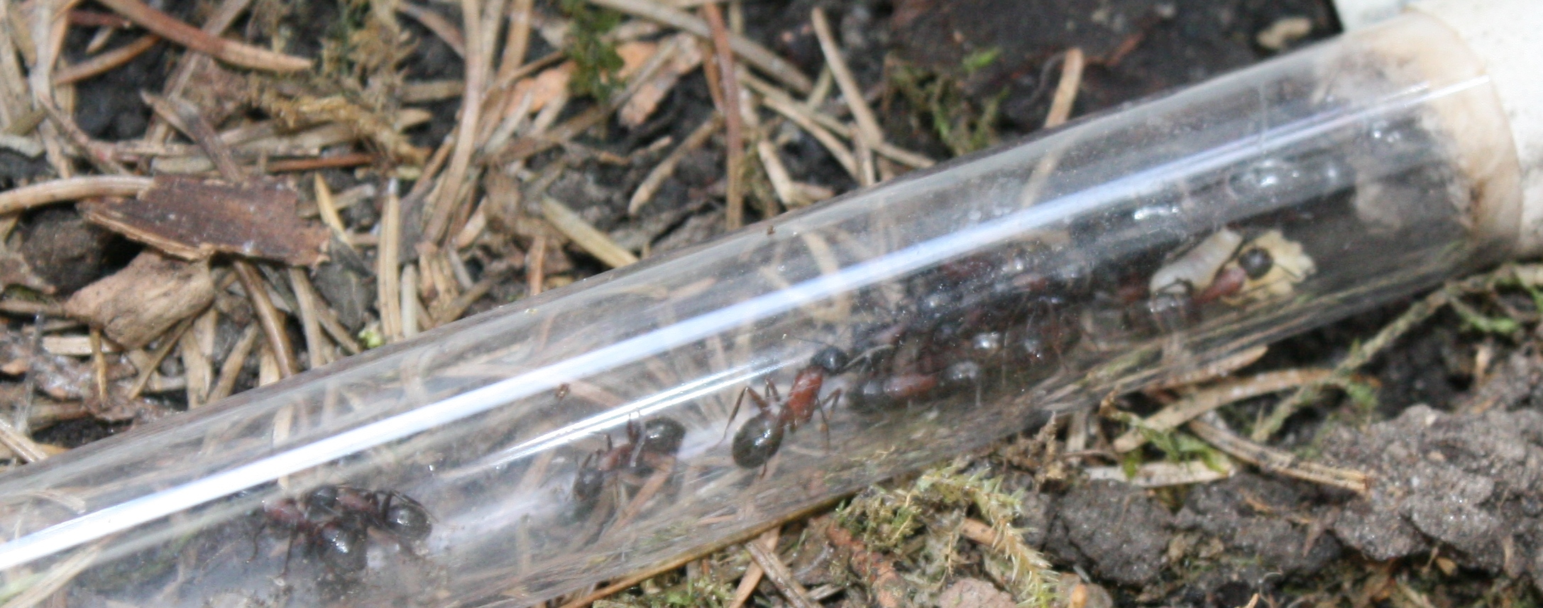 Tante Edit sagt: Die Gyne saß gerade im Nest, eine große Larve und viele kleine wurden auch schon hinein geschleppt. Allerdings sind sich die Arbeiterinnen nicht einig, was das Nest betrifft! So wurde die Gyne gerade wieder zum Reagenzglas gezogen, wĂ€hrend andere versuchen sie wieder zurĂŒck zu treiben.... Es wird spannend, wo die kleine Kolonie morgen sitzt!