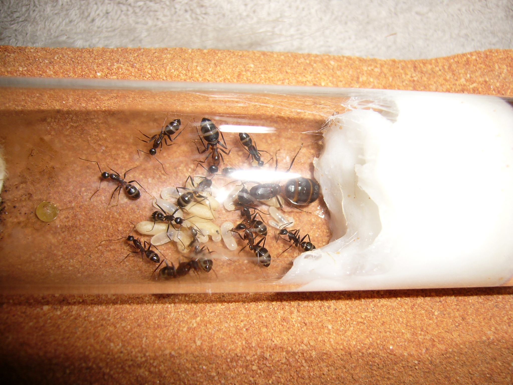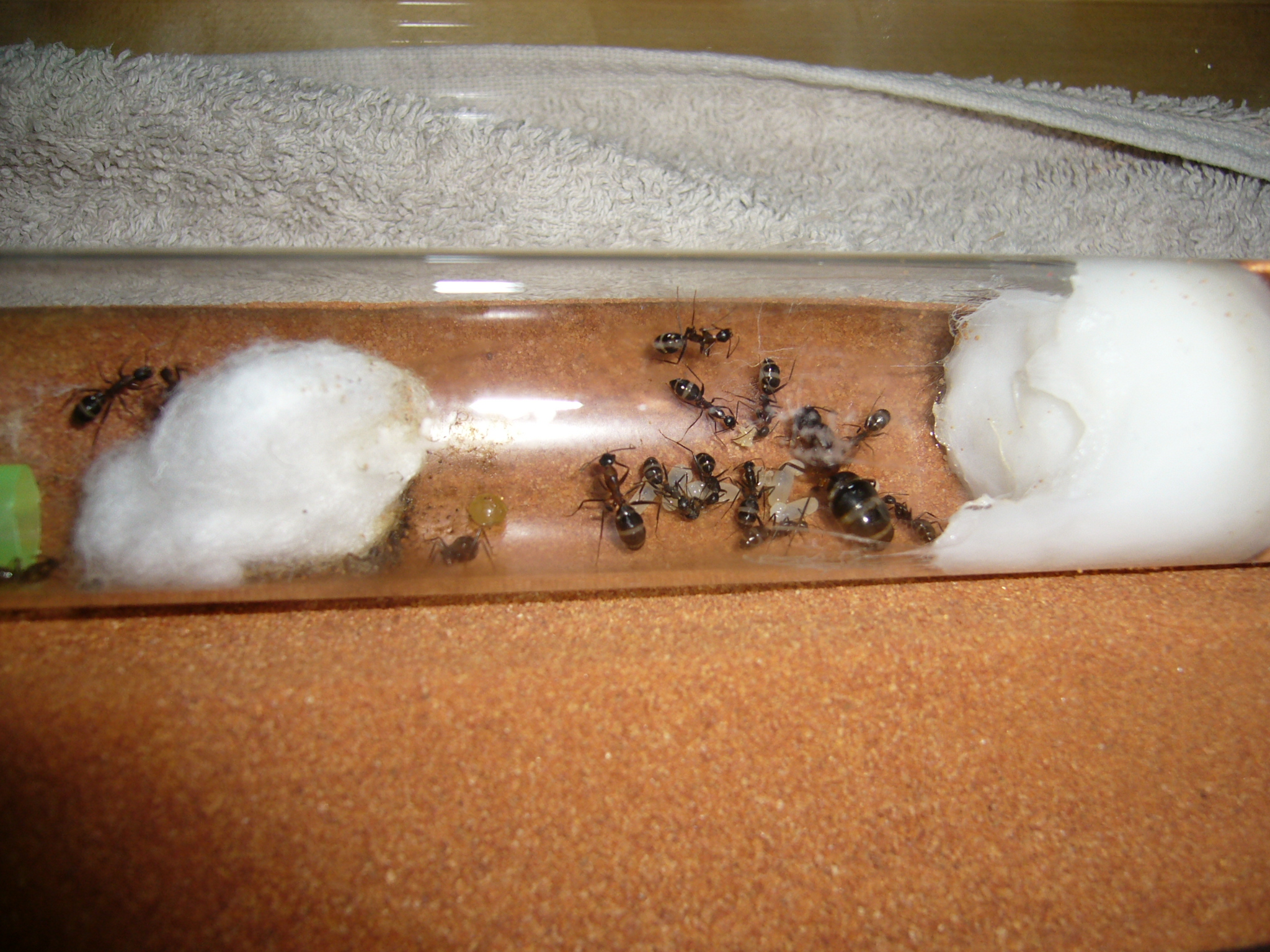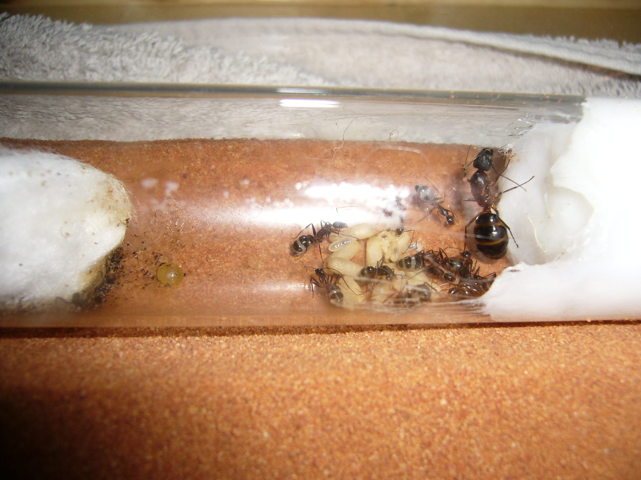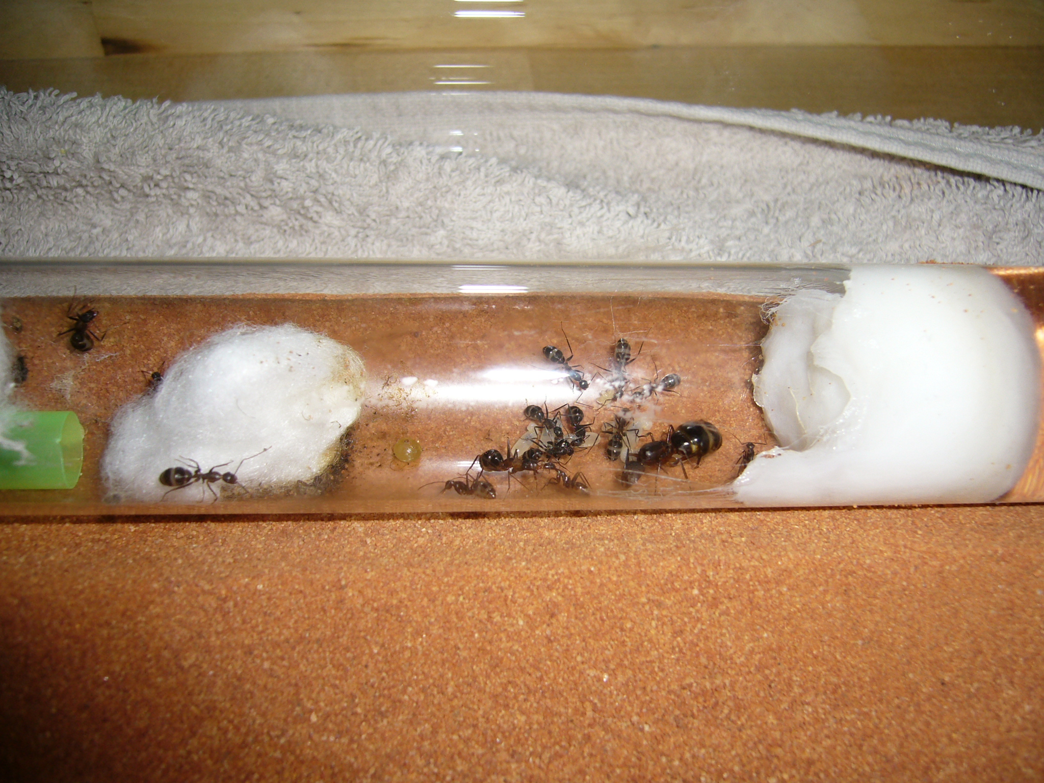 Wollte ihnen ein neues Glas anbieten, das war aber nicht ganz dicht und der gesamte Inhalt (30x200mm RG) floss in die Arena. Hat zwei Tage mit der Wärmelampe gebraucht um die Luftfeuchtigkeit von 70% auf den Normalwert von 40-50% runterzubekommen. Die Ameisen hats nicht gestört.