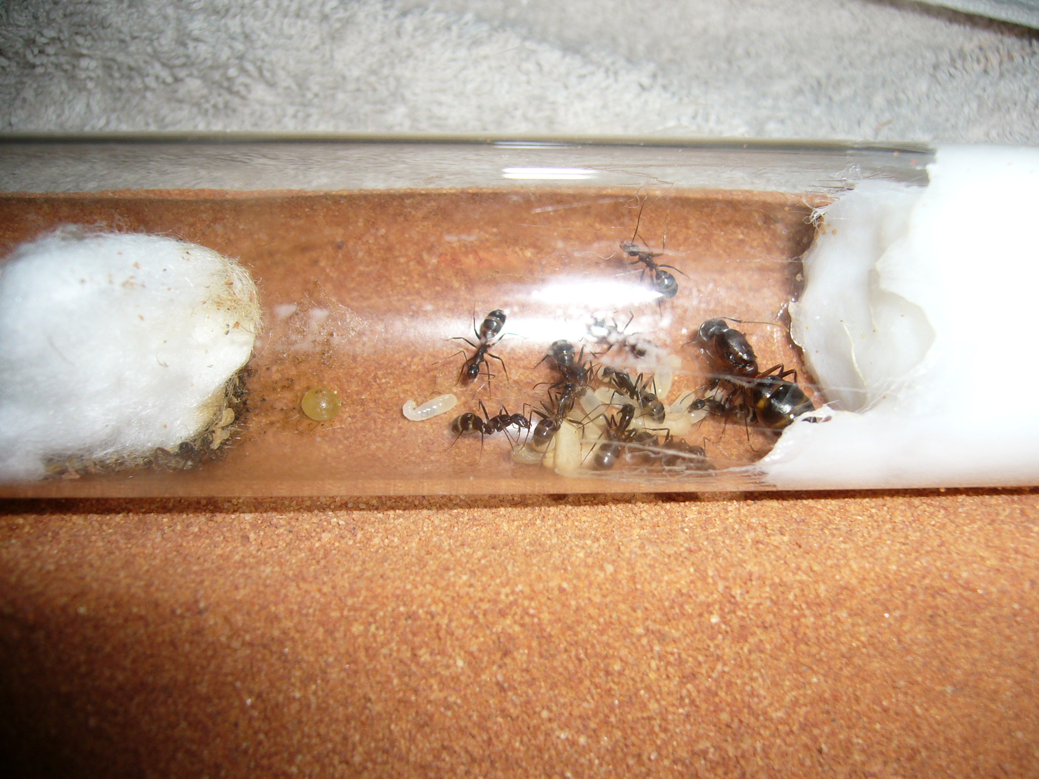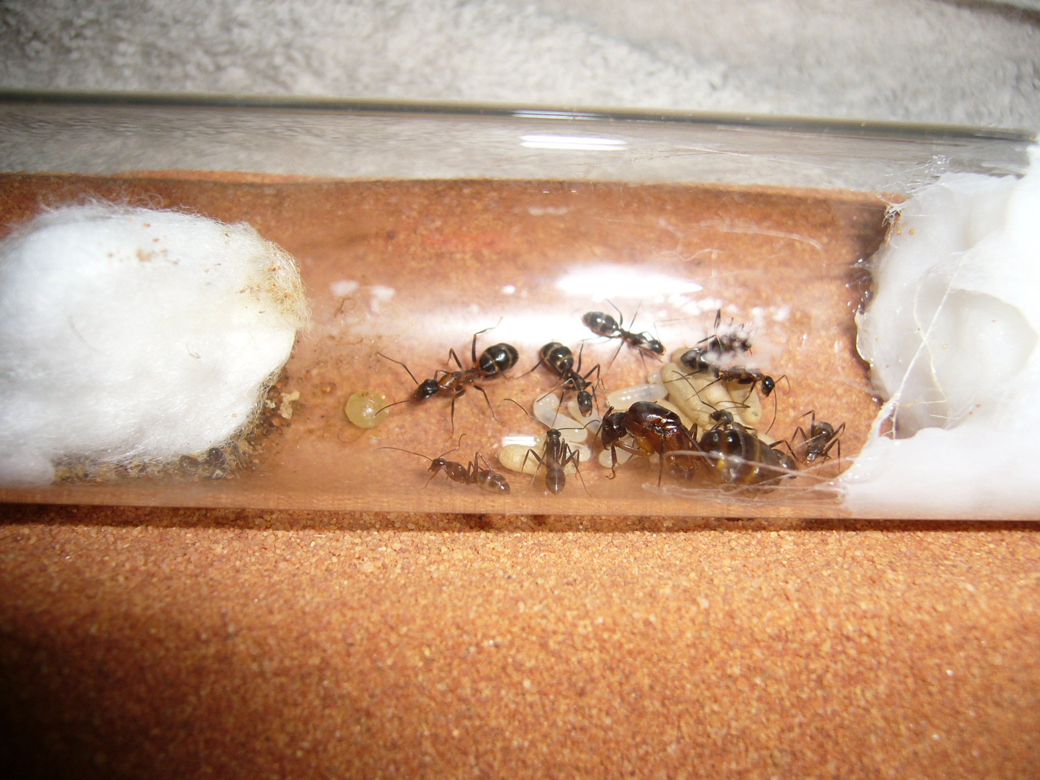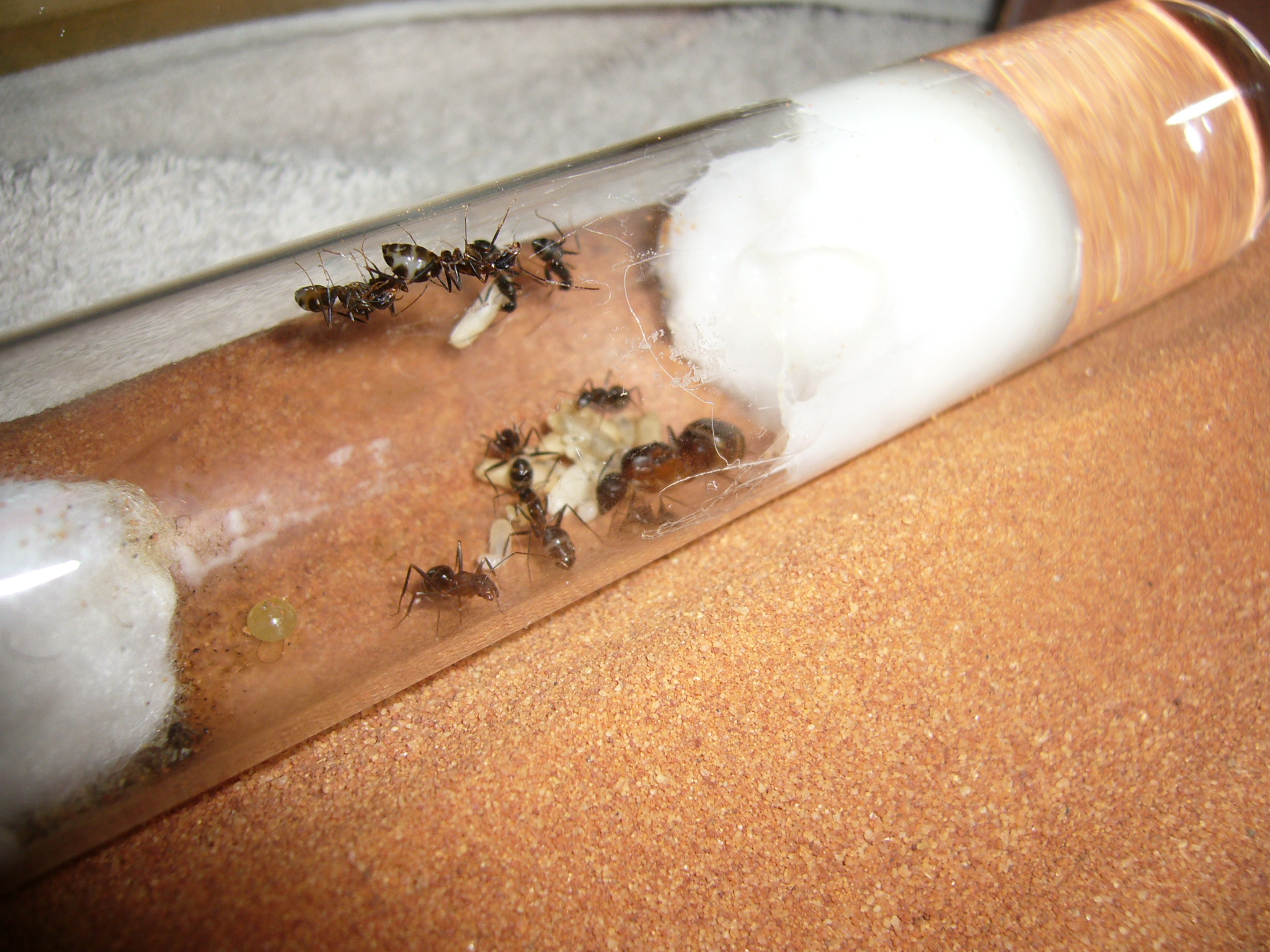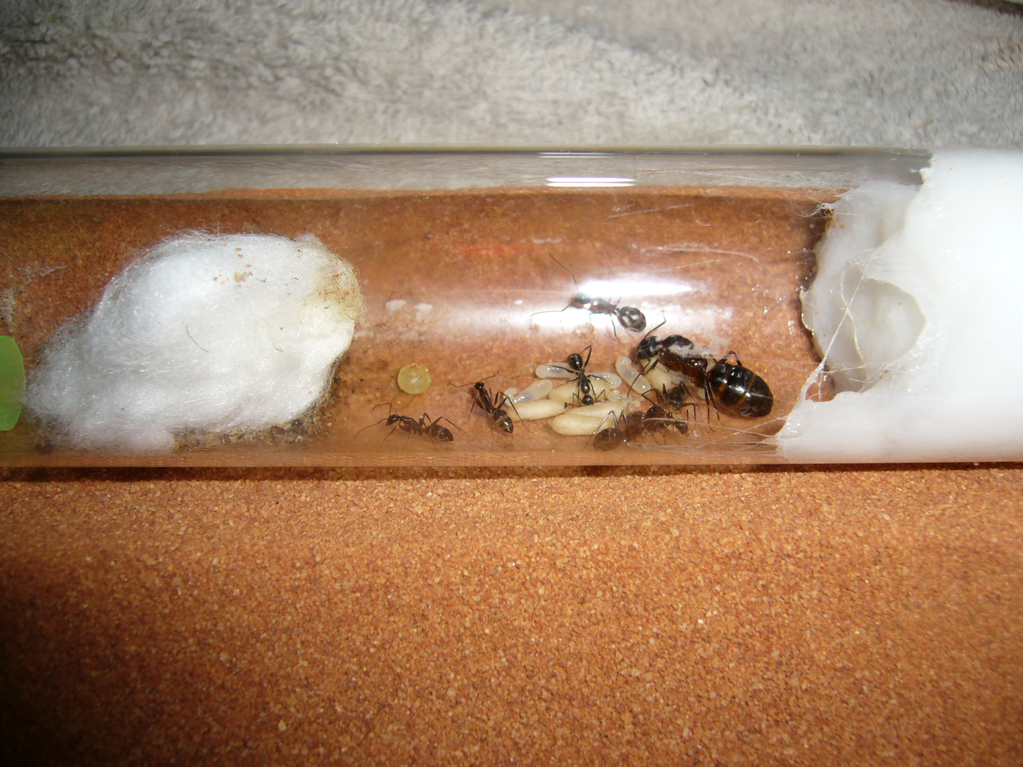Wollte ihnen ein neues Glas anbieten, das war aber nicht ganz dicht und der gesamte Inhalt (30x200mm RG) floss in die Arena. Hat zwei Tage mit der Wärmelampe gebraucht um die Luftfeuchtigkeit von 70% auf den Normalwert von 40-50% runterzubekommen. Die Ameisen hats nicht gestört.
