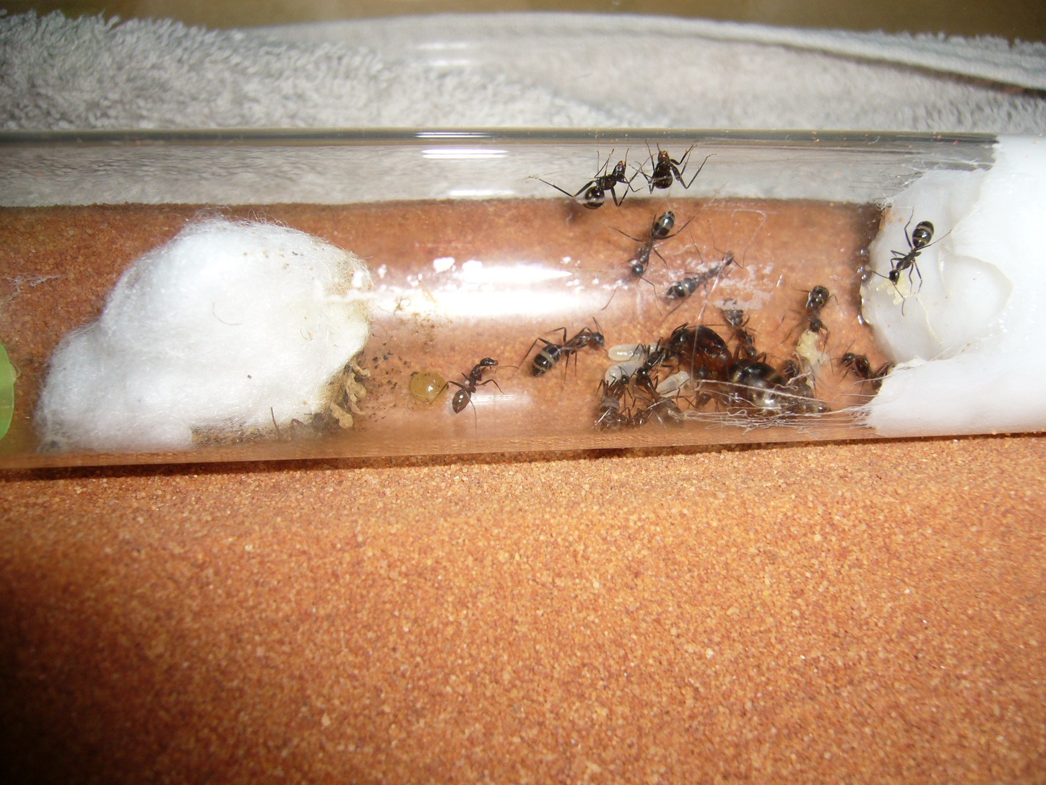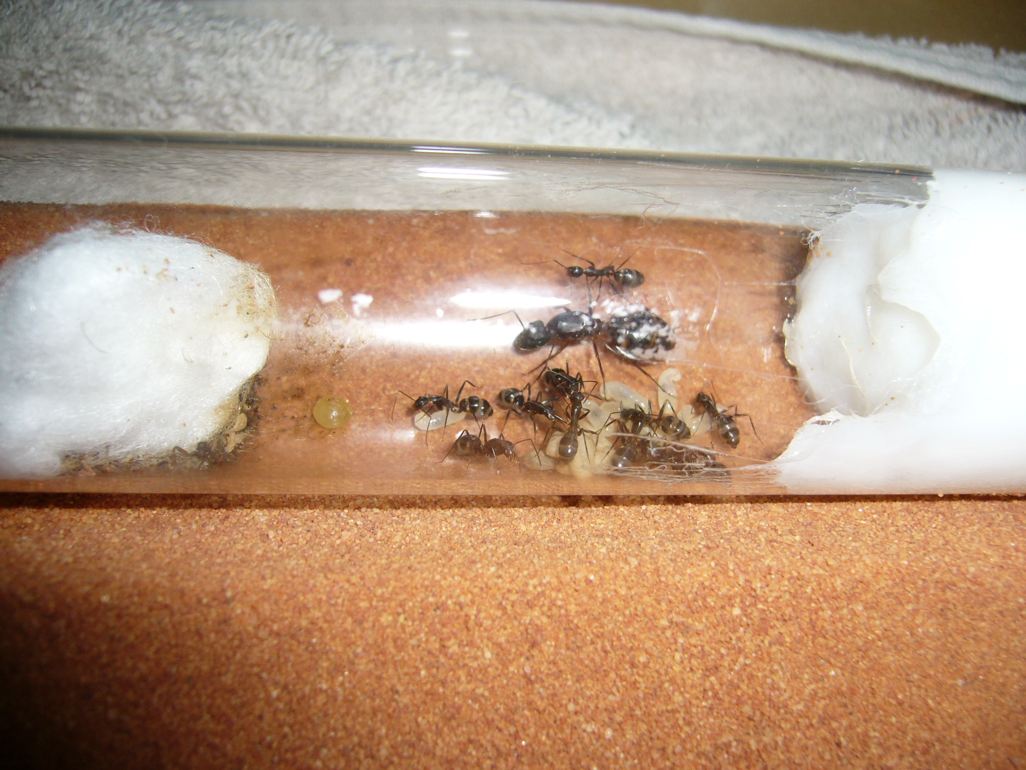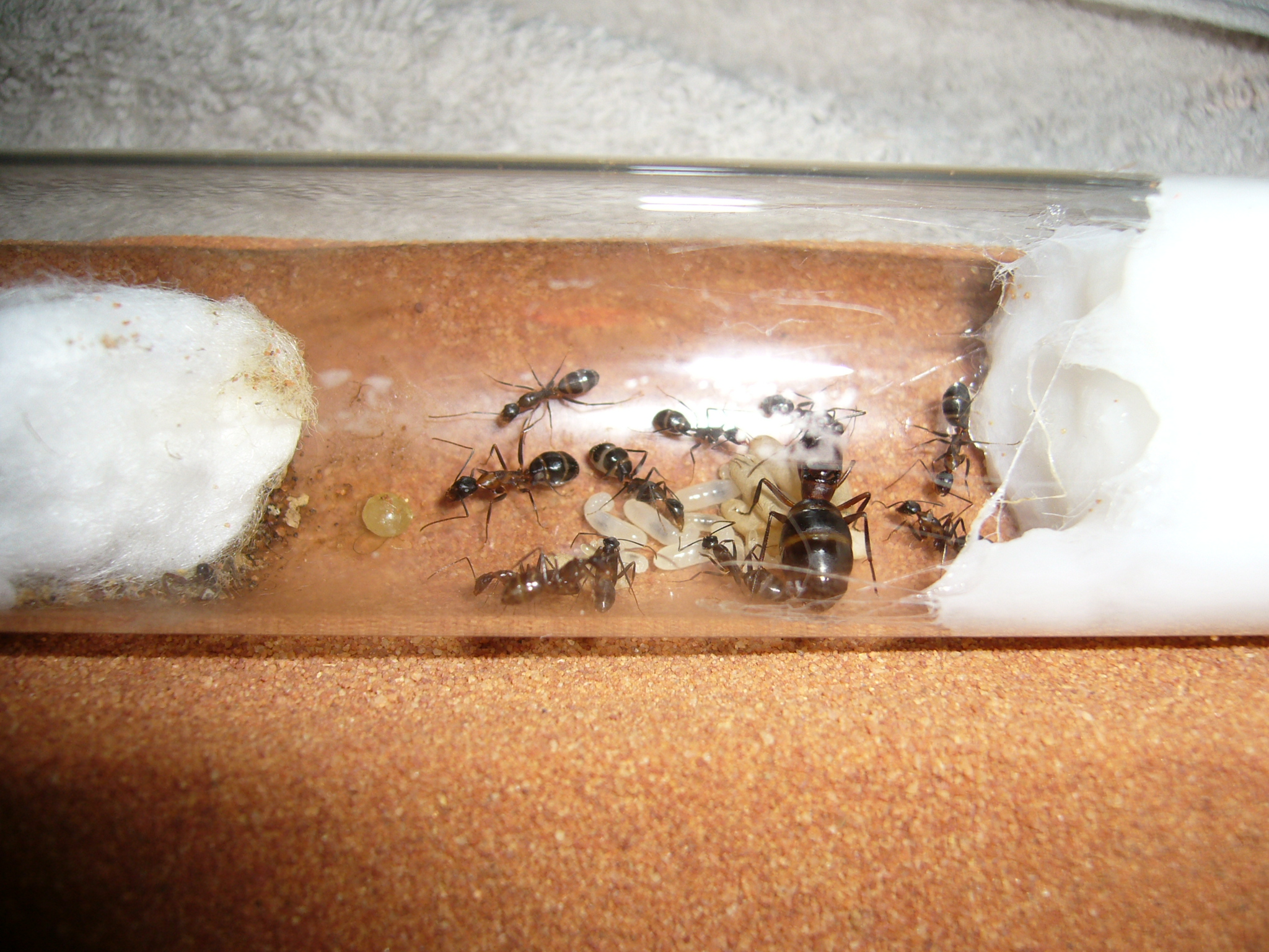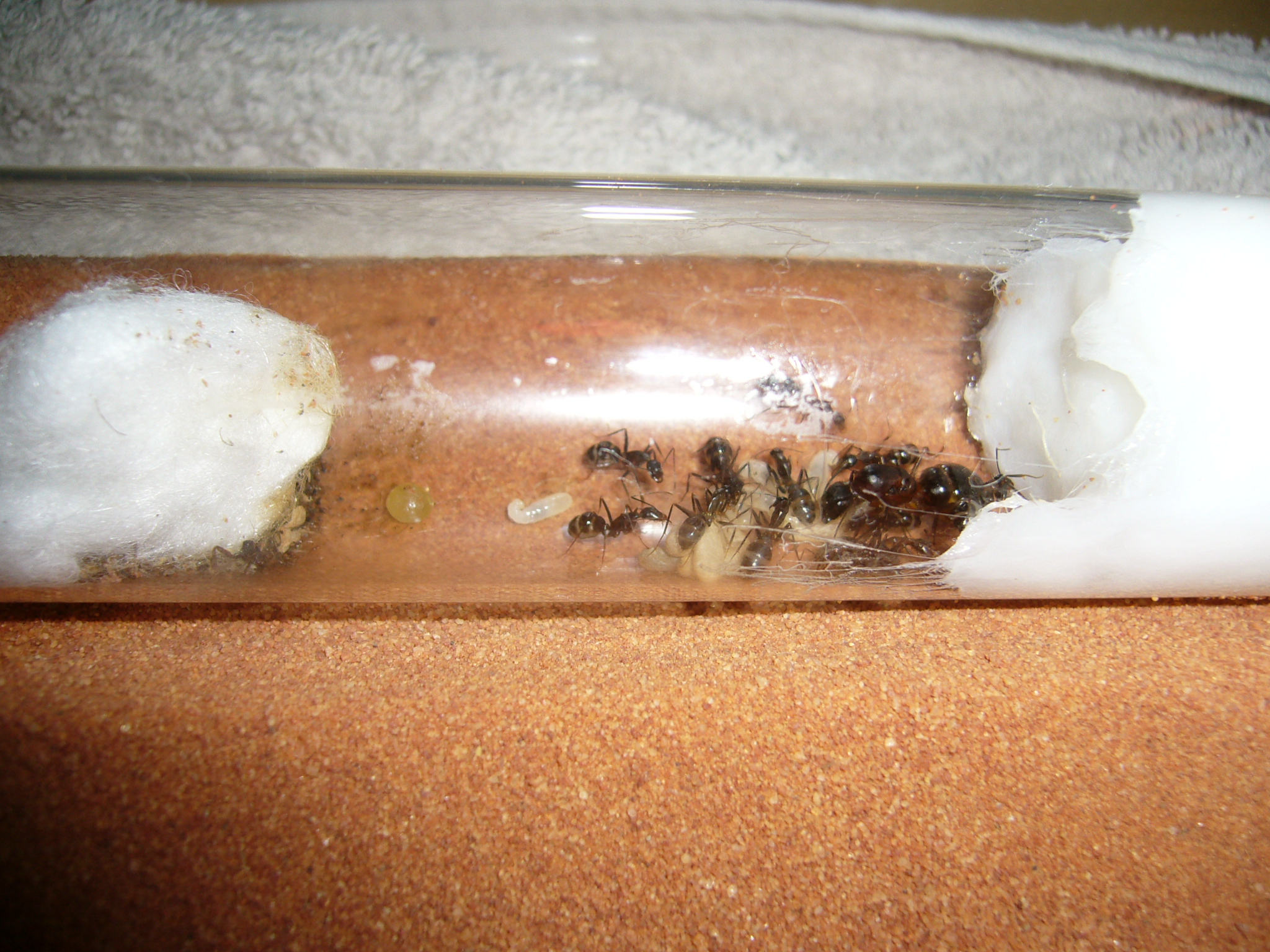Wollte ihnen ein neues Glas anbieten, das war aber nicht ganz dicht und der gesamte Inhalt (30x200mm RG) floss in die Arena. Hat zwei Tage mit der Wärmelampe gebraucht um die Luftfeuchtigkeit von 70% auf den Normalwert von 40-50% runterzubekommen. Die Ameisen hats nicht gestört.