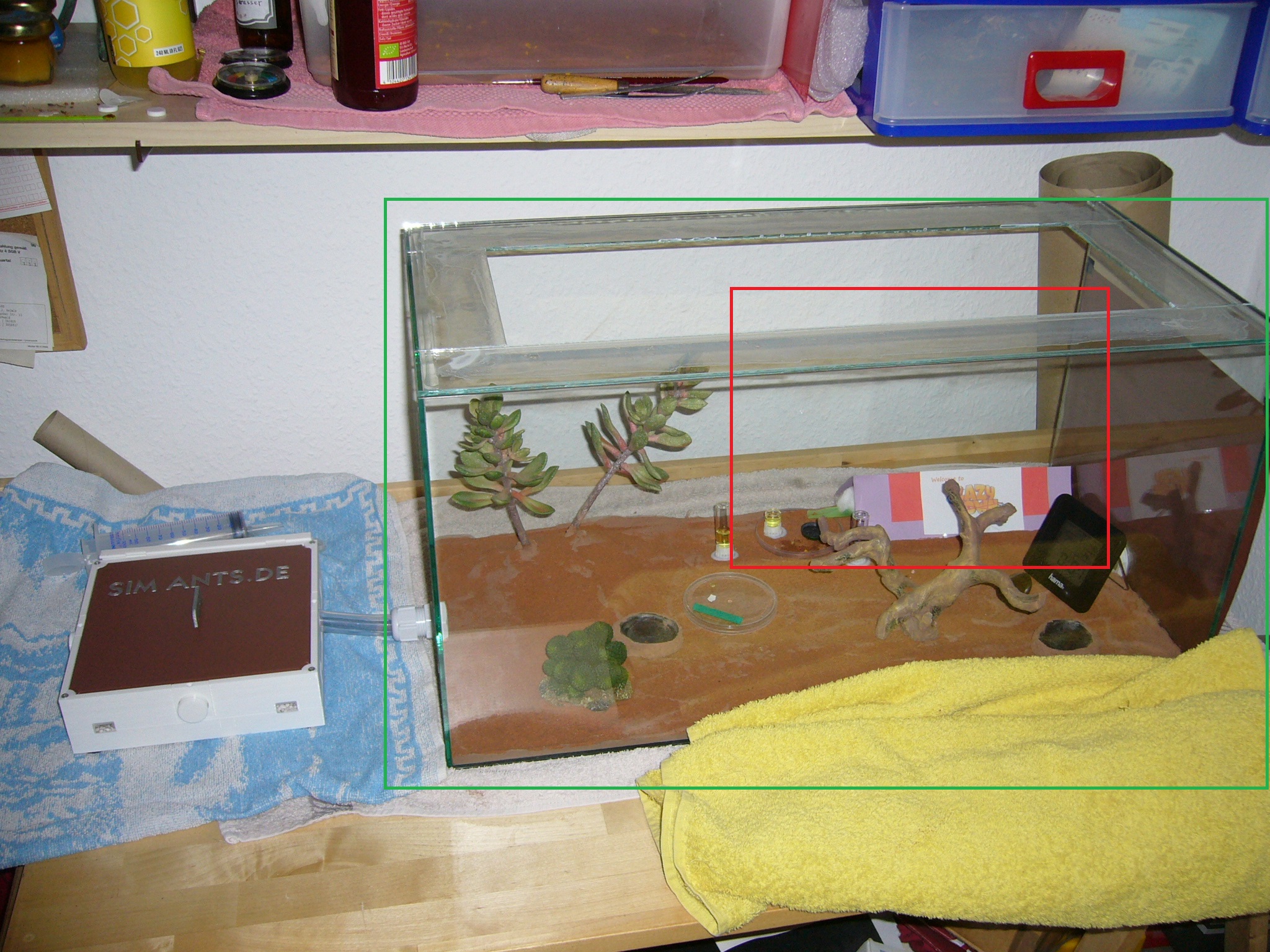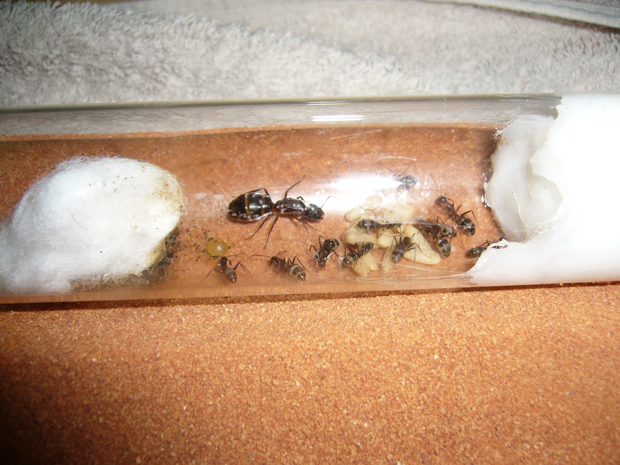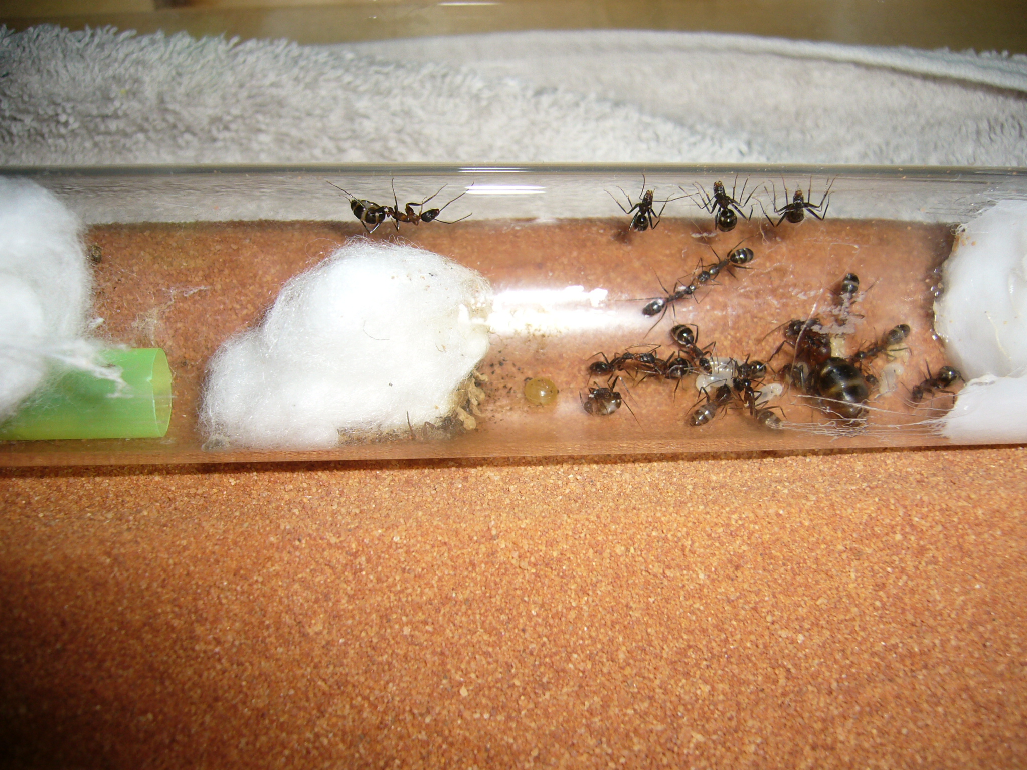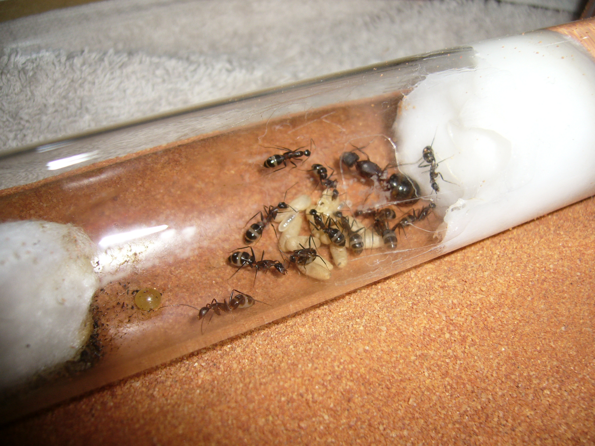 Wollte ihnen ein neues Glas anbieten, das war aber nicht ganz dicht und der gesamte Inhalt (30x200mm RG) floss in die Arena. Hat zwei Tage mit der Wärmelampe gebraucht um die Luftfeuchtigkeit von 70% auf den Normalwert von 40-50% runterzubekommen. Die Ameisen hats nicht gestört.