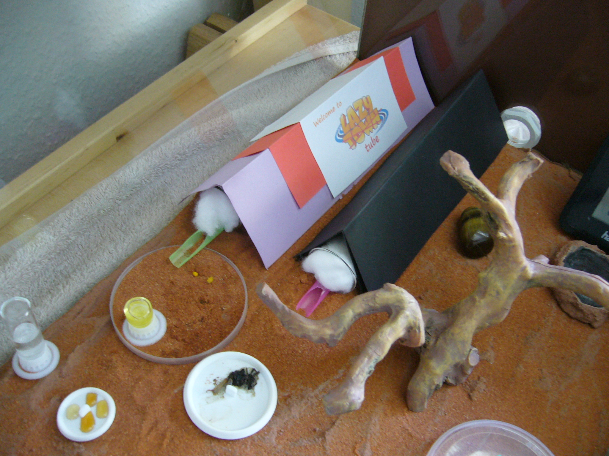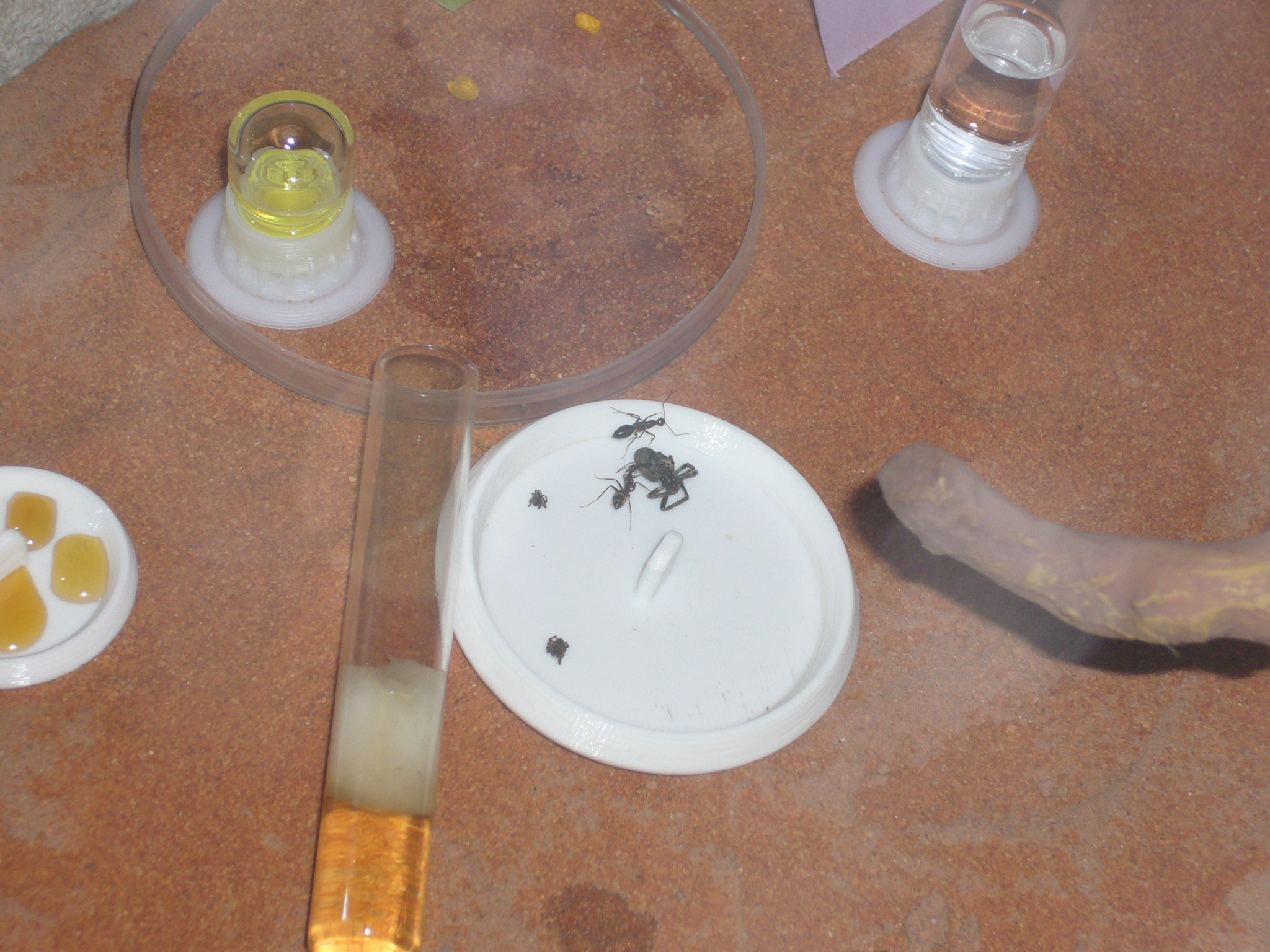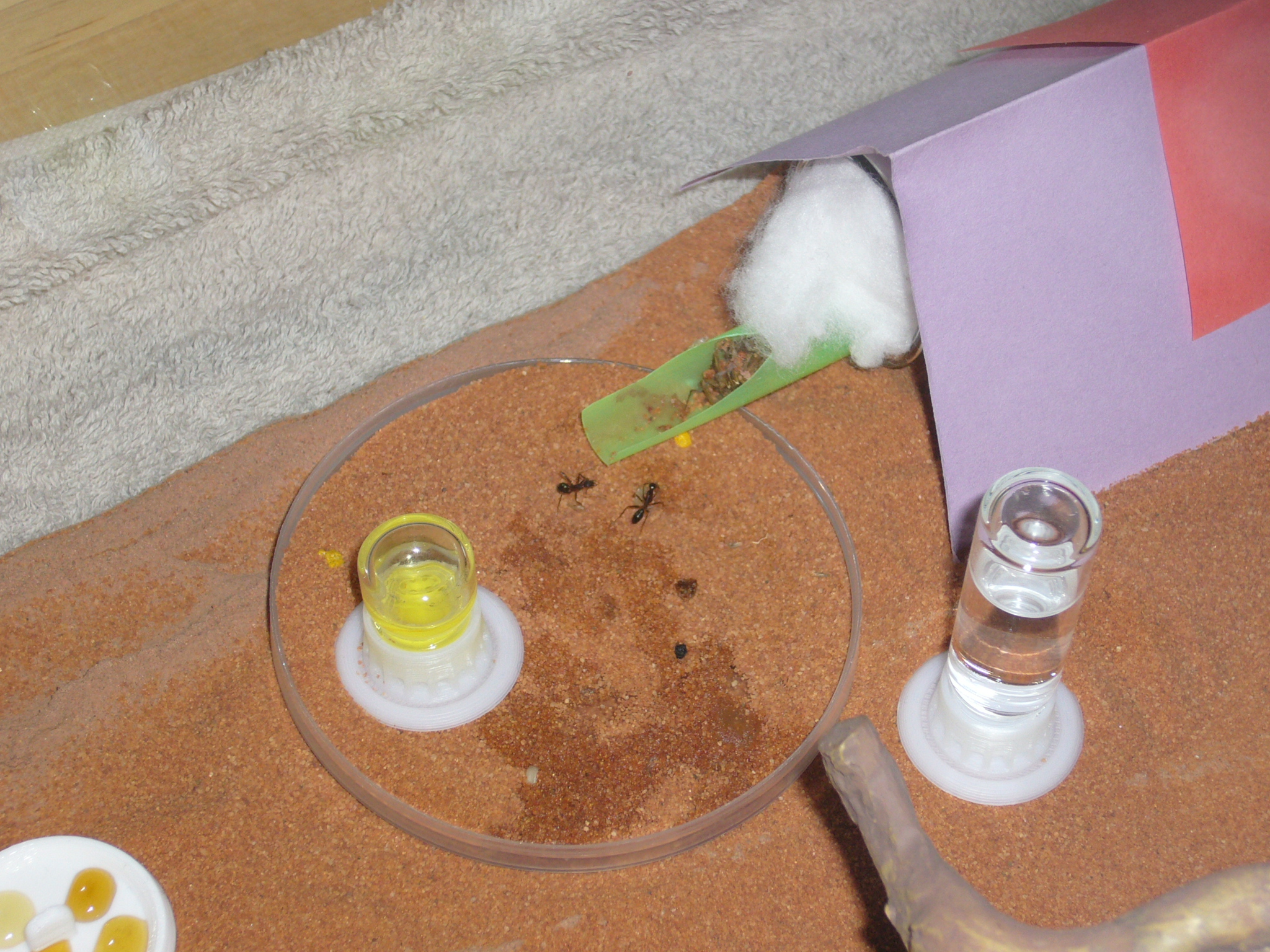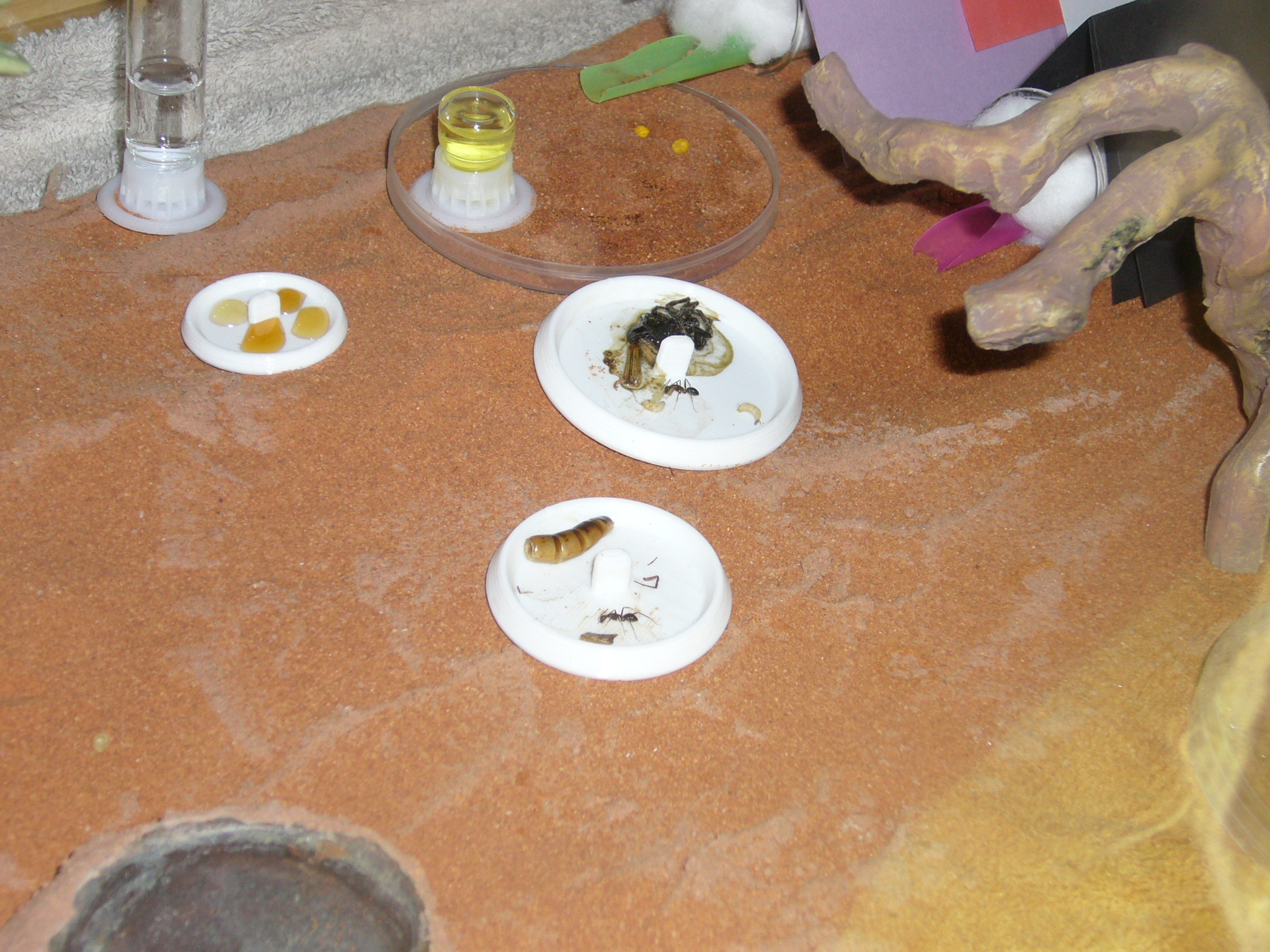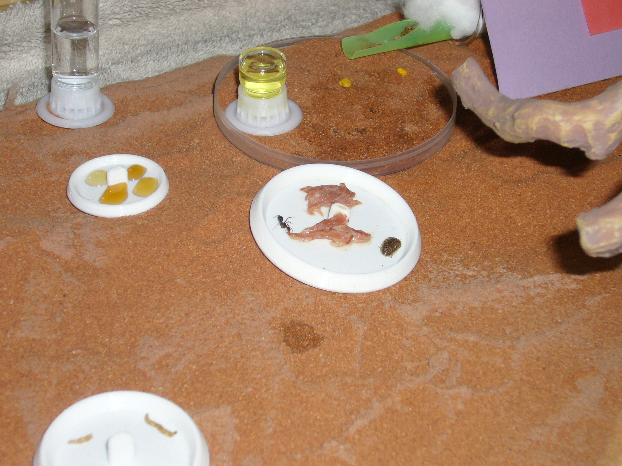 Zu Essen gibt es gerade eine riesige Spinne die ich draußen gefangen hab nur damit die Ameisen sie zwei Tage ignorierten bis ich etwas Wasser draufträufelte.
