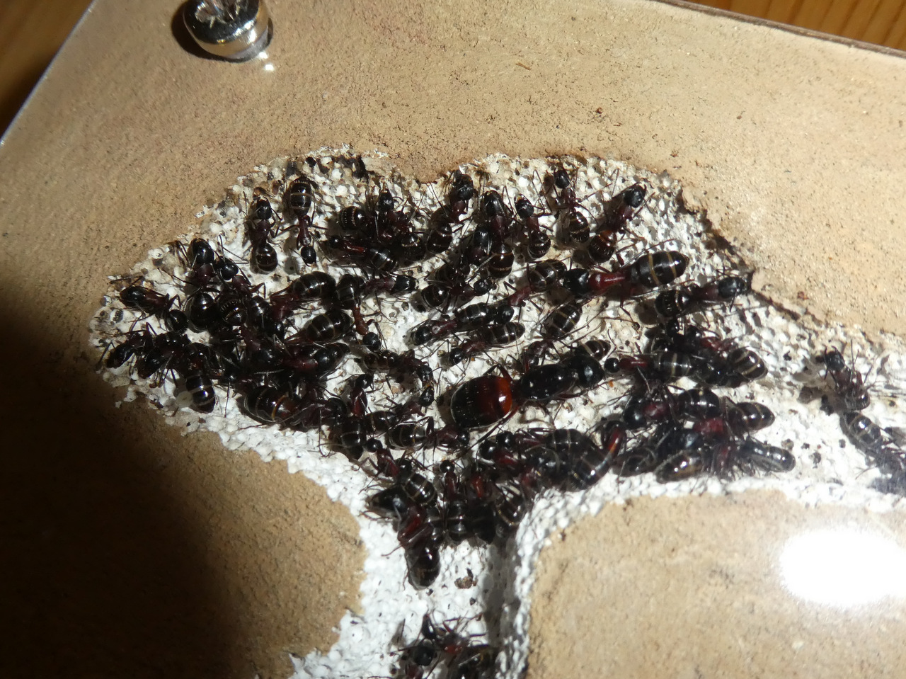 Raus also mit dem Silikagel, ein paar Löcher bohren, Schabe rein, wieder zu und zuschauen, wie sich die Camponotus damit rumärgern.
