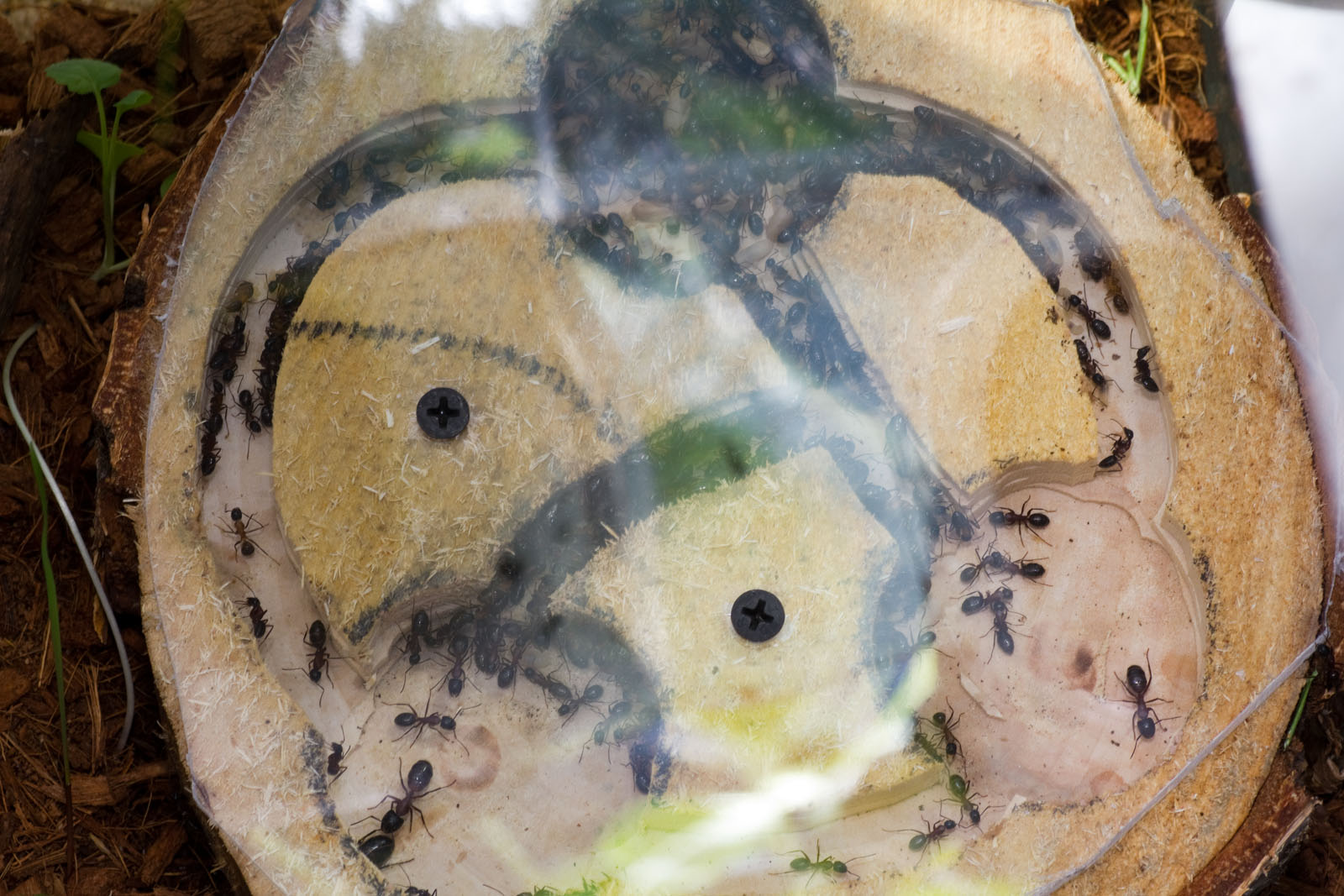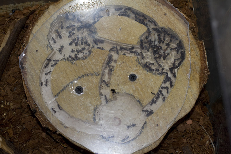 Mittlerweile stecken die Ameisen in meiner neuen Wohnung im 35er Cube und natĂŒrlich mitten in der Brutaufzucht. Es gab sehr wenige AusfĂ€lle ĂŒber den Winter, vielleicht 2 oder 3 und die Brut ist auch super durchgekommen. Einige Larven haben sich sogar schon verpuppt und Proteine werden immer gern und viel angenommen. Sogar subadulte WĂŒstenheuschrecken werden sorgsam zerlegt und in das neue Holznest gebracht. Das alte Nest war von den Dimensionen leider etwas zu groß fĂŒr den Cube, daher habe ich ein Holznest gebastelt, in das sie auch schnell umgezogen sind.