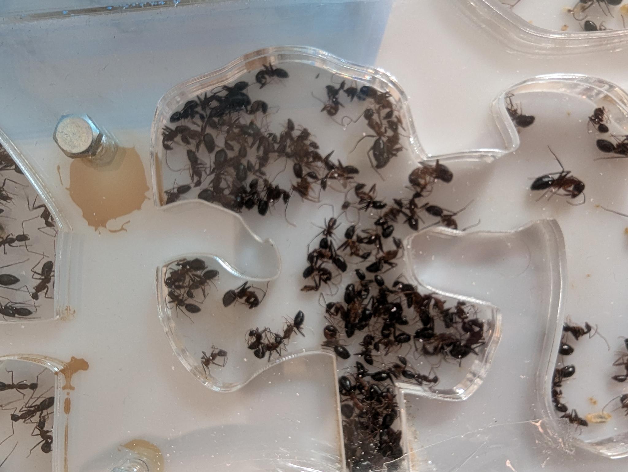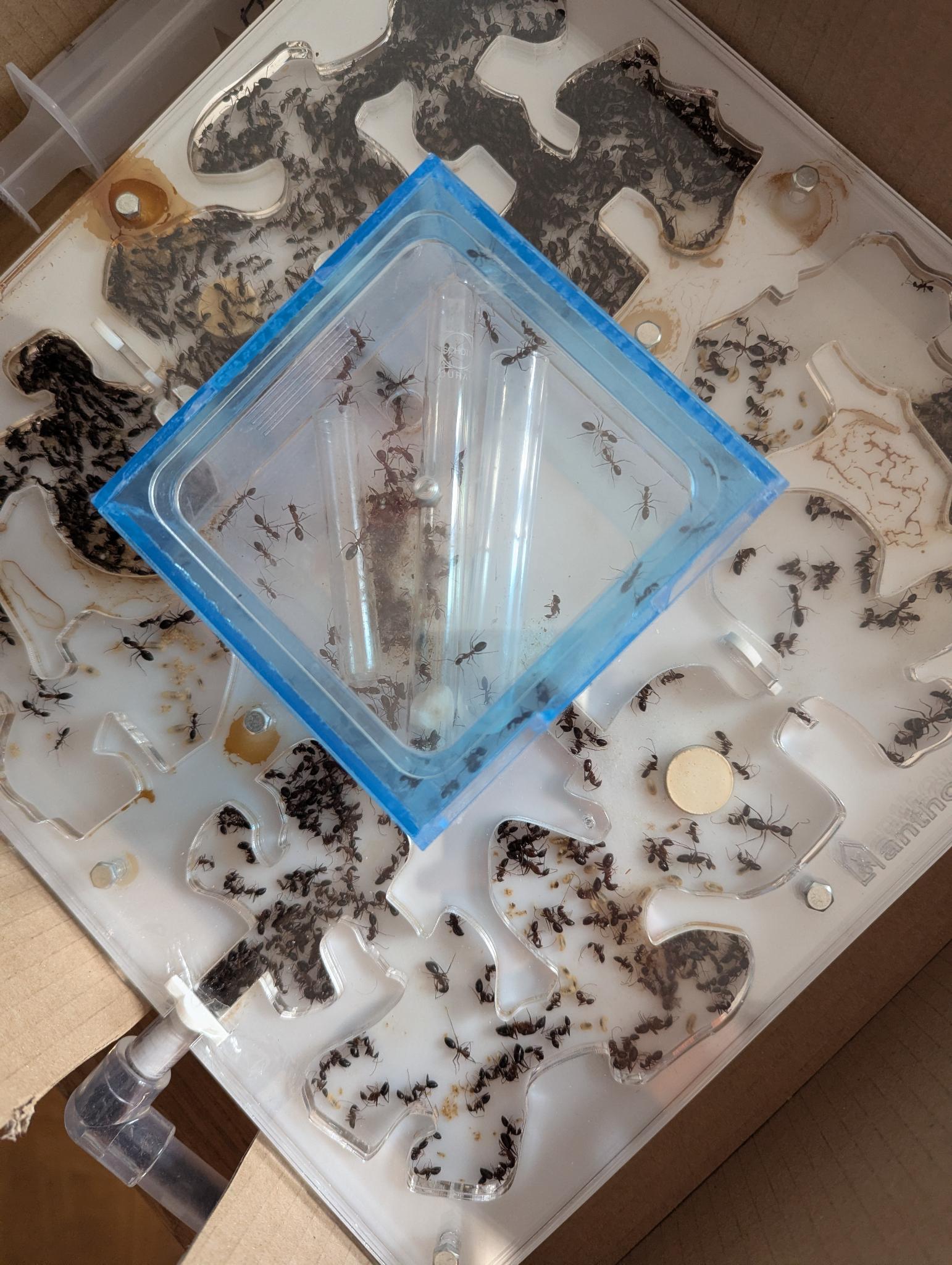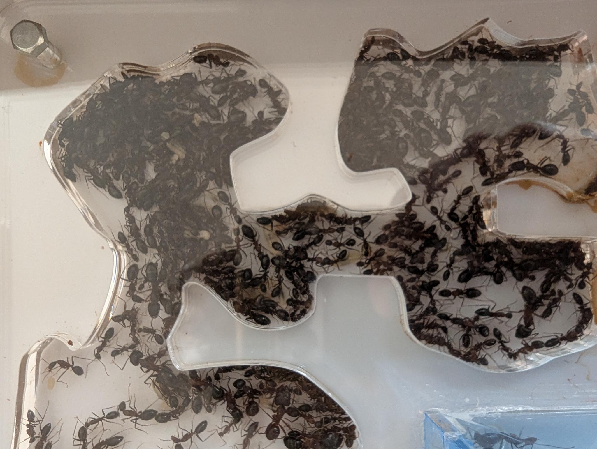 Ich poste hier ein paar der Bilder. Neben der Trauer frage ich mich, ob ich etwas falsch gemacht habe. Ich habe das Nest bei uns im Keller bei ca. 10° gehabt. Wasser habe ich über den Pilz im Nest hinzugeführt. Nahrung in Form von Zuckerwasser und Proteinen habe ich keins gegeben. Was ich, im Nachhinein, nicht gut gemacht habe ist, dass neben dem Nest kein richtiger Platz war um Abfall zu entsorgen. Da ich ein paar Tubes im oberen Aussenbereich des Nestes gelegt hatte (wodurch ich die eingesammelten Arbeiterinnen zurück ins Nest geführt habe), haben sie diesen Teil wohl auch als Nest angesehen. Die Arbeiterinnen haben das Verbindungsrohr zugestopft mit toten Arbeiterinnen. Als ich das Rohr gesäubert habe von den vielen toten Ameisen kam mir ein beissender Verwesungsgeruch entgegen. Ich weiss nicht, ob diese Gase ggf. negativ auf die Kolonie gewirkt haben.