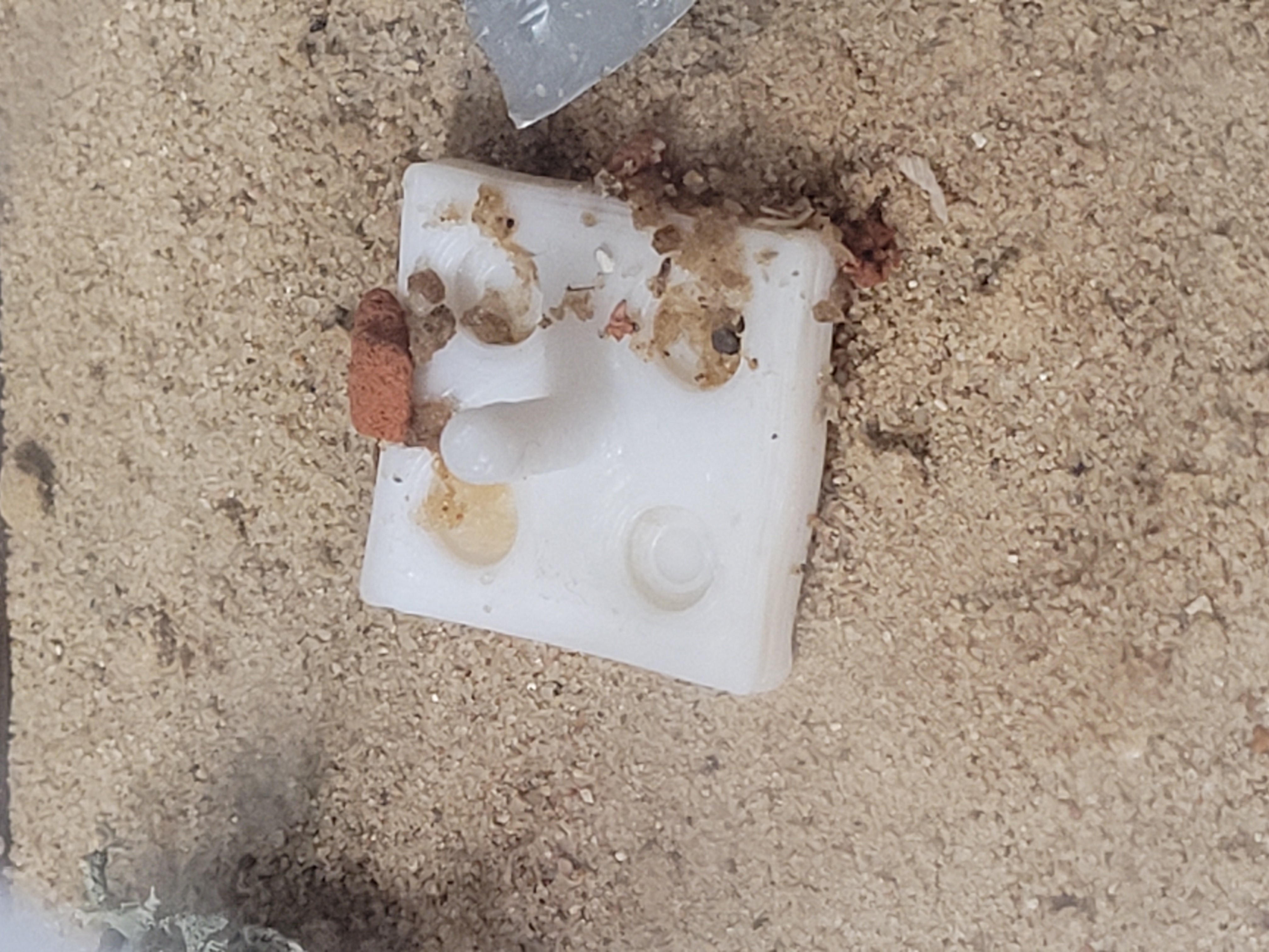 Dadurch habe ich jetzt etwas Invertzucker erhalten plus eine grössere Zuckertränke für die Diacamma. Die kleine Zuckertränke wird von den Diacamma nicht wirklich beachtet, ist dafür bei den Camponotus hoch im Kurs. Ich habe jedoch festgestellt, dass der Invertzucker bisher noch auf 0 Interesse gestossen ist - ebenso wenig Ahornsirup. Weiterhin hoch im Kurs sind allerlei Sorten Honig welche ich immer abwechselnd anbiete sowie die Heimchen und Schaben Schenkel welche Sie jeweils vom Futter der Diacamma erhalten. Wenn ich jeweils ganze Tiere angeboten habe, hat sich die Arbeiterin draussen bedient und dies dann der