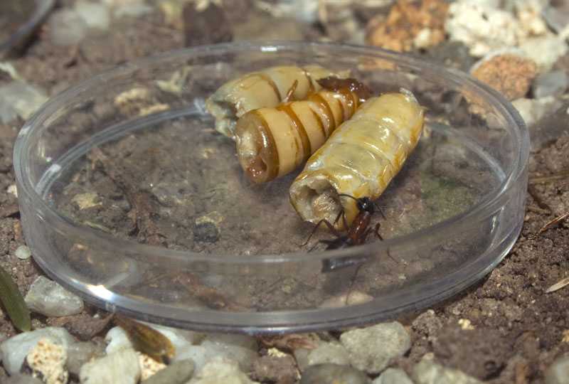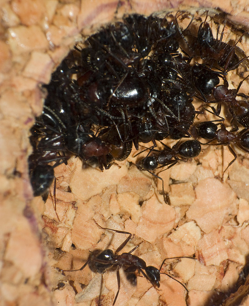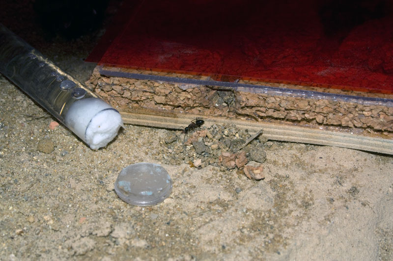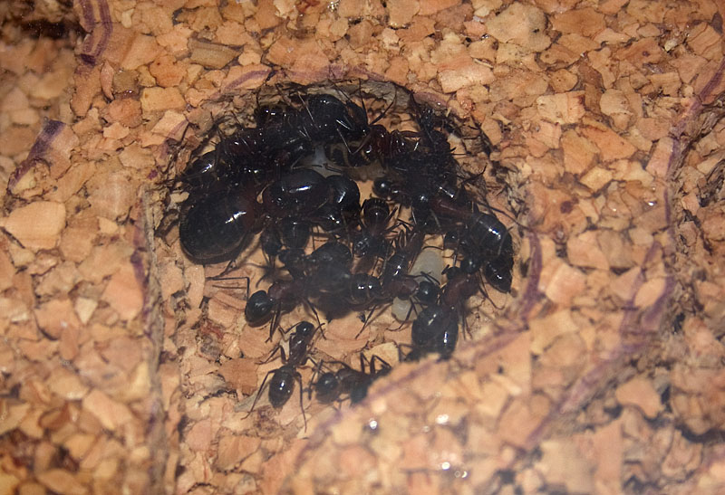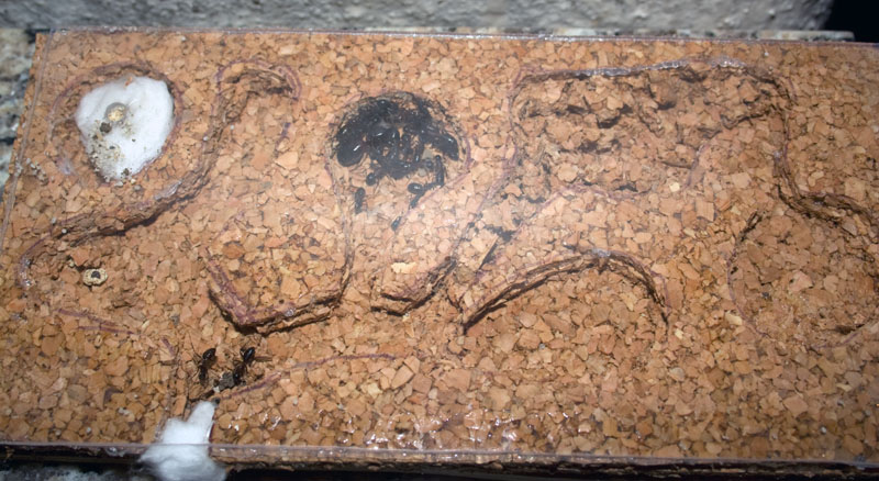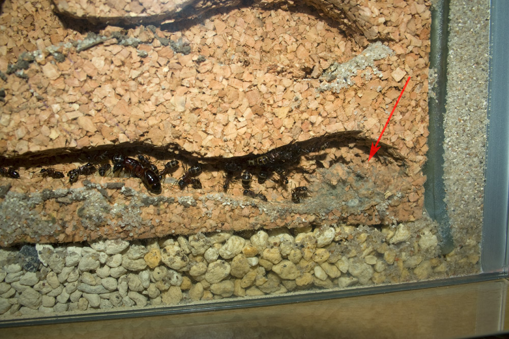 Zuerst hab ich den Eingang mit Watte verschlossen und alle Schäuche abgemacht. Dann wurde der Sand und die Korkkrümel vorsichtig heraus geschüttet. Das Korknest hab' ich dann mit einer Zange vorziehen und in die Arena stellen können. Dabei gab es natürlich ordentlich Tumult, nach 20 Minuten hatte sich die Situation aber beruhigt und einige Arbeiter saßen zusammen mit der