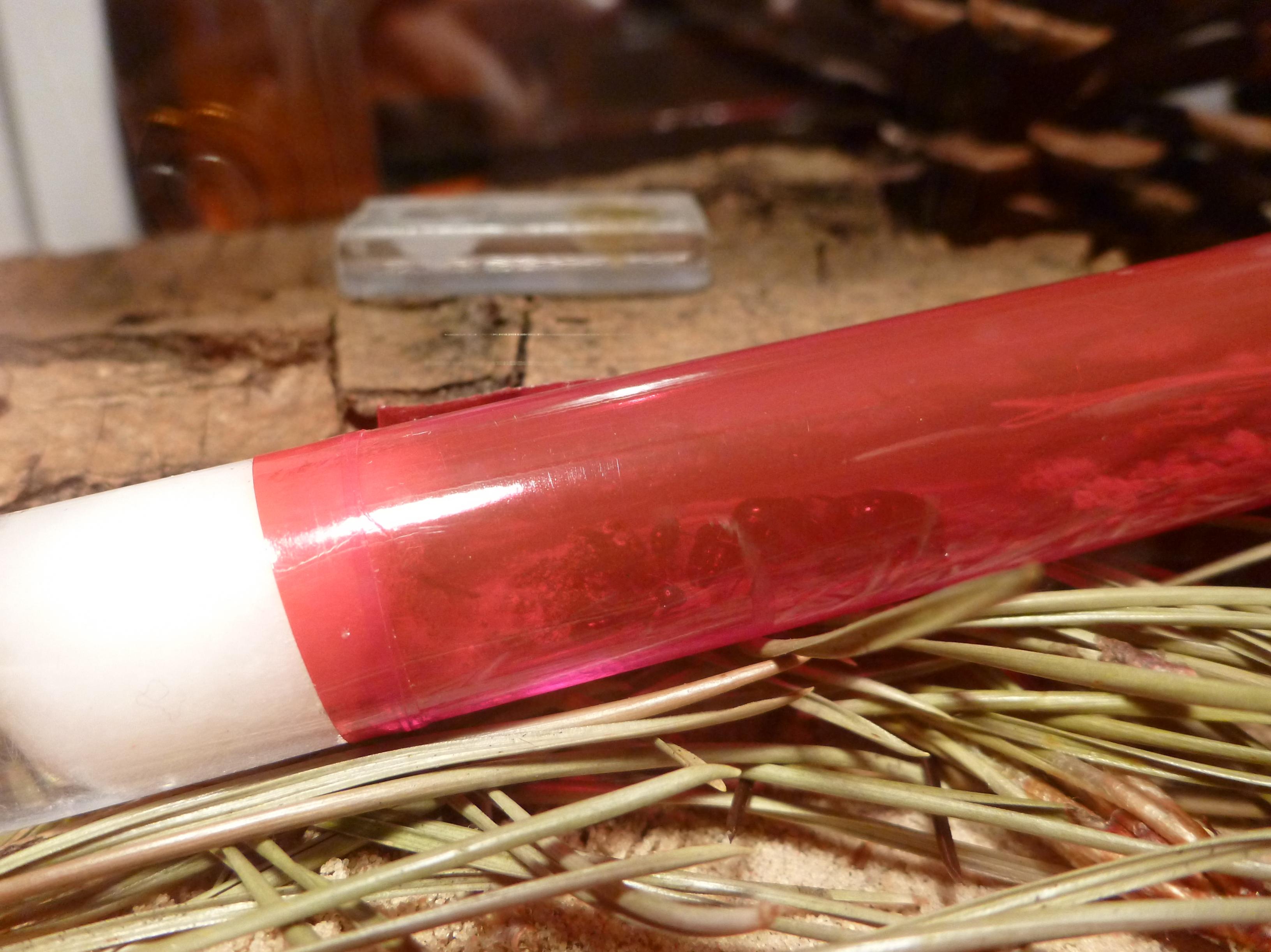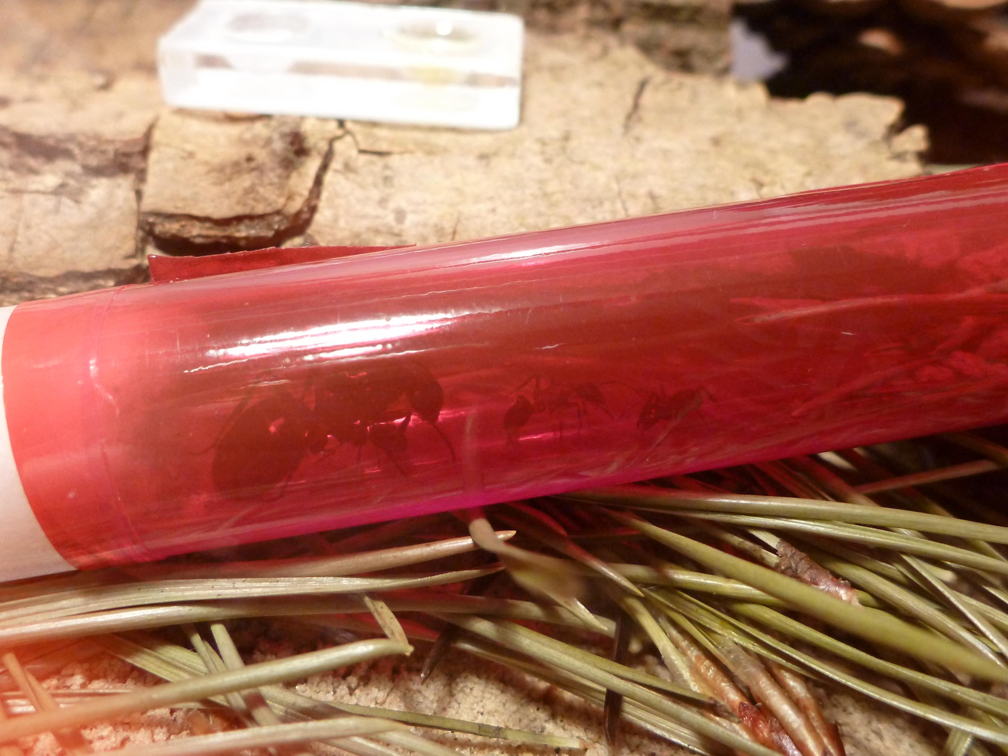 Ansonsten ist mir heute aufgefallen, dass nur zwei Arbeiterinnen im RG waren. Auch im Becken schien weder eine tote, noch eine lebende Arbeiterin zu sein, also habe ich mal unter den Holzstücken nachgeschaut. Und siehe da, unter diesen versteckt hielt sich eine Arbeiterin auf, die mittlerweile wieder im RG ist.