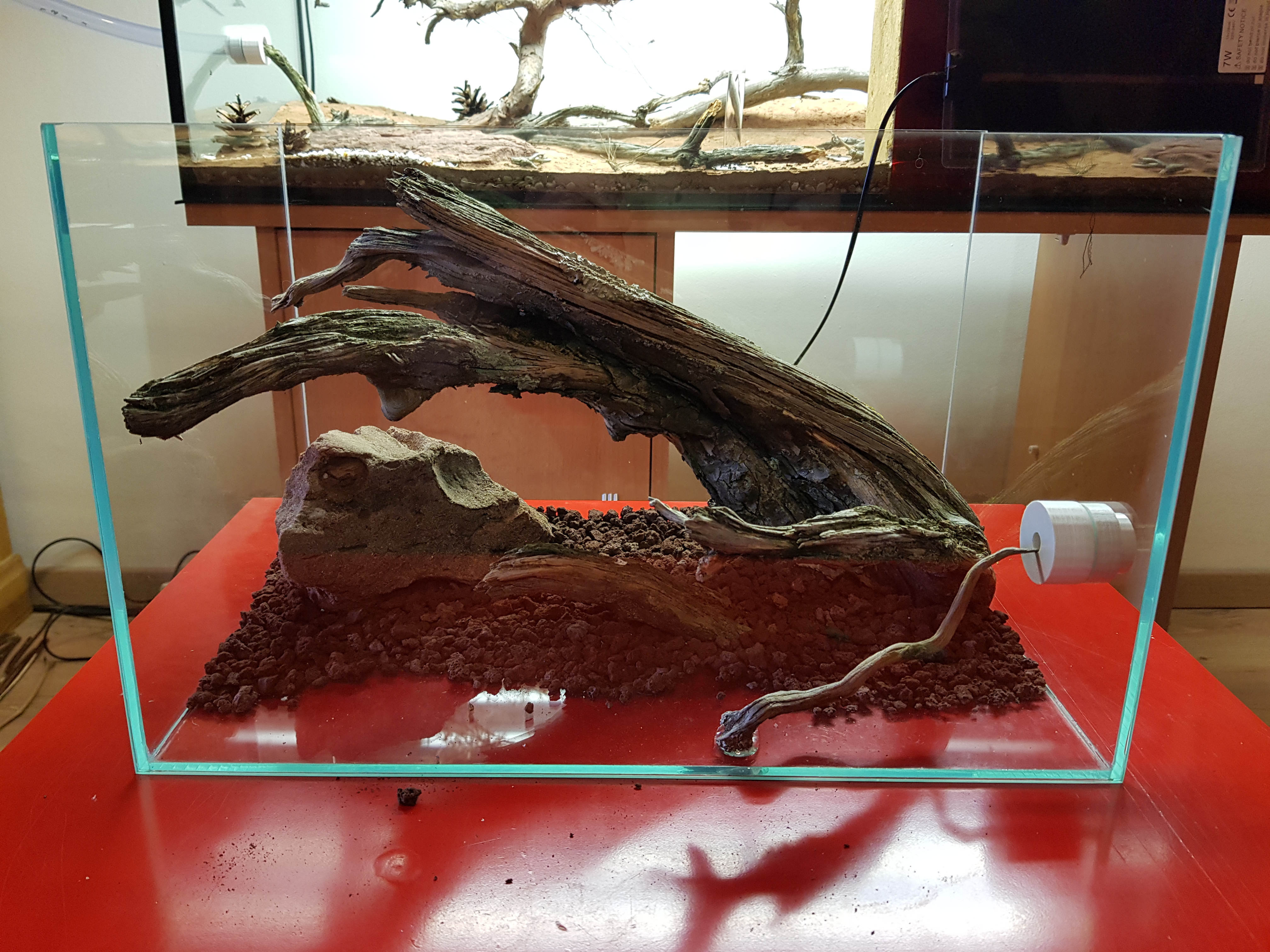 kleineren Wurzelstücke mit 5-Minuten-Epoxy fest; das große Stück habe ich einfach reingestellt. Einen passenden Stein habe ich auch noch