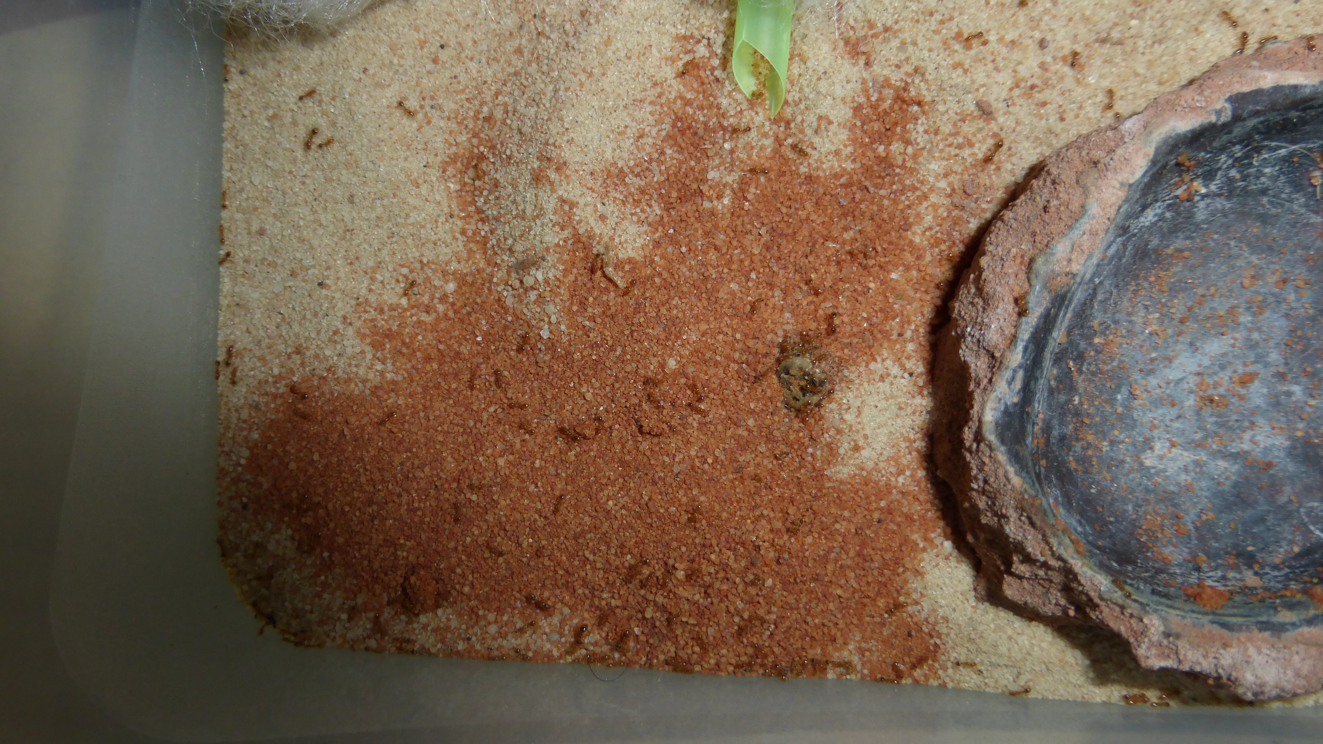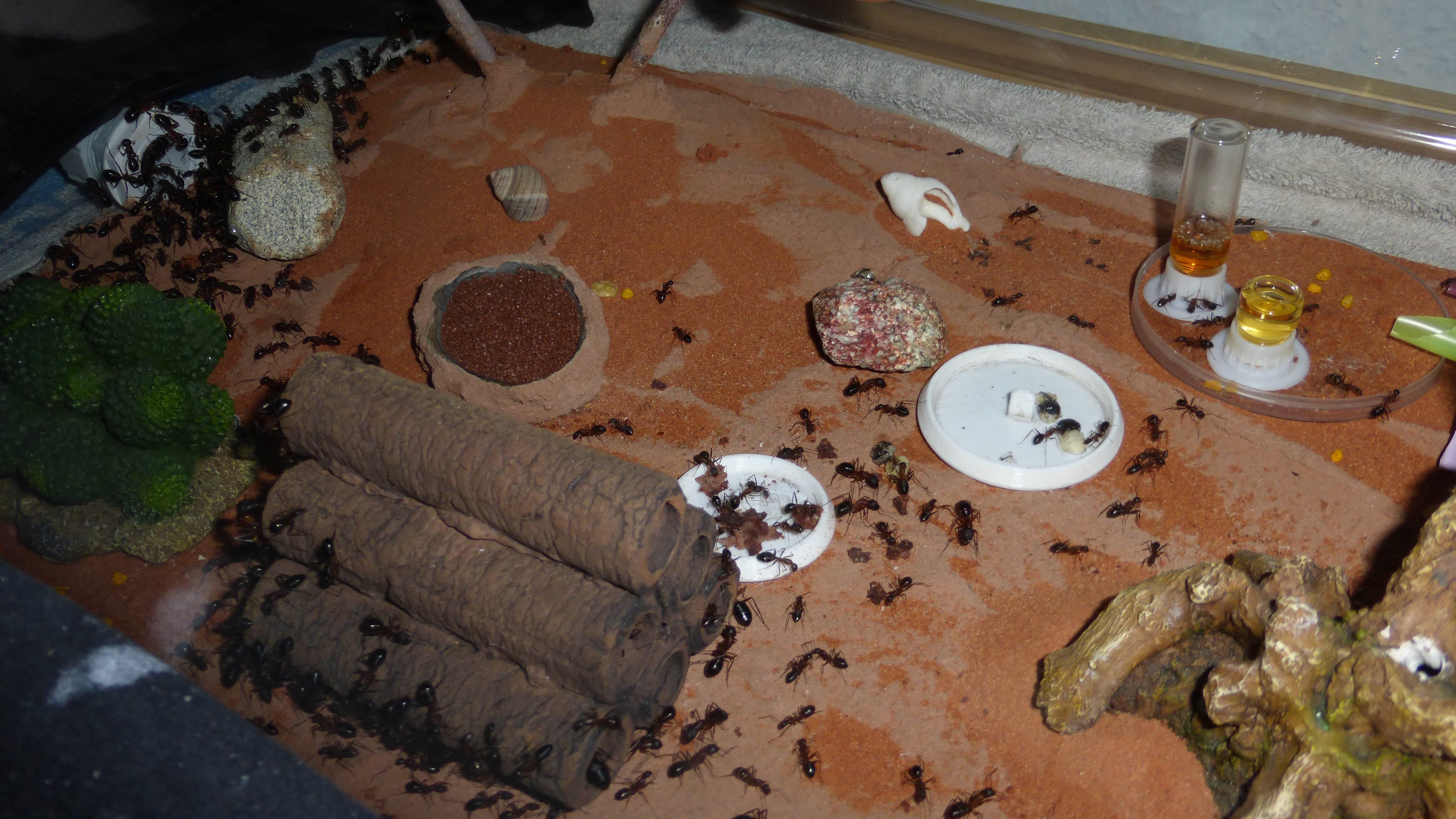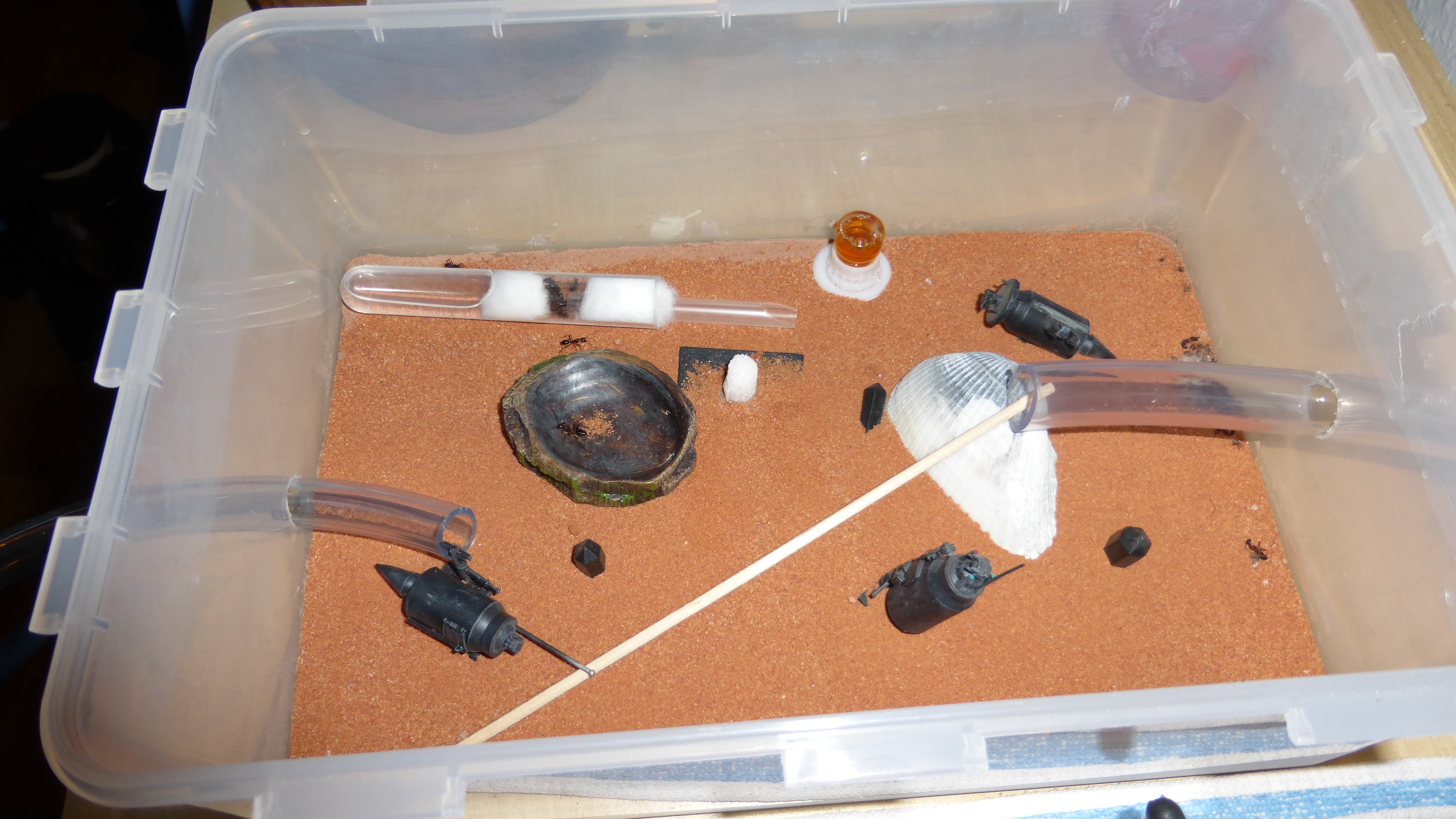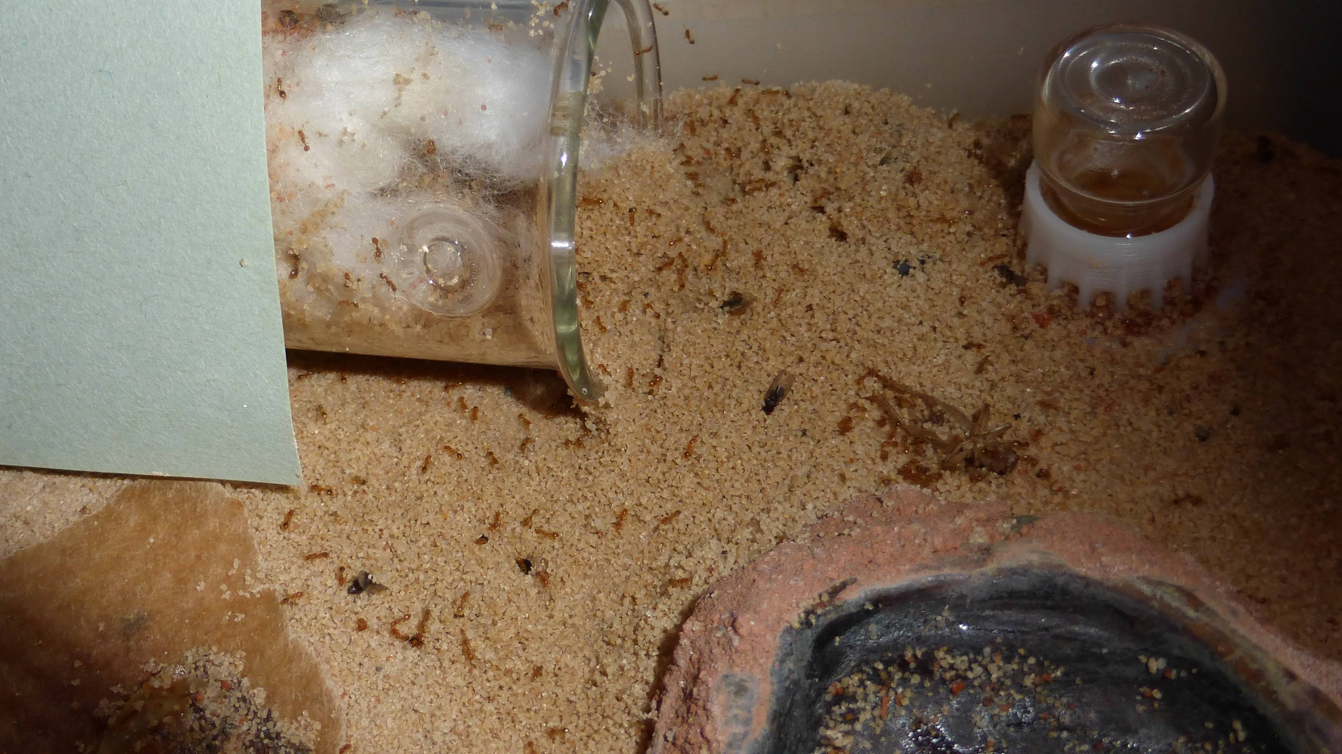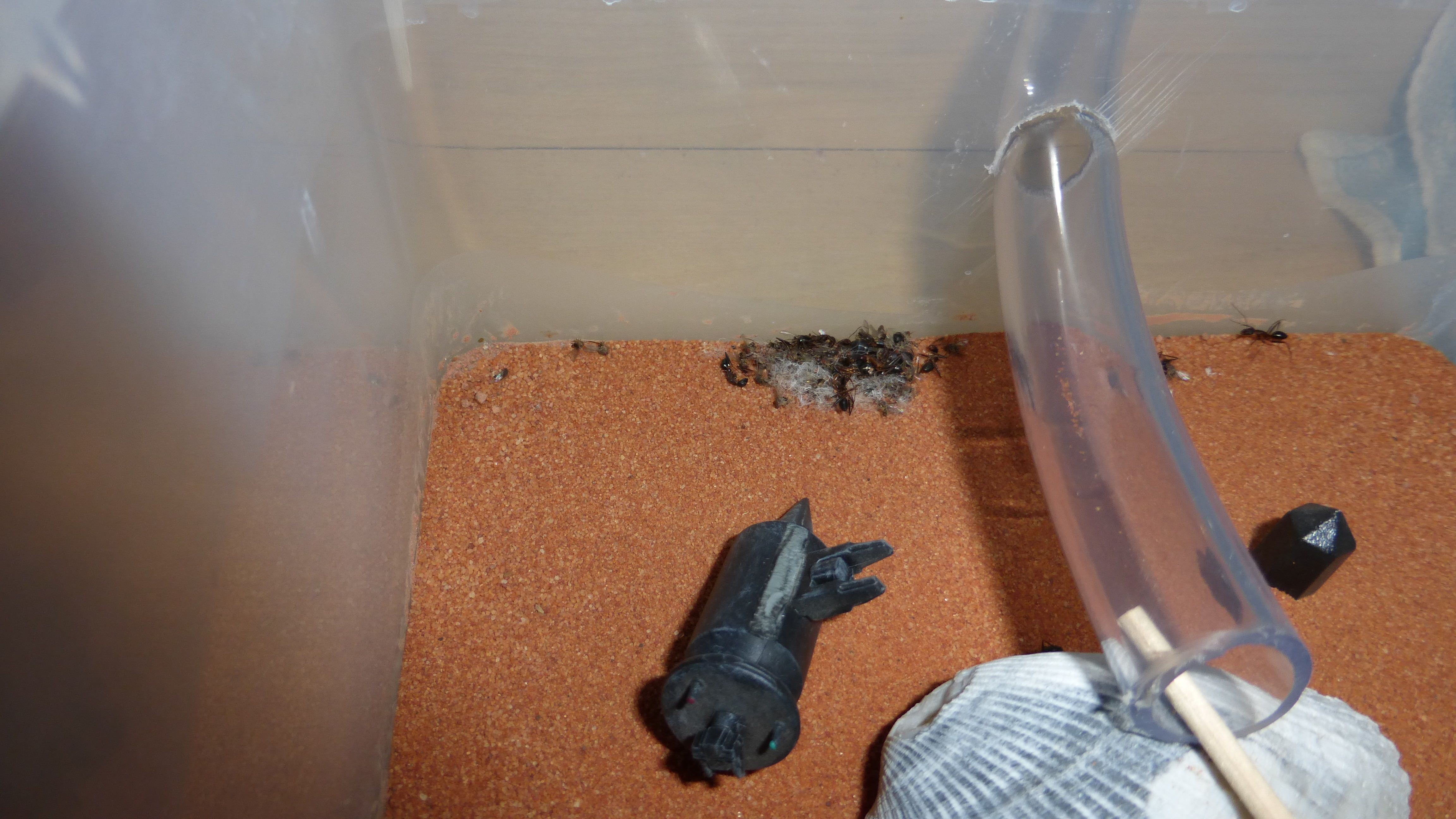 Es sind überraschend wenig Ameisen im Nest, viele verbringen die meiste Zeit in den Wasser-RGs oder den Schrimpsröhren der Arena. Tagsüber mag die Arena verlassen aussehen, ist sie allerdings nicht - bin gestern beim putzen aus Versehen gegen eine der Schrimpsröhren gestoßen und ein paar Sekunden später wuselten mehrere hundert sehr aufgebrachte Ameisen durch die Arena und versuchten meinen Pinsel zu vertreiben.