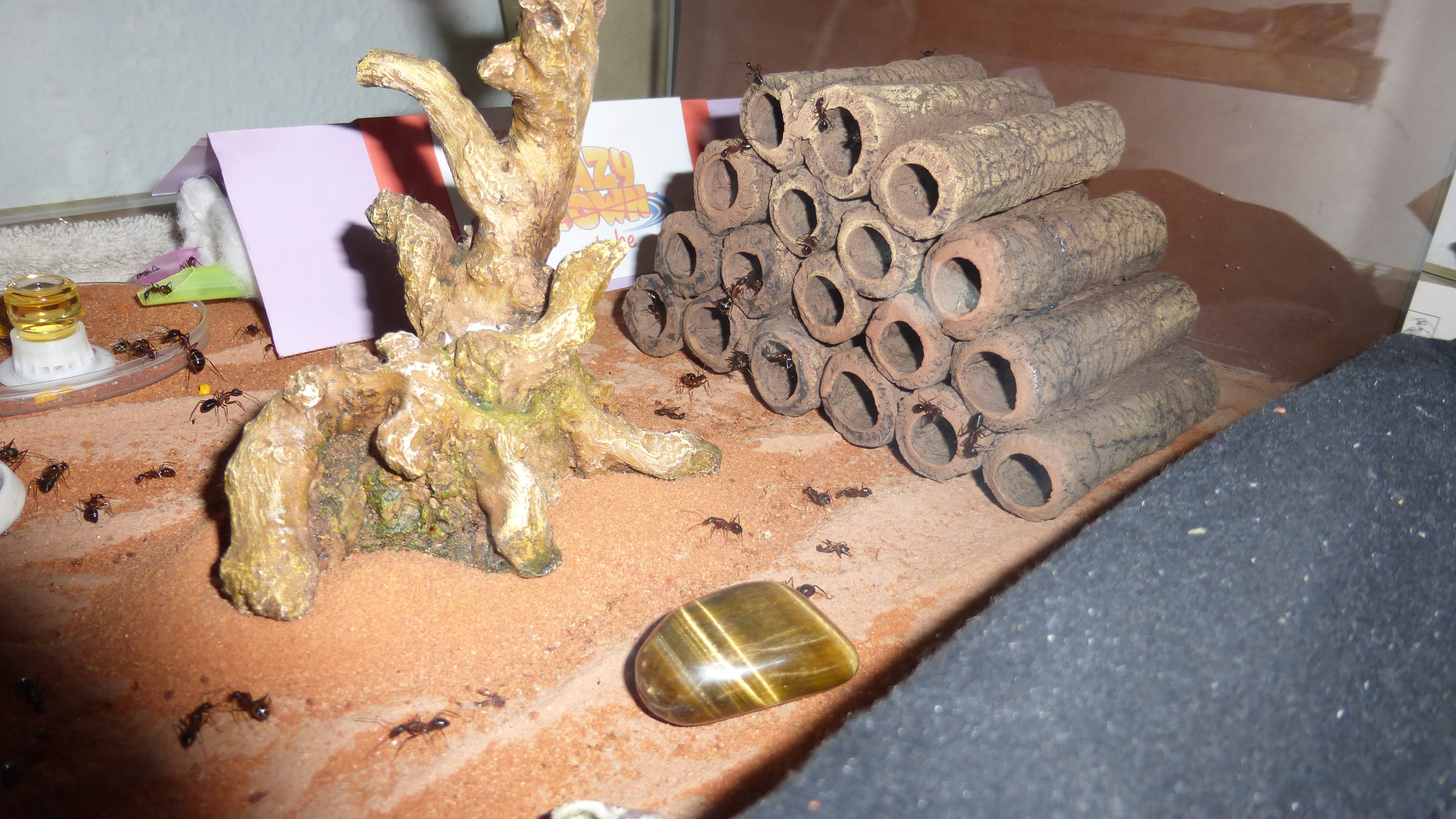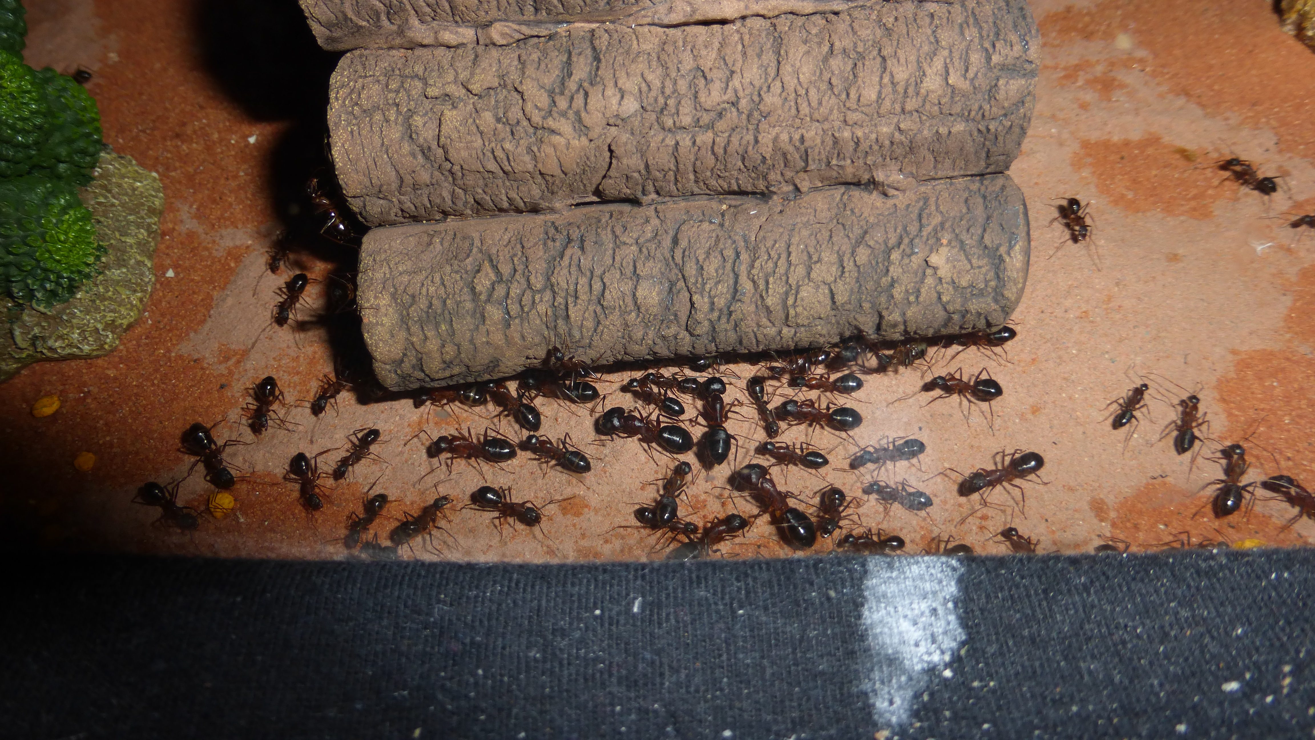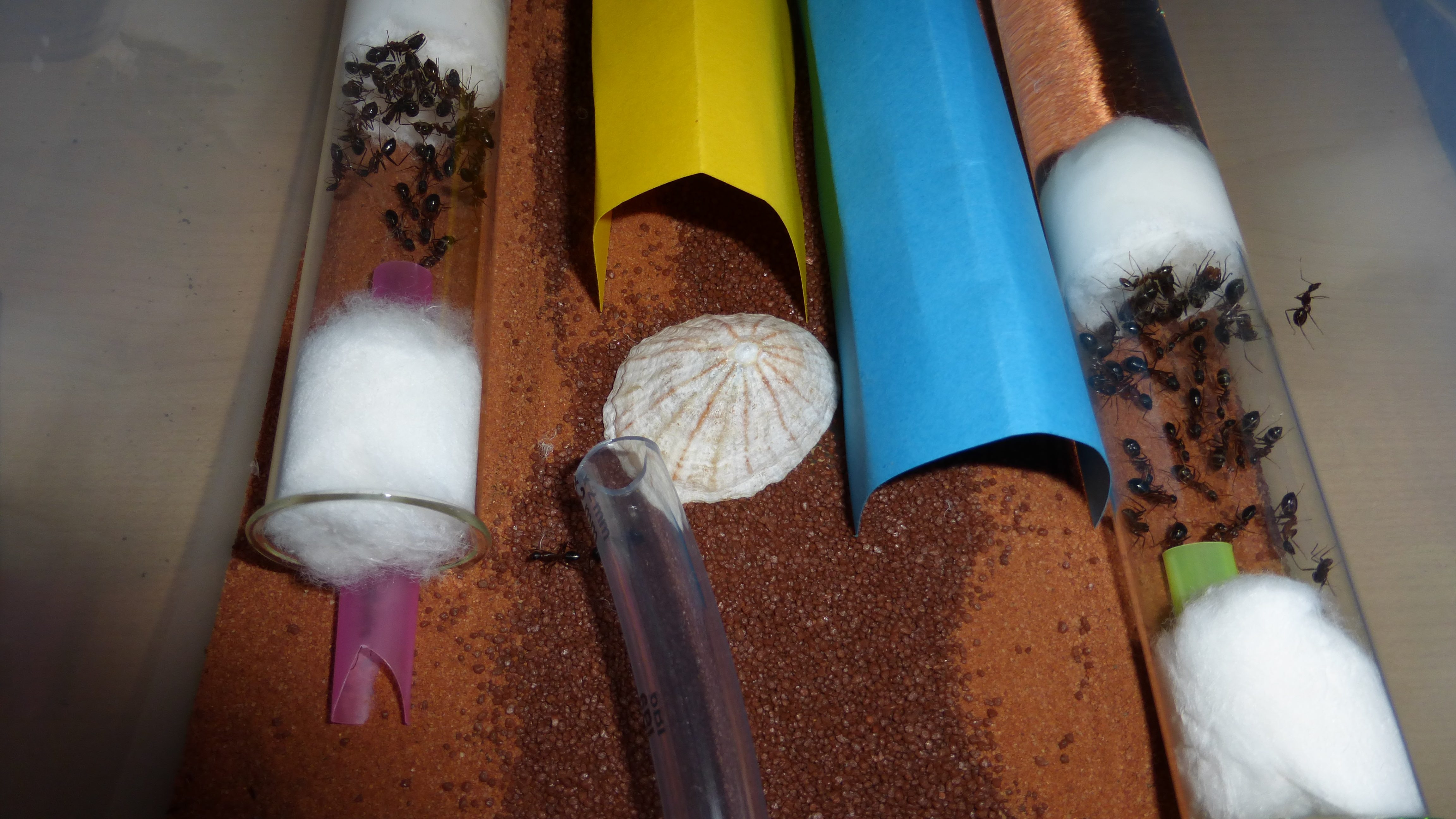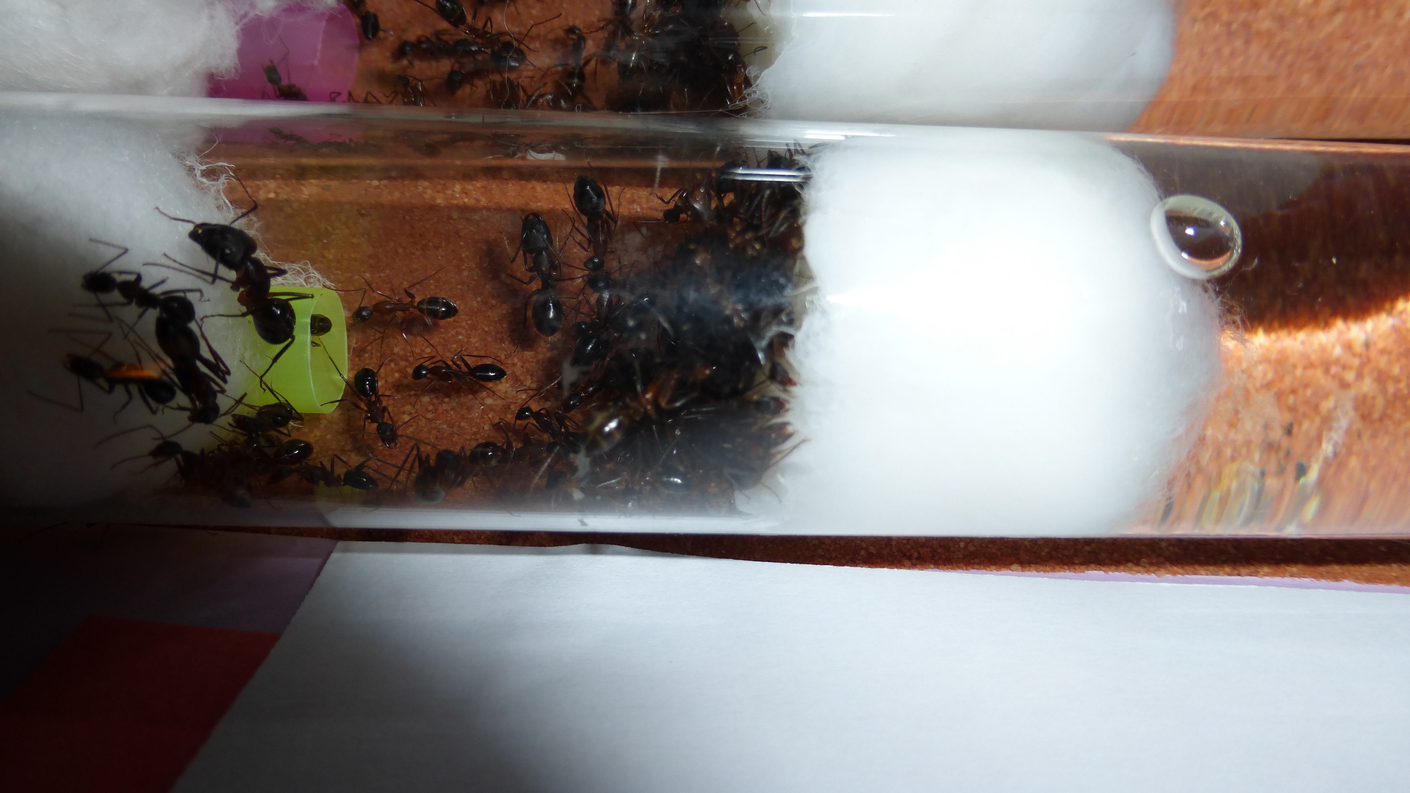 Es sind überraschend wenig Ameisen im Nest, viele verbringen die meiste Zeit in den Wasser-RGs oder den Schrimpsröhren der Arena. Tagsüber mag die Arena verlassen aussehen, ist sie allerdings nicht - bin gestern beim putzen aus Versehen gegen eine der Schrimpsröhren gestoßen und ein paar Sekunden später wuselten mehrere hundert sehr aufgebrachte Ameisen durch die Arena und versuchten meinen Pinsel zu vertreiben.