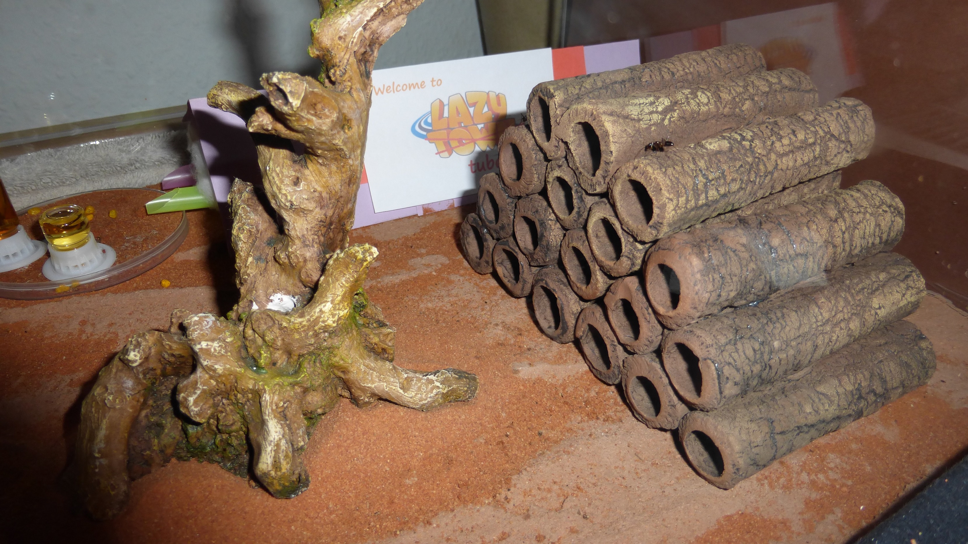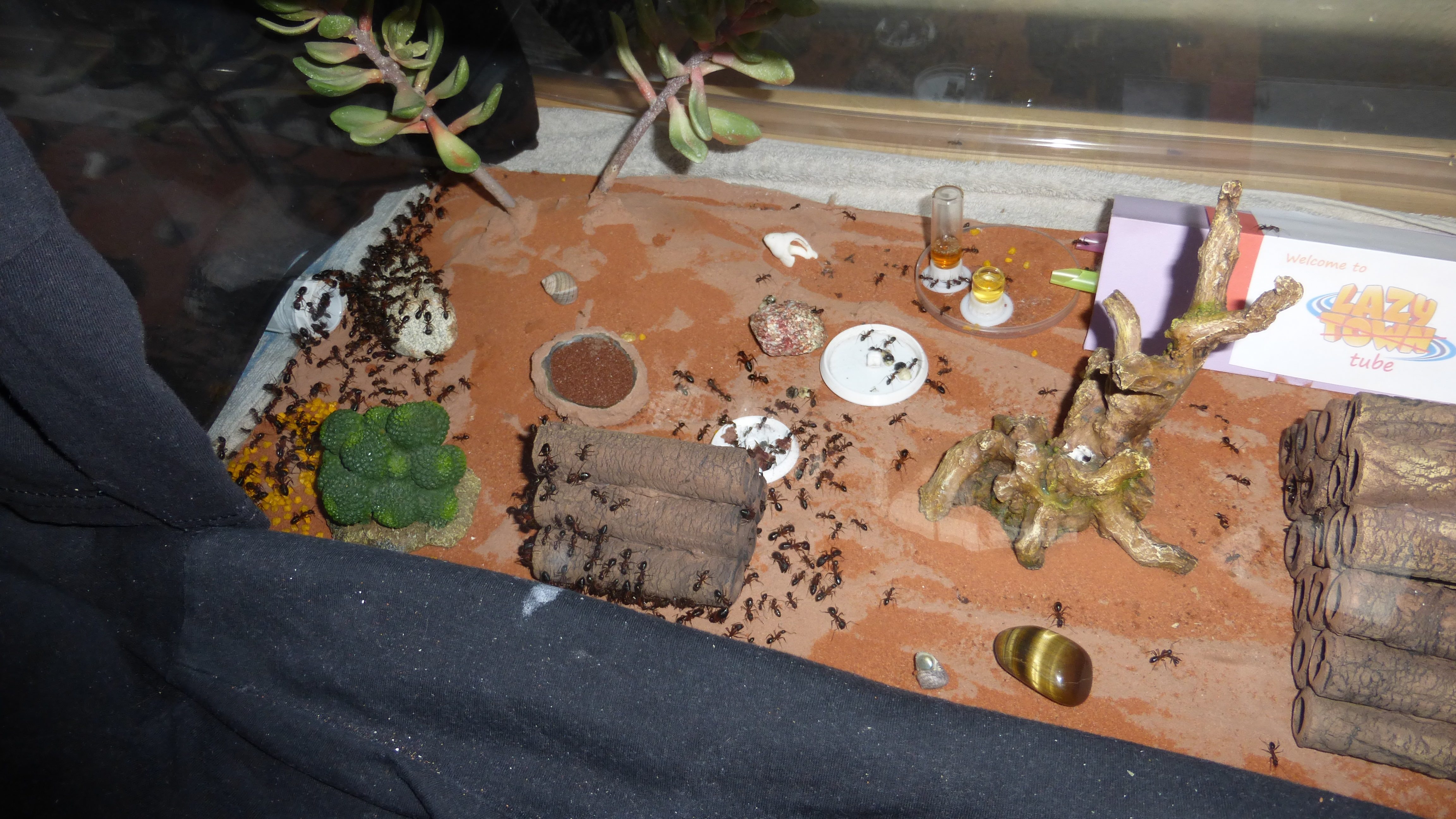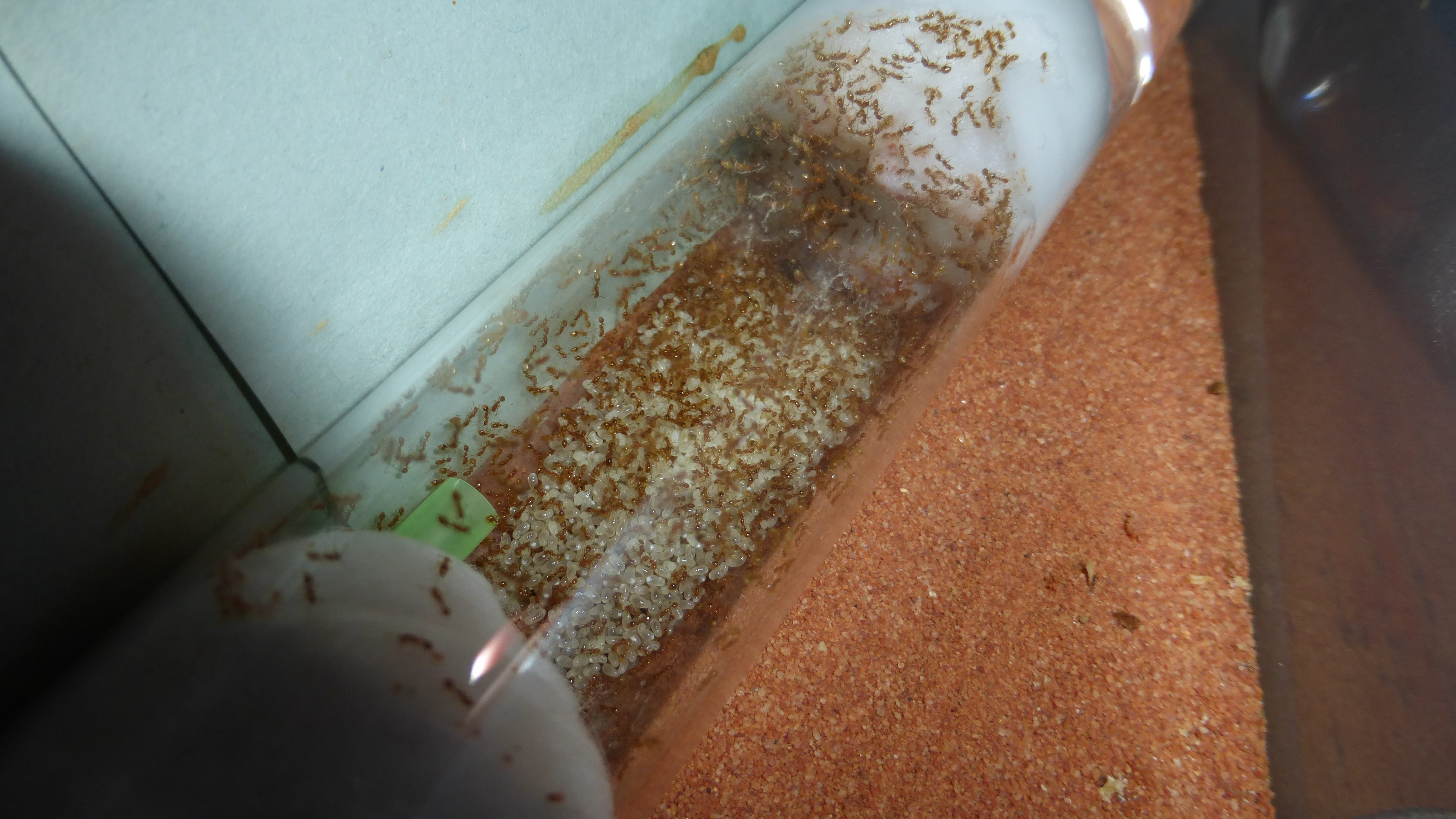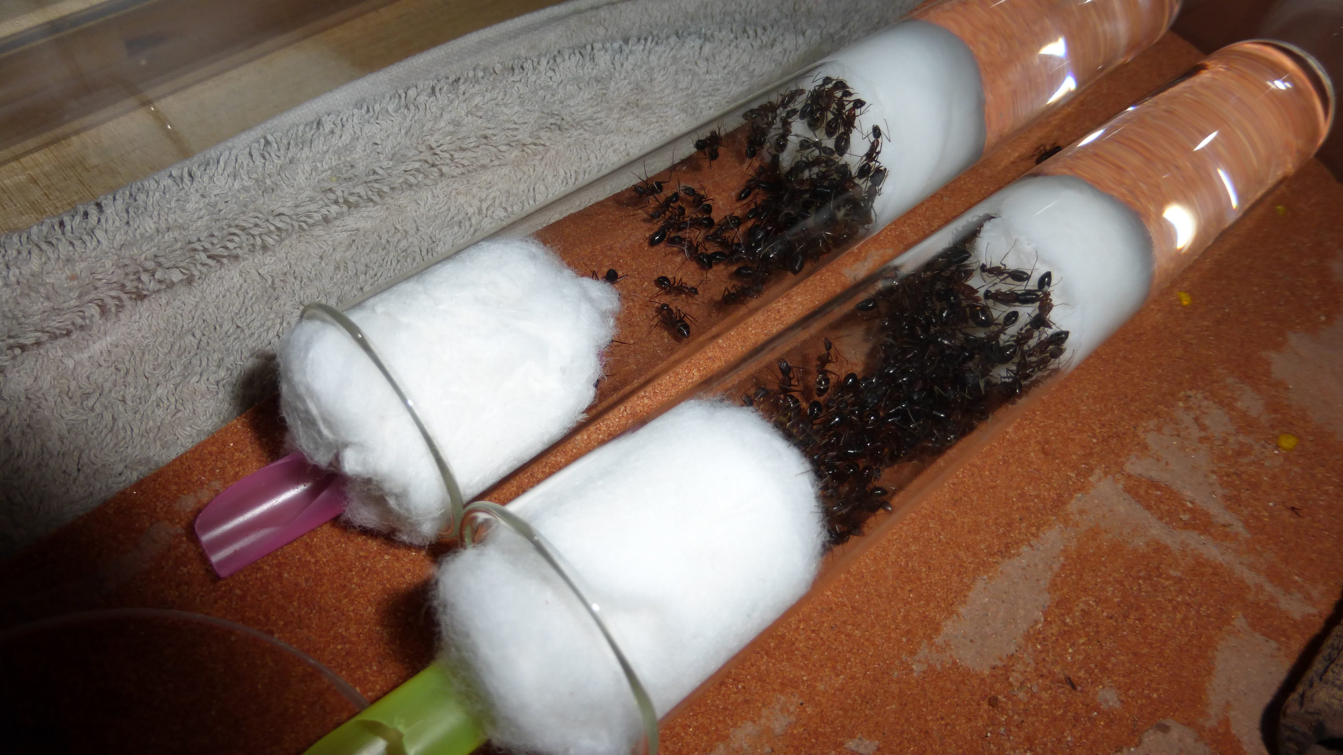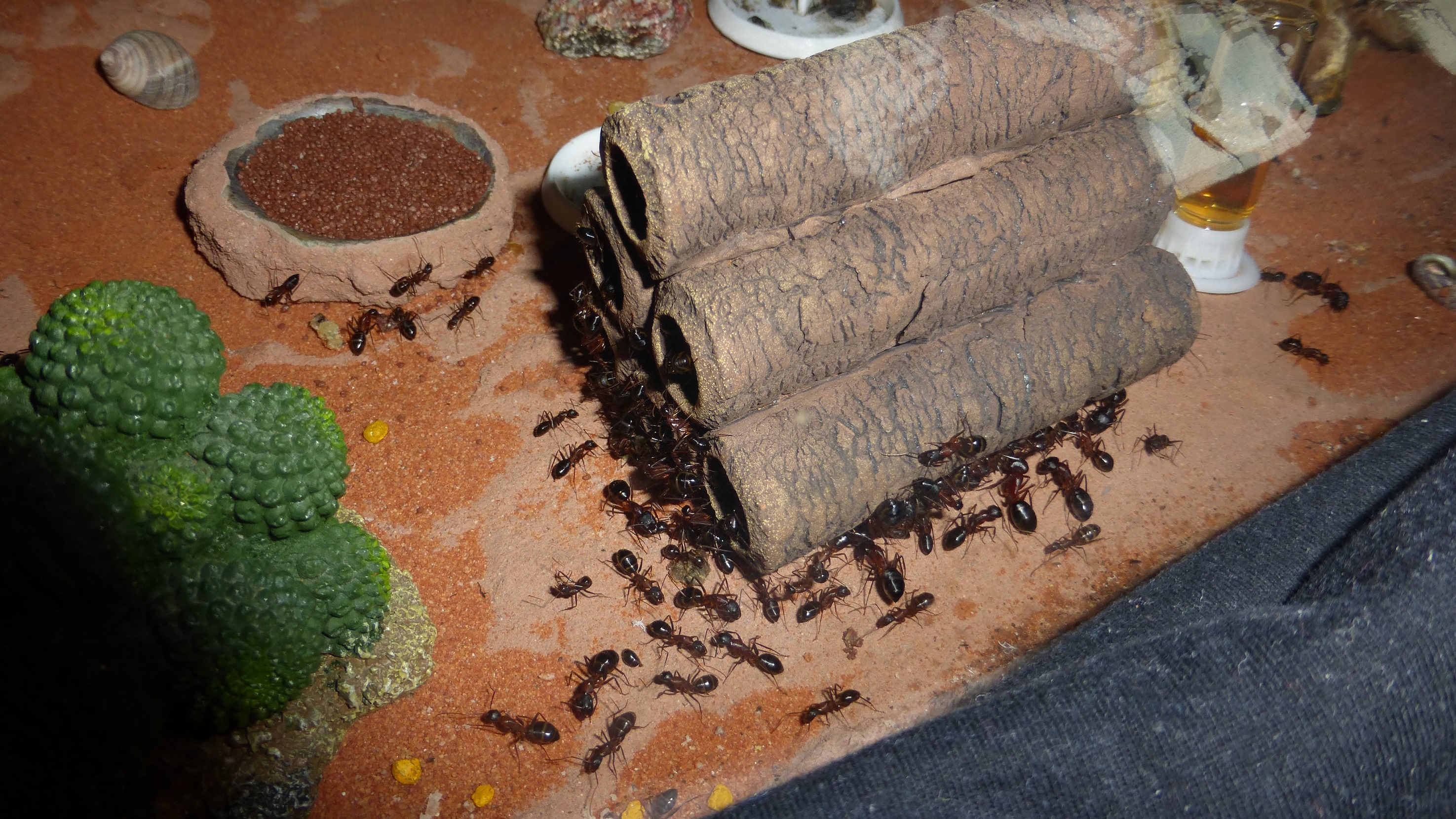Es sind überraschend wenig Ameisen im Nest, viele verbringen die meiste Zeit in den Wasser-RGs oder den Schrimpsröhren der Arena. Tagsüber mag die Arena verlassen aussehen, ist sie allerdings nicht - bin gestern beim putzen aus Versehen gegen eine der Schrimpsröhren gestoßen und ein paar Sekunden später wuselten mehrere hundert sehr aufgebrachte Ameisen durch die Arena und versuchten meinen Pinsel zu vertreiben.