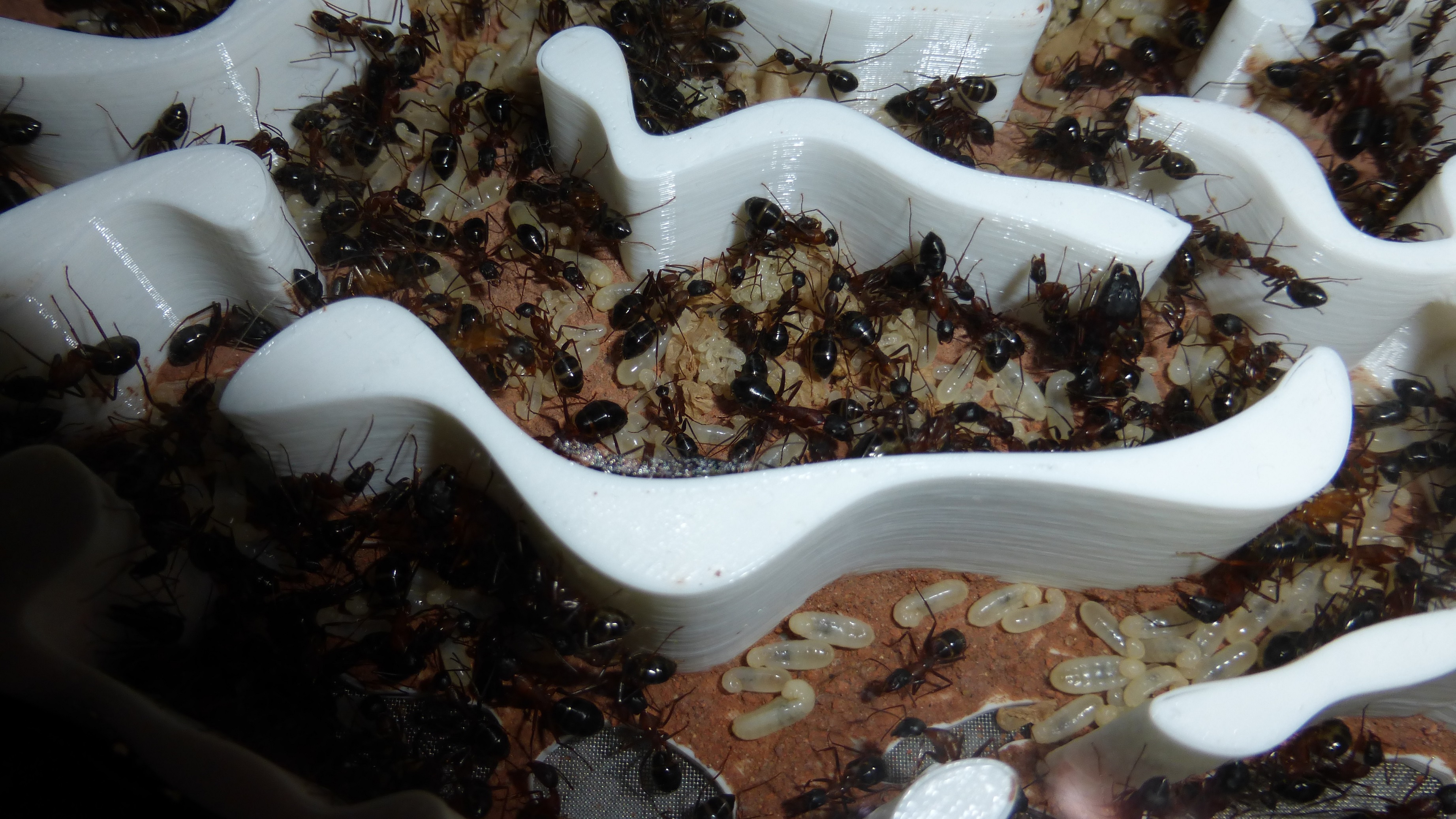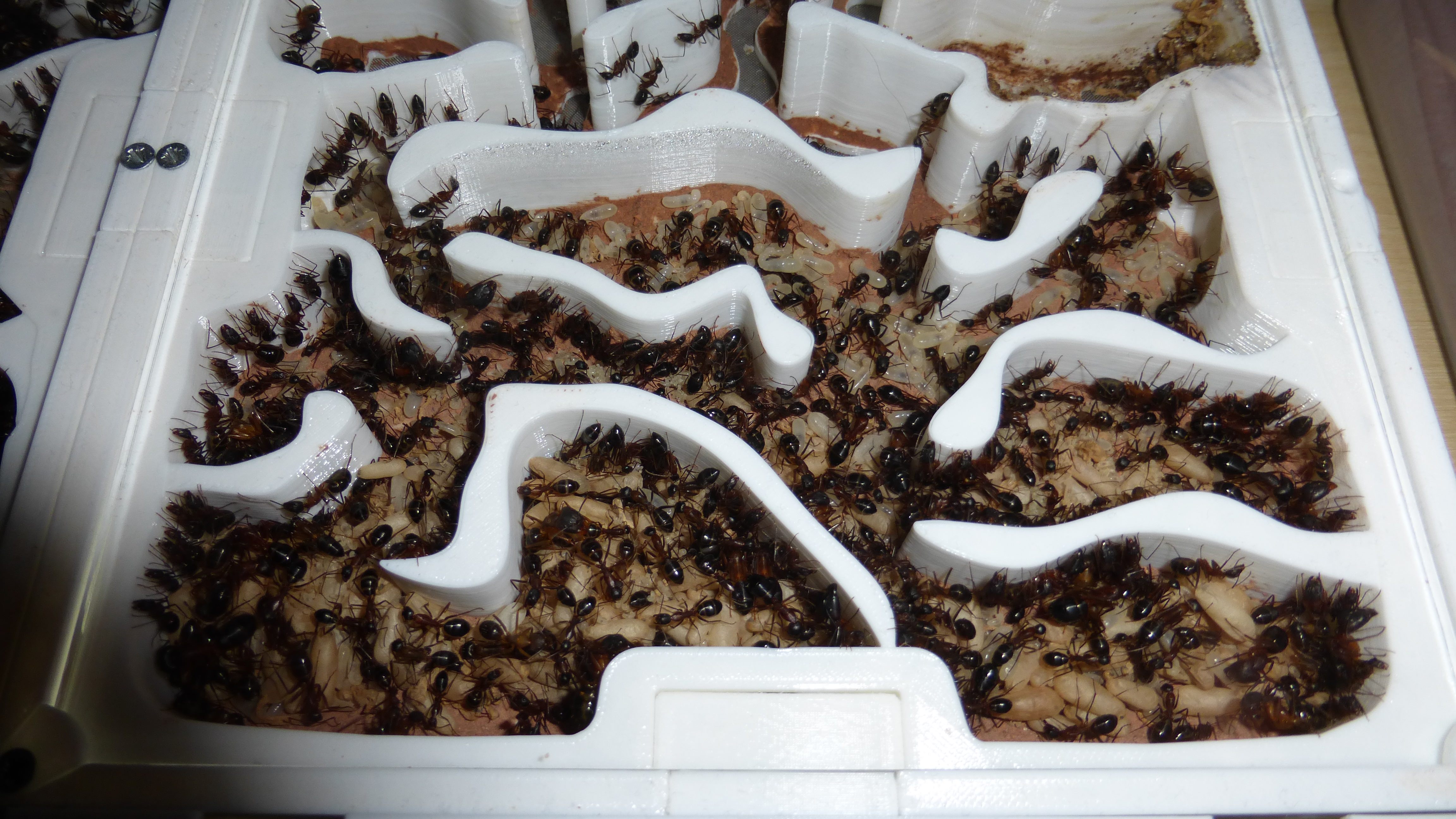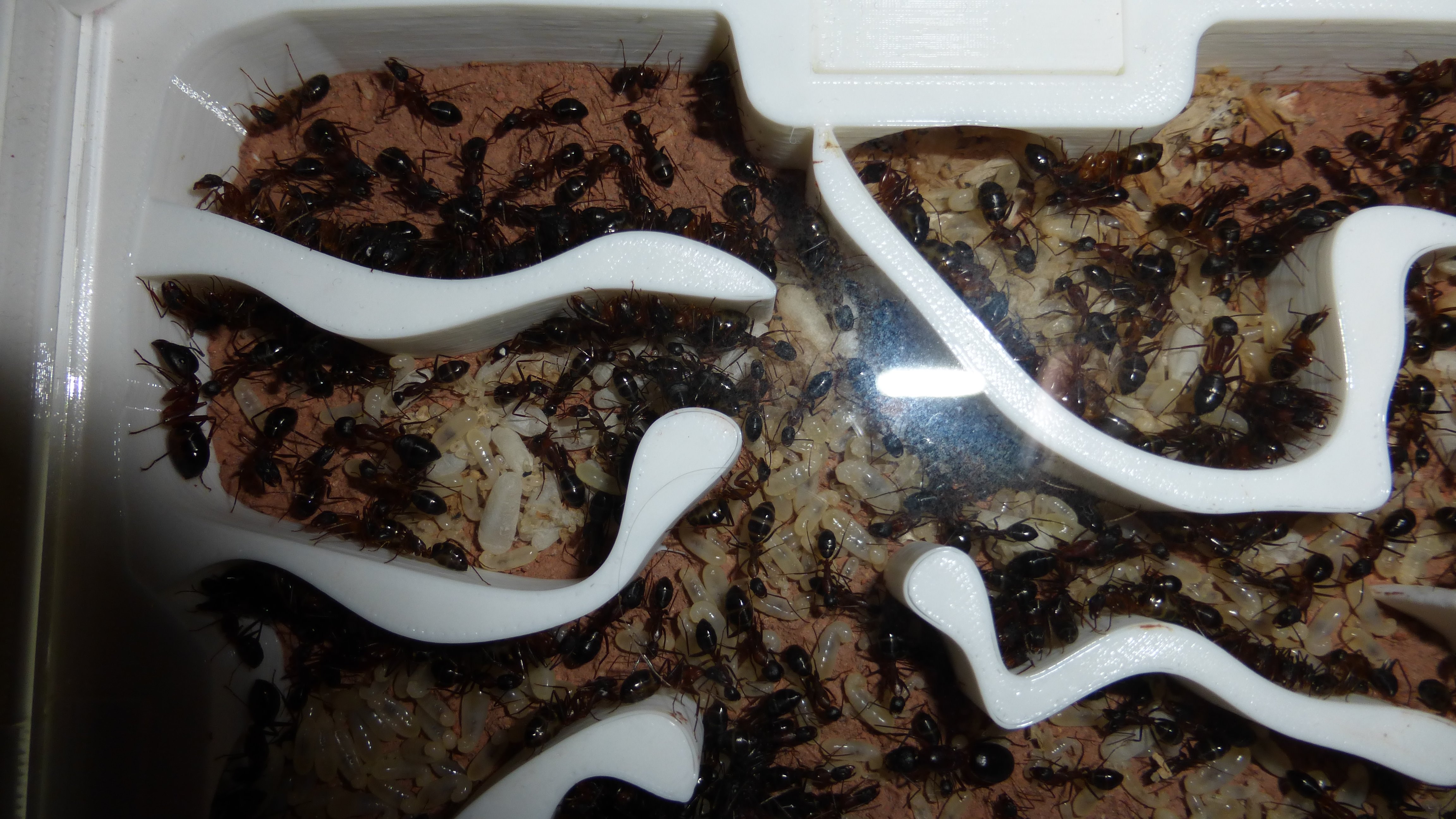Die Kolonie hat eine ziemlich bekloppte Menge an Brut - besonders die Kammer oben links ist richtig voll mit kleinen Larven. Wenn die so weiter machen ist bald das ganze Nest mit Brut vollgestopft.