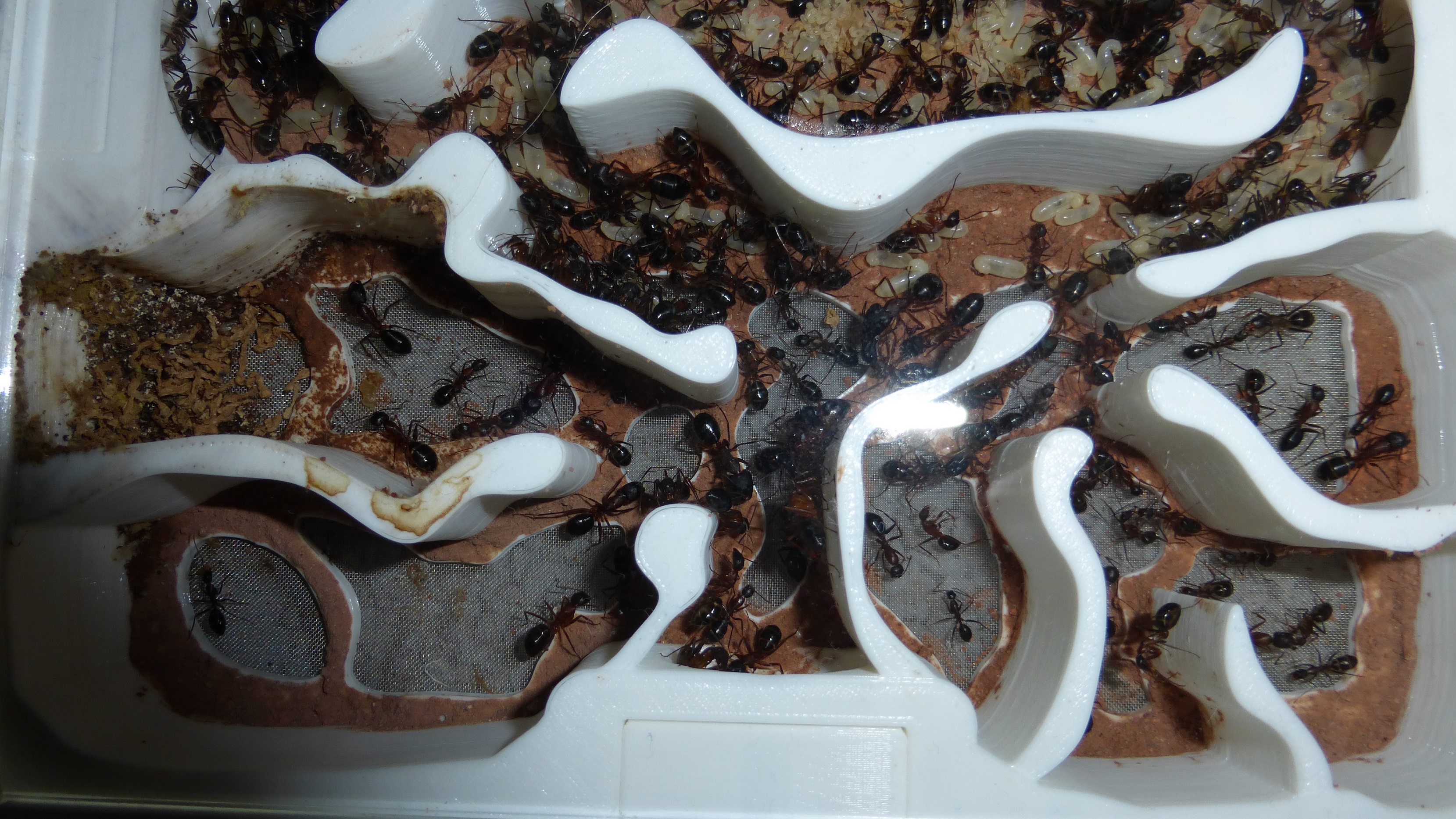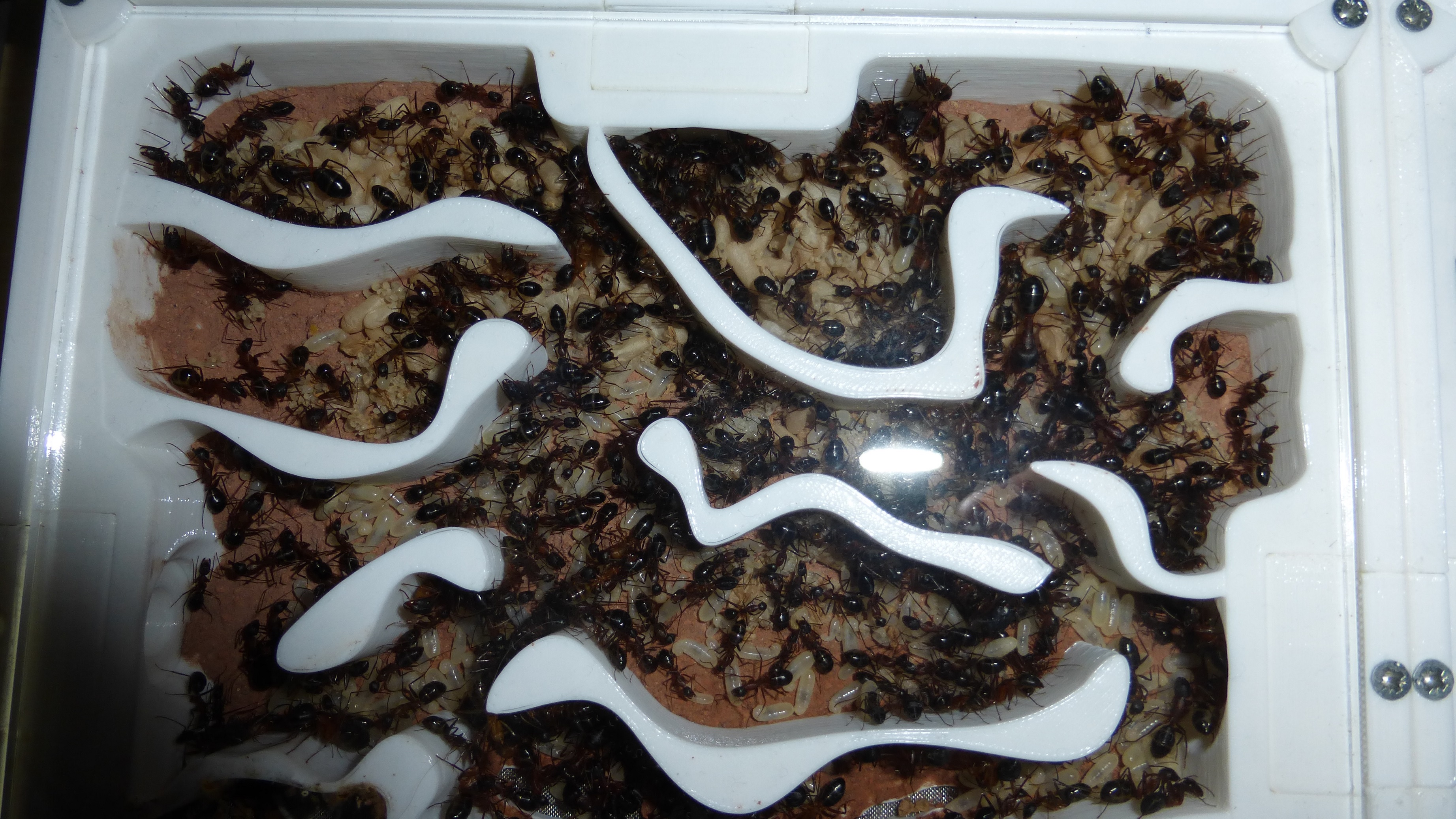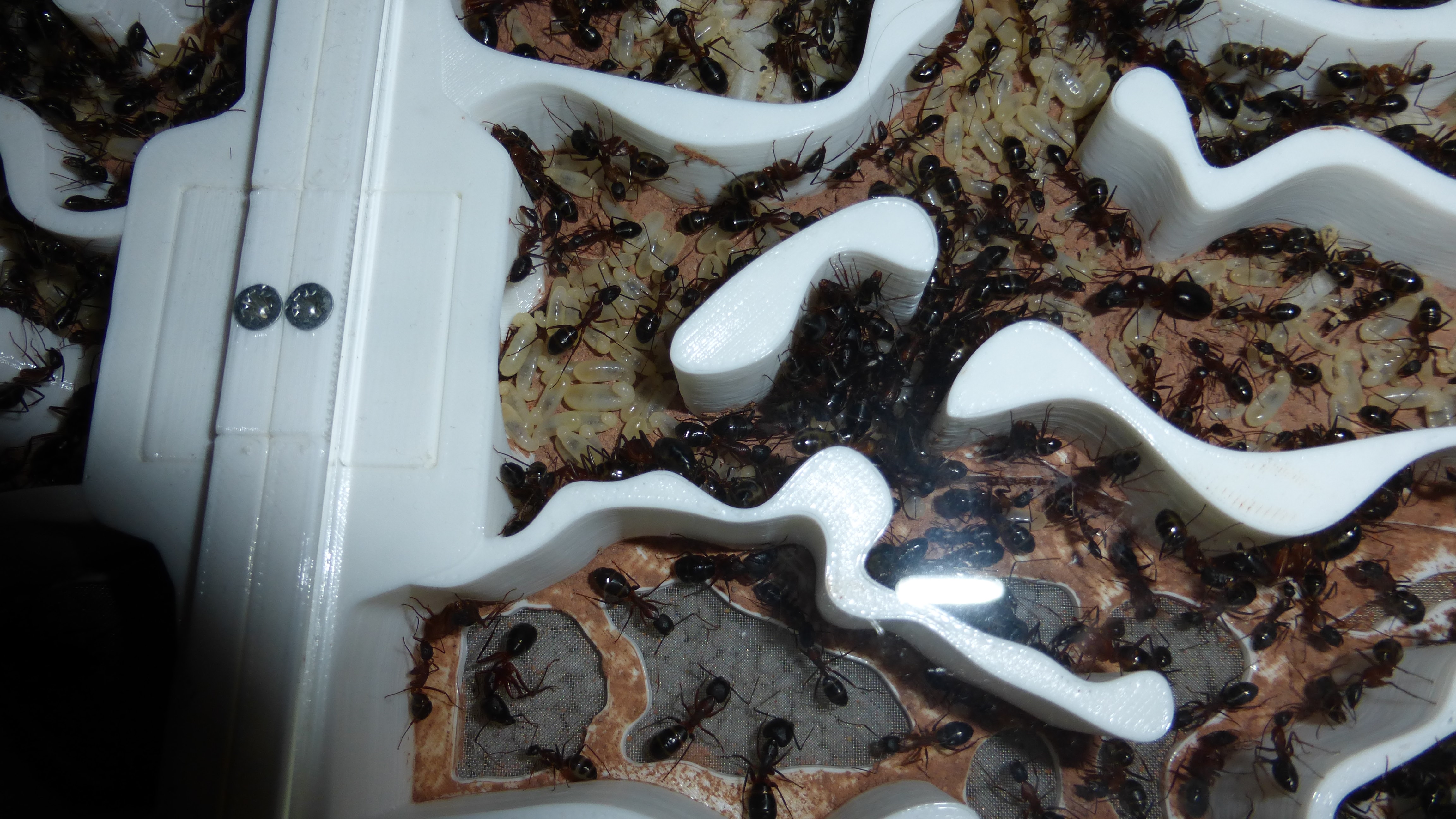 Die Kolonie hat eine ziemlich bekloppte Menge an Brut - besonders die Kammer oben links ist richtig voll mit kleinen Larven. Wenn die so weiter machen ist bald das ganze Nest mit Brut vollgestopft.