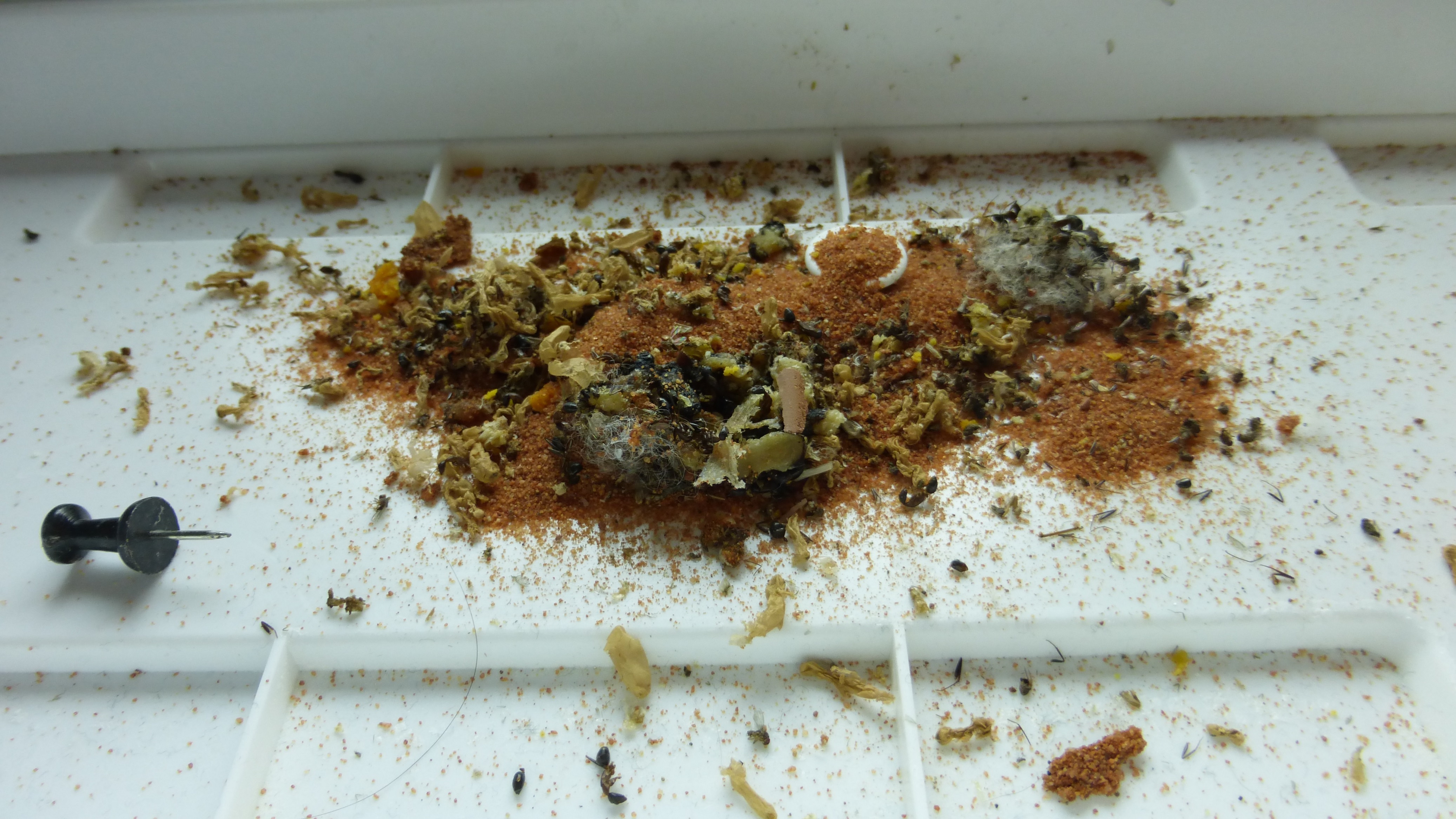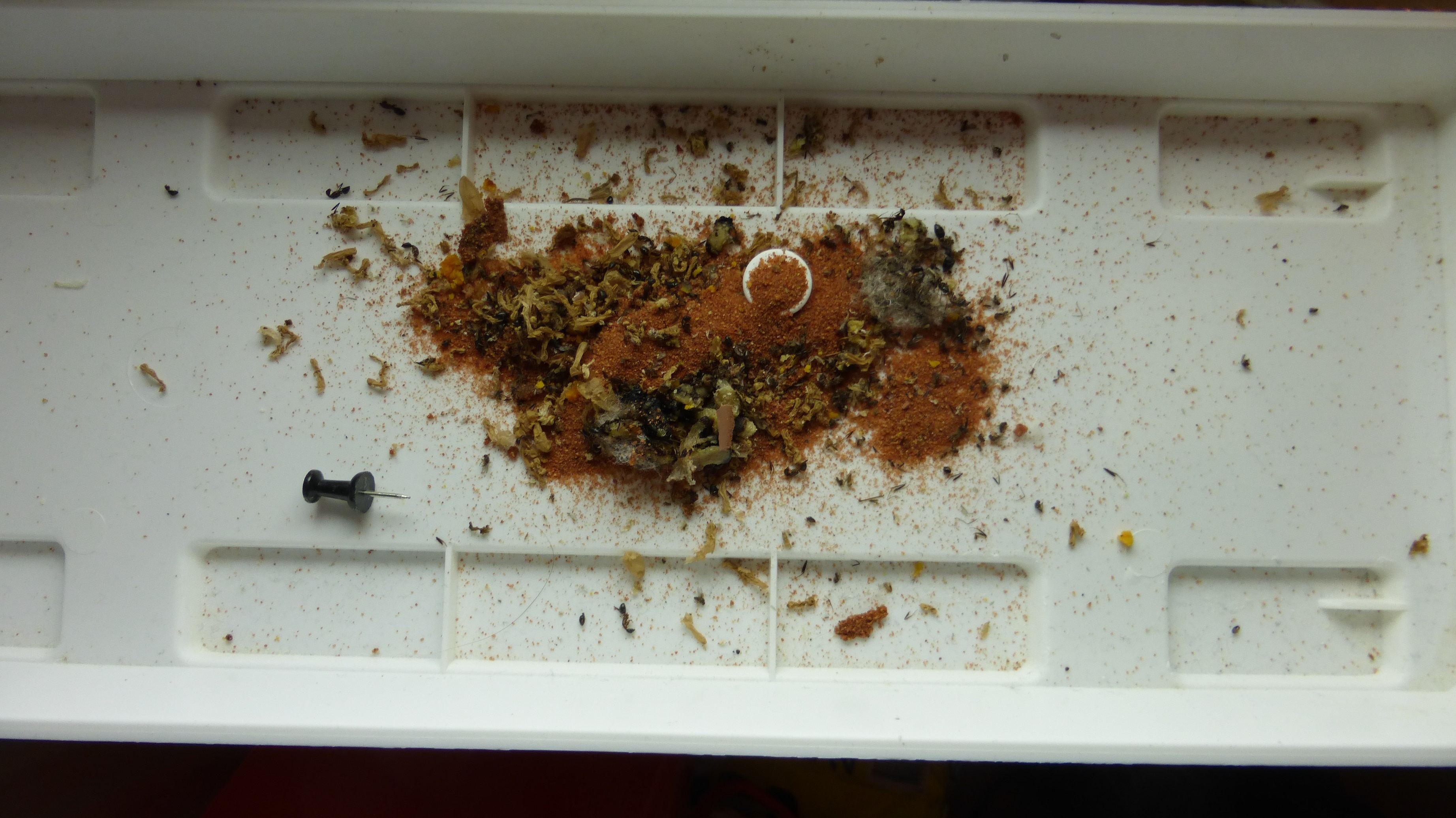 Wieviel Müll kann eine 1000+ Arbeiterinnen große Camponotuskolonie innerhalb von zehn Tagen produzieren? Ne Menge. Die Pinnwandnadel ist zum Größenvergleich. Hab auch aufgegeben die Toten zu behalten, die landen mittlerweile ohne Beine auf dem Müllhaufen, teilweise sogar komplett zerlegt.