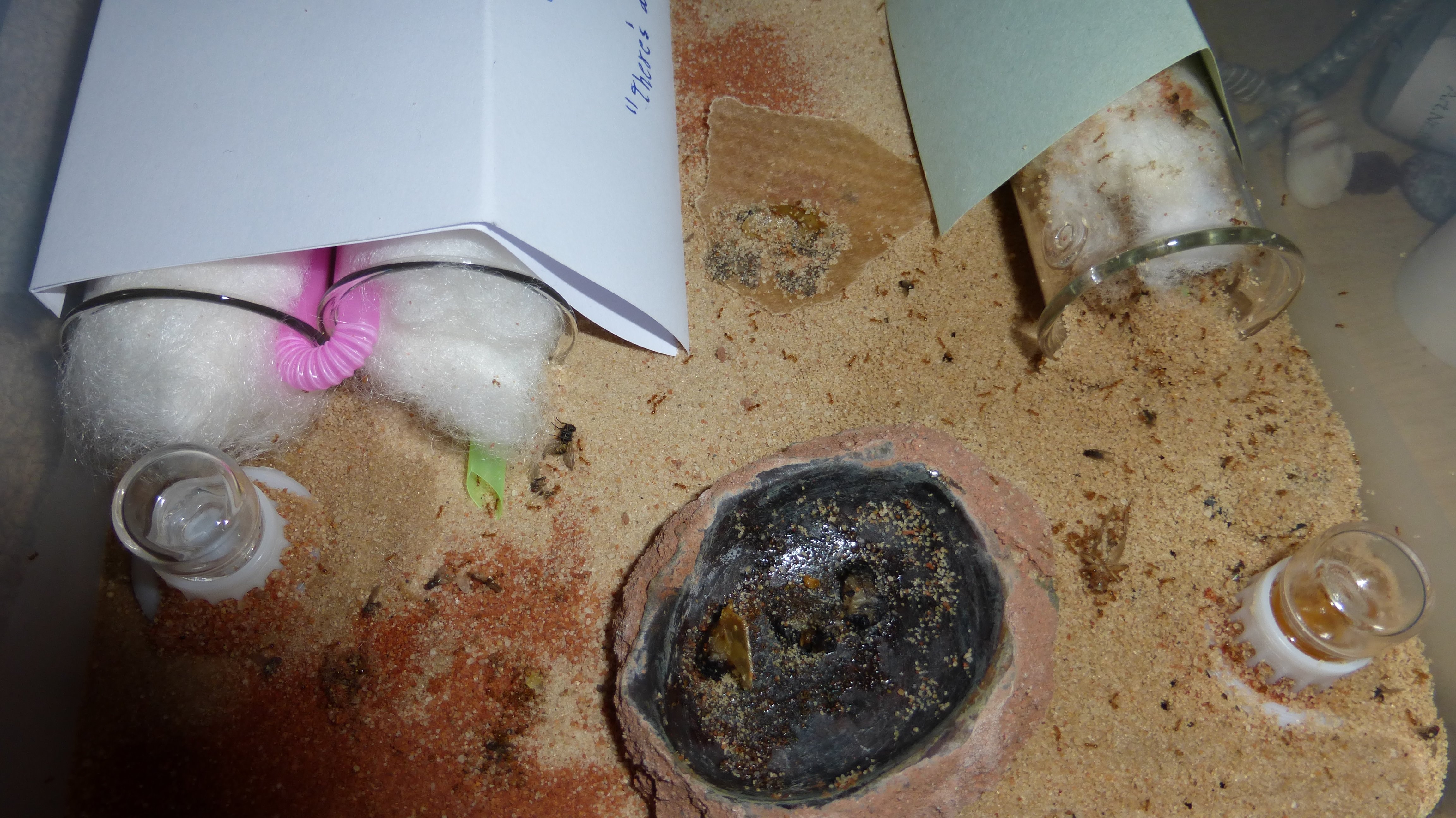 Und da sind sie. Ja, sie haben es geschafft ein mehrere Stockwerke umfassendes Nest in gerade mal 2 Zentimetern Sand zu bauen. Und die Box riecht. Bin mir nicht sicher ob es an den ausgelaufenen Tränken liegt, dem Müll den ich nicht entfernen kann oder an dem Abwehrpheromon, das sie auf ihr Futter schmieren.