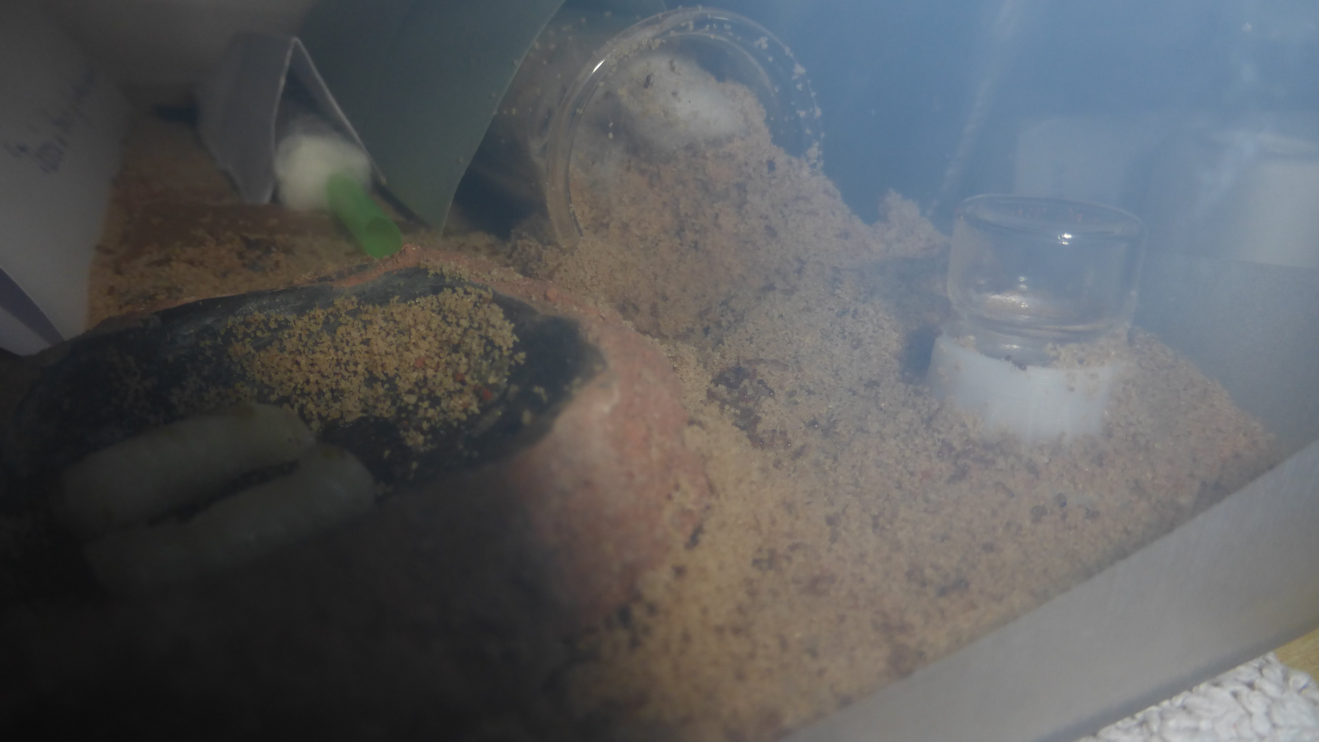 Ich hab mal testweise das Wärmekabel ausgesteckt, aber sie wollen definitiv keine Winterruhe halten - tatsächlich haben sie nach kurzer Zeit angefangen Brut in die Arena zu tragen (in/unter die Schrimpsröhren), weil die Arena näher an der Heizung steht und dadurch wärmer wird als das unbeheizte Nest.