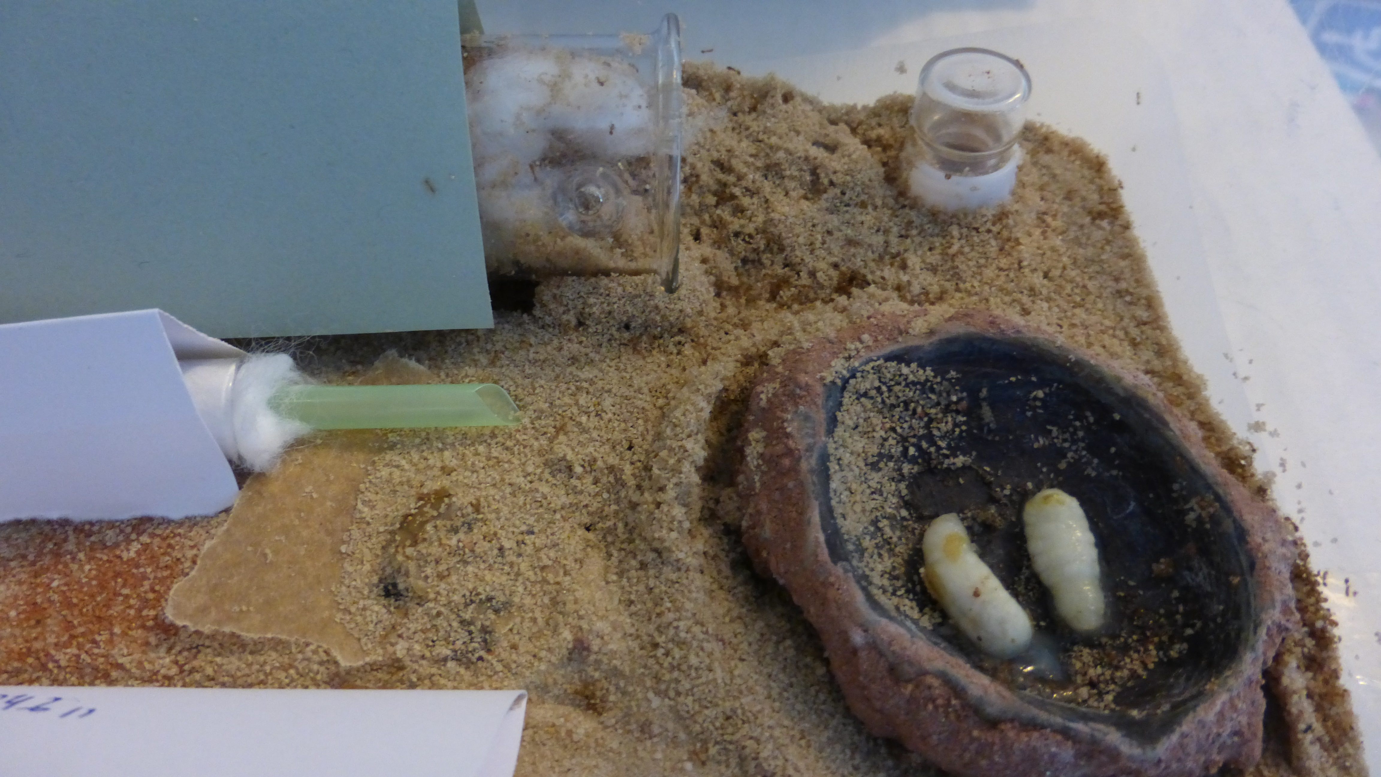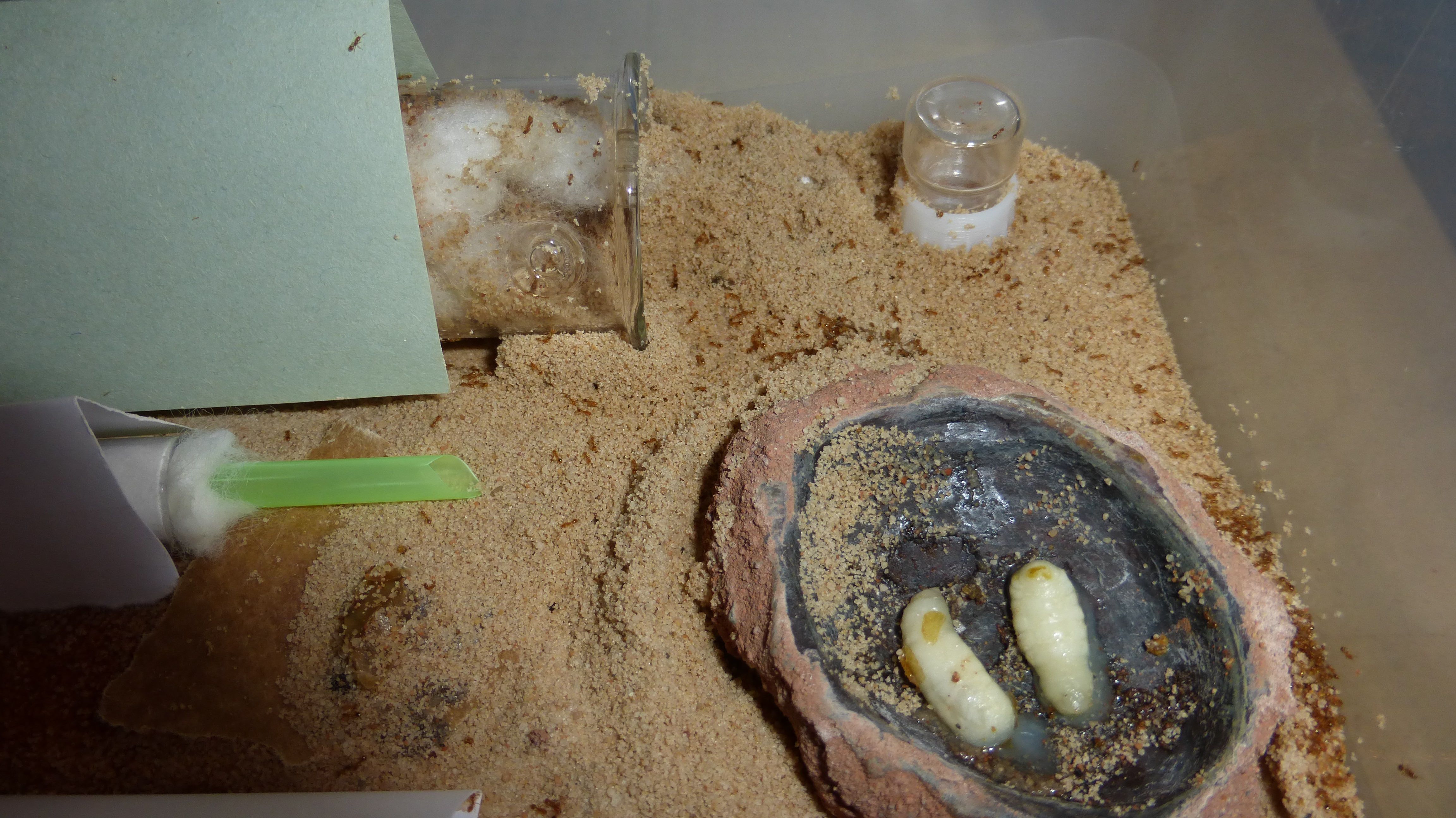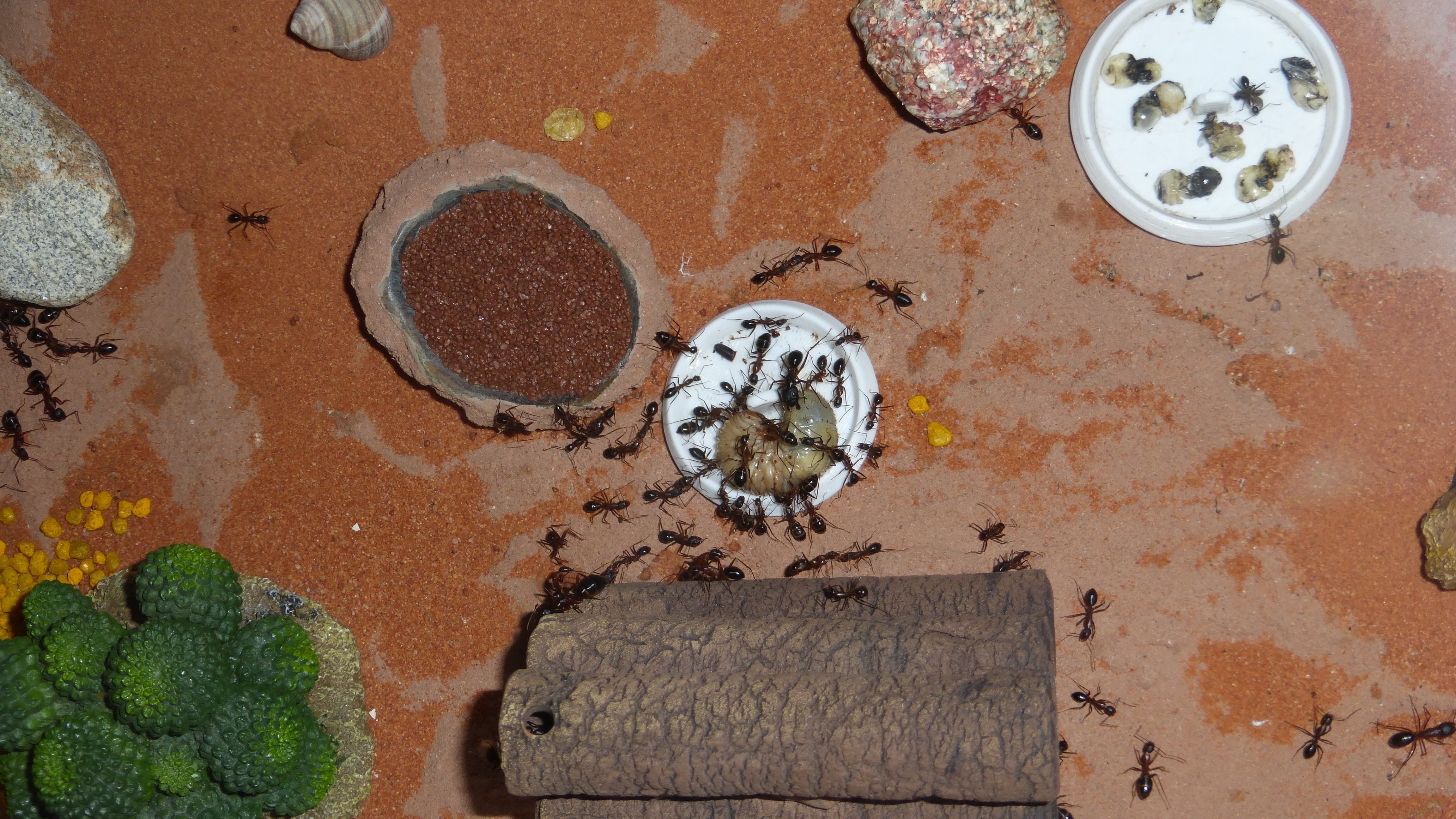 Für die Camponotus gabs heute was besonderes, eine Rosenkäferlarve. Die scheint sehr beliebt zu sein - ist das erste mal dass eine Major in irgendeiner Form am Futter mithilft.