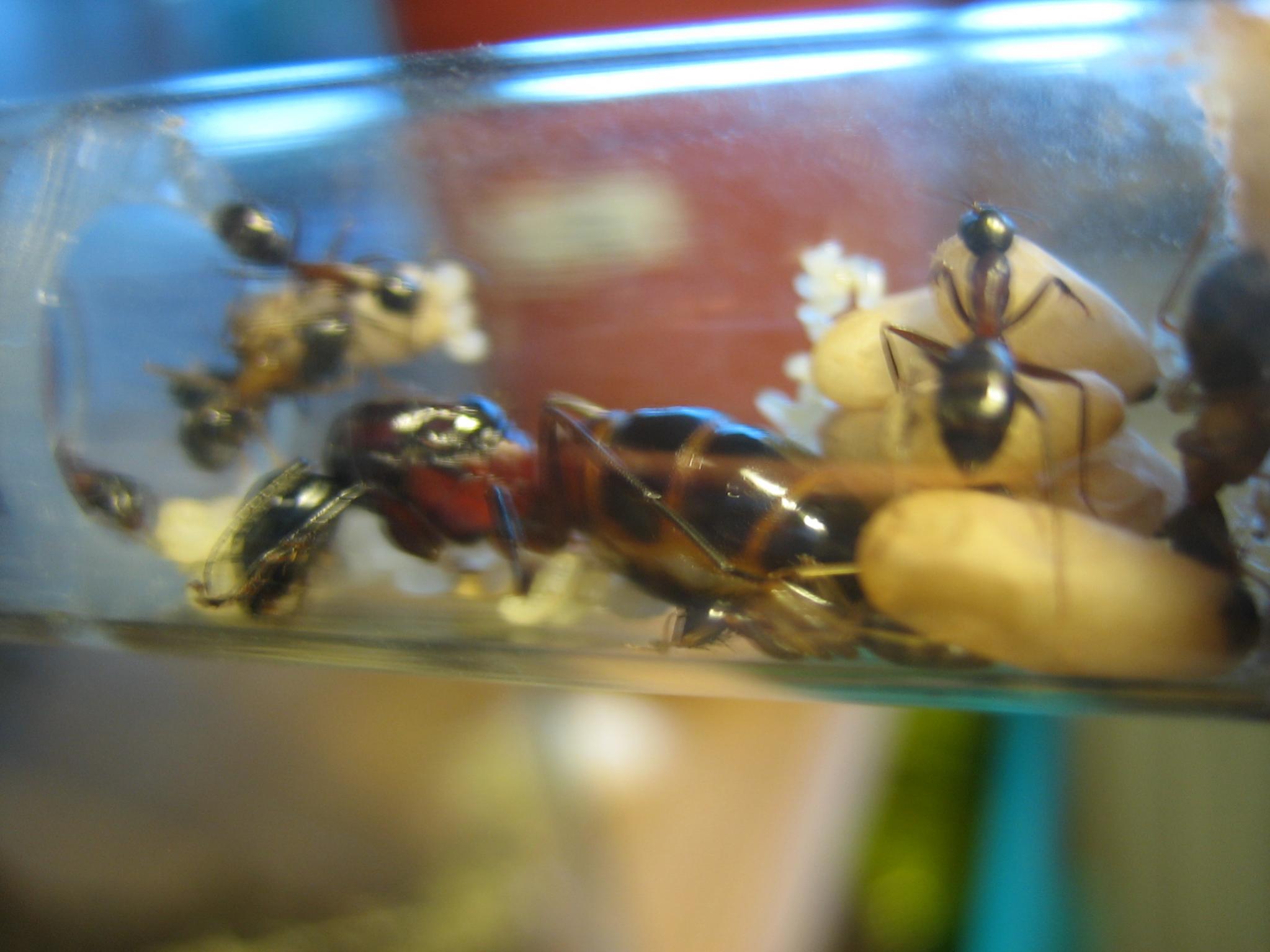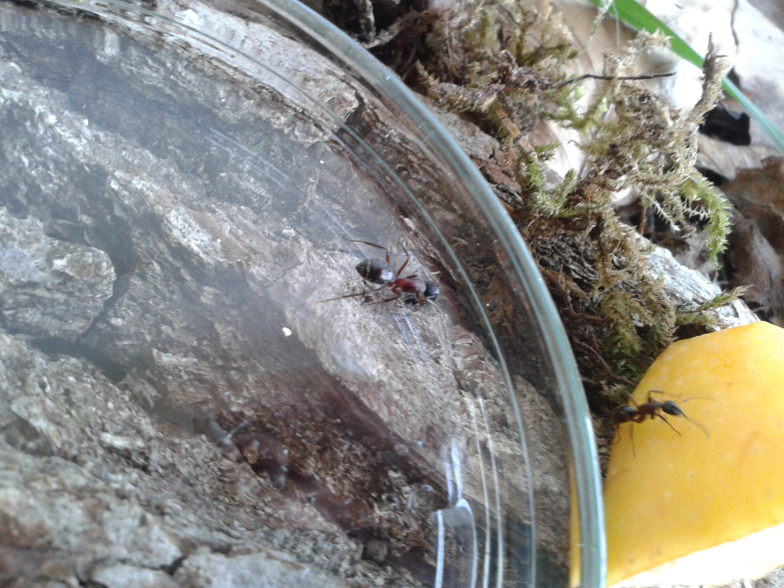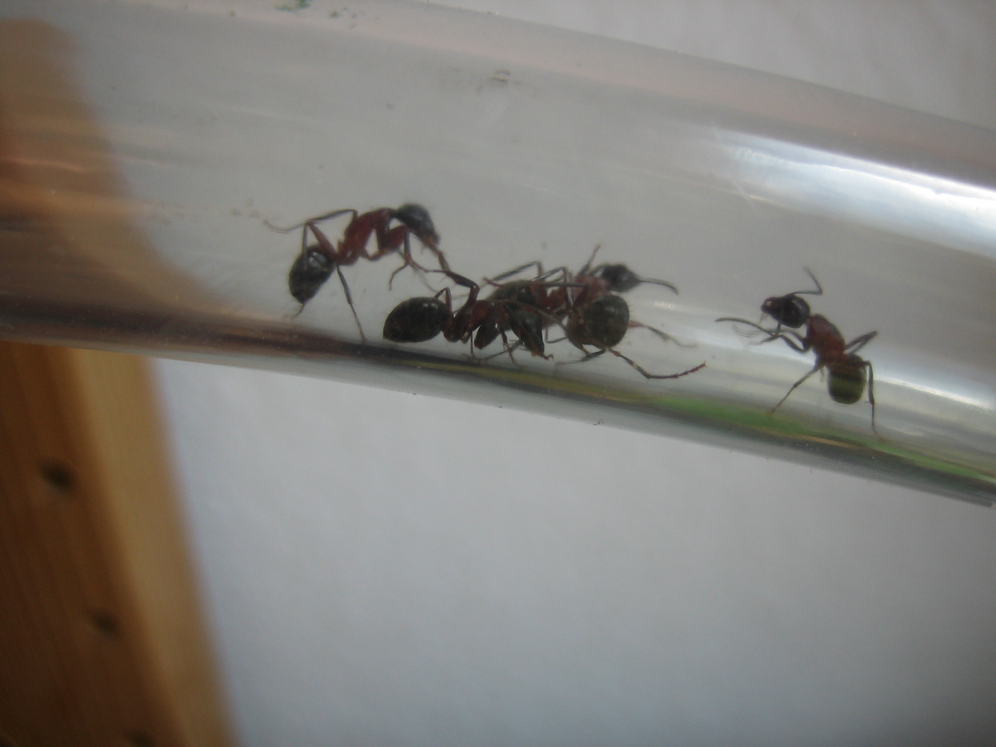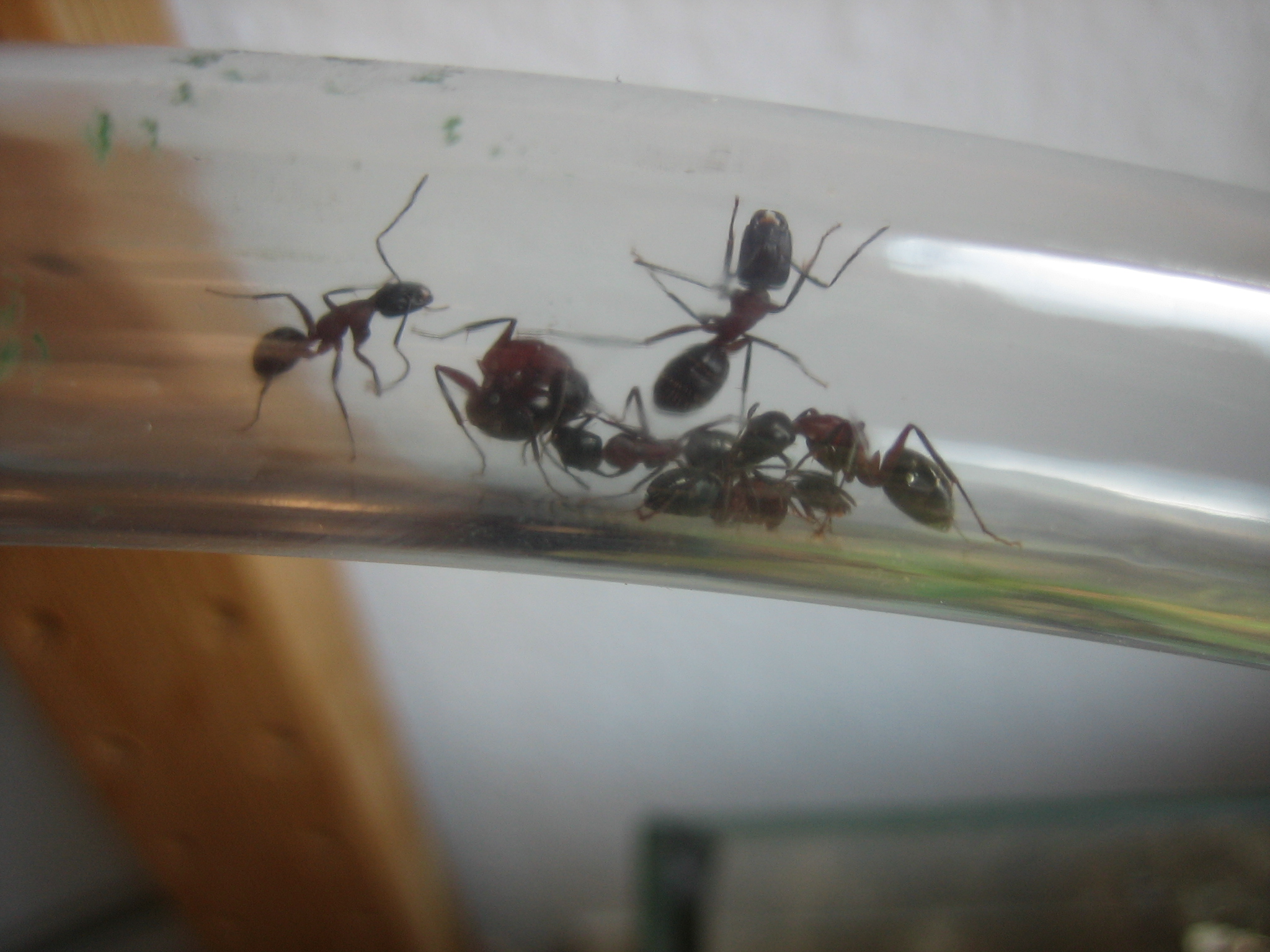 Und mit meinen schönen Temnothorax (das rot abgeklebte in der Arena ist ihr Nest) vertragen sie sich auch, die Camponotus lassen diese sogar in ihr Nest