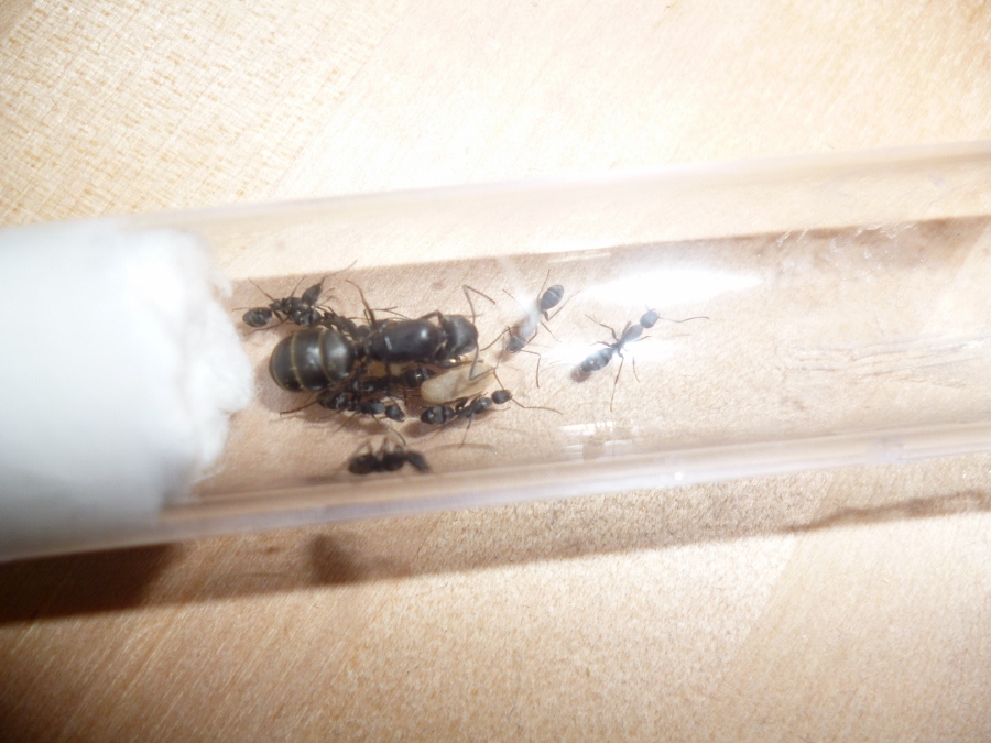Also, neben der Gyne sind es 9 Arbeiterinnen, 1 Puppe und etwa 6-8 kleinere Larven. Ich werde vorerst die Puppe schlĂŒpfen lassen und sie dann in die Winterruhe verfrachten.