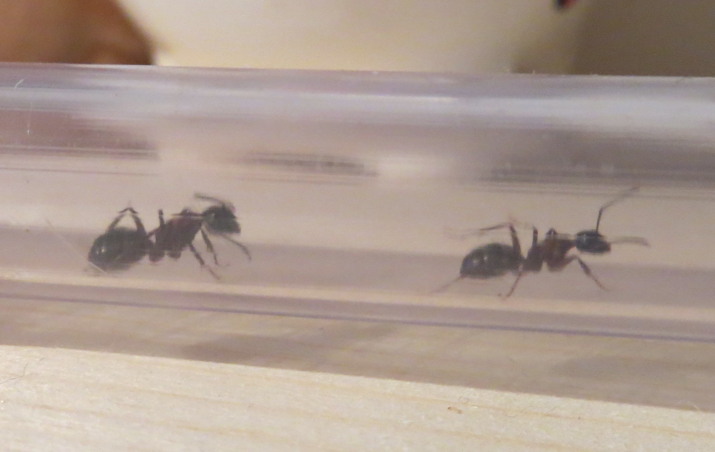 Heute vormittags ist meine neue Ameisenkolonie eingetroffen. Schnell habe ich abends, als endlich Zeit war, die Arena fertiggestellt, an der das Belüftungsgitter noch fehlte. Und die Kleinen nicht wie erwartet in Winterruhe waren, sondern vermutlich wegen dem Transport aufgeweckt durch das Reagenzglas „geflitzt“ sind. Kaum war das Reagenzglas, in dem ich die Kolonie vorerst halten möchte, an die kleine Arena, einer Plexiglasbox, angeschlossen, hat auch schon die erste Ameise den Schlauch erkundet. Nach kurzer Zeit hat die halbe Kolonie die Arena durchforstet. Leider sind die kleinen während meiner Beobachtungsfase nicht auf die Idee gekommen, in den Kronkorken mit dem Honigwasser zu sehen. Es hat sich jedoch etwas anderes lustiges ergeben. Anscheinend ist eine kleine Spinne in die Arena eingezogen und dort verendet. Trotz ihrer Leblosigkeit hat es die Spinne geschafft die Arbeiterinnen mehrmals so zu erschrecken, dass diese den Rückzug antraten.