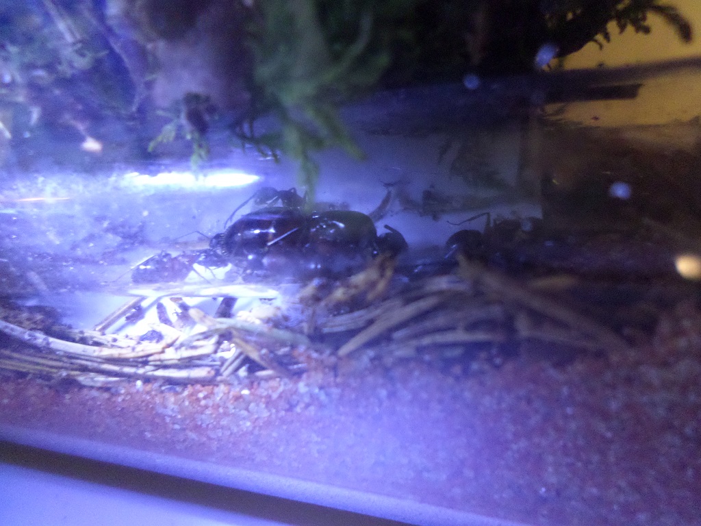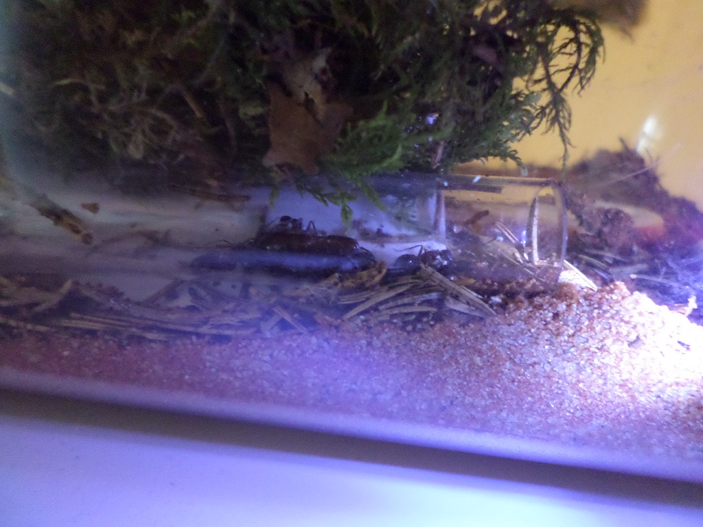 Ich hab mich fĂŒr den direkten Anfang fĂŒr eine Arena/Nest Kombi entschieden. Das ganze besteht aus einem Plastikfaunarium fĂŒr Reptilien mit einem nĂŒtzlichen Klappdeckel. Der Deckel liegt so in einer Fuge das man von Innen nicht darunter bzw. Zwischen Deckel und Rahmen krabbeln kann. Die unzĂ€hligen Luftgitter hab ich mit doppeltem Insektenschutzgitter abgedeckt und alles großzĂŒgig mit heißkleber angeklebt. So, der Bodengrund besteht aus einer 2 cm starken trockenen Sandschicht und darĂŒber eine 3 cm dicke Schicht aus tannen/fichten nadeln , Moos und allem was ich so am Waldboden finden konnte.