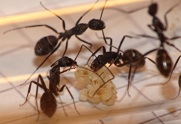 Winterruhe: Bis jetzt zeigt die Kolonie keine Anzeichen für eine Vorbereitung auf die WR: Es werden weiterhin Eier gelegt sowie Brut aufgezogen und dadurch bedingt auch weiterhin Proteine angenommen. Auch wenn diese Art einen endogen gesteuerten Zyklus haben soll, werde ich Anfang Dezember die Heizfolie entfernen und die Kolonie in einen vorwiegend nicht geheizten Raum verbringen.