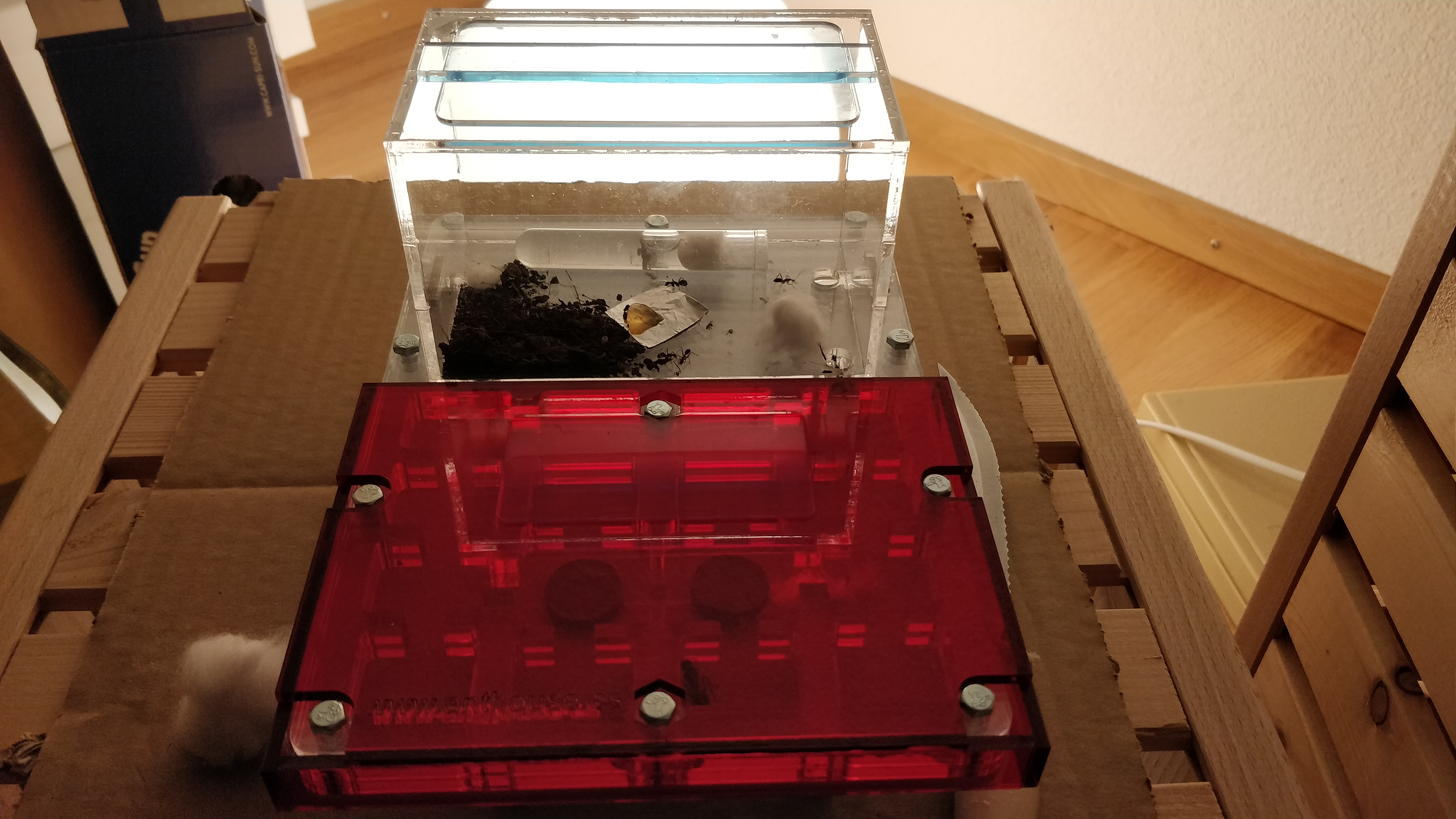 Obwohl mir das Setup theoretisch sehr gut gefällt, zeigt sich nun auch ein Problem, das durch die Konstruktion entsteht: Wenn ich den Deckel der Aussenwelt hebe und/oder etwas reinlege, scheinen die Vibrationen bis in das Nest zu dringen und die