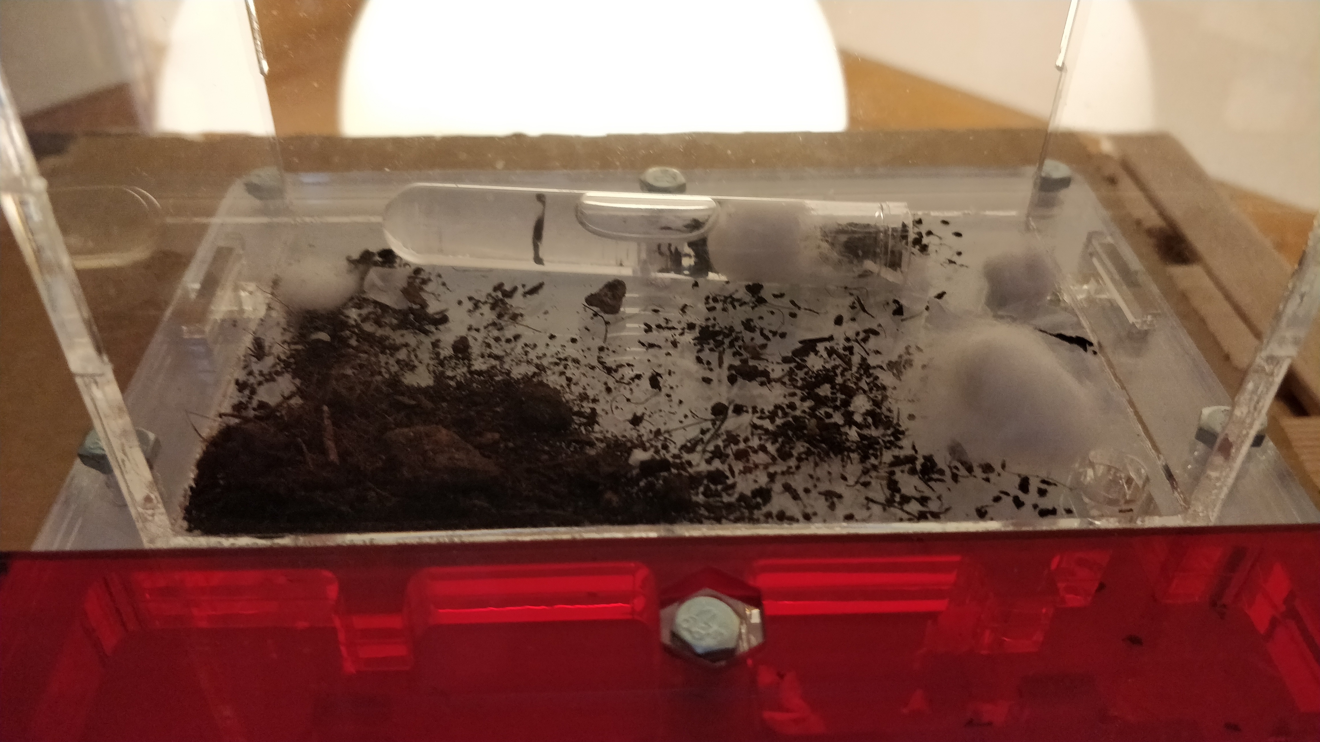 Heute habe ich die Kolonie aus derWinterruhe geholt. Glücklicherweise sind alle Arbeiterinnen und die Königin wohlauf. Ich habe auch etwas die Outworld für die Ankunft der Kolonie eingerichetet. Dabei habe ich eine kleine Test-Tube reingelegt, welche mit Zuckerwasser gefüllt ist. Zusätzlich habe ich zerpflückte Taschentücher als Baumaterial hinzugegeben. Ebenfalls habe ich bereits einen Tropfen eines neuen Bio-Honigs und einen Mehlwurm angeboten.