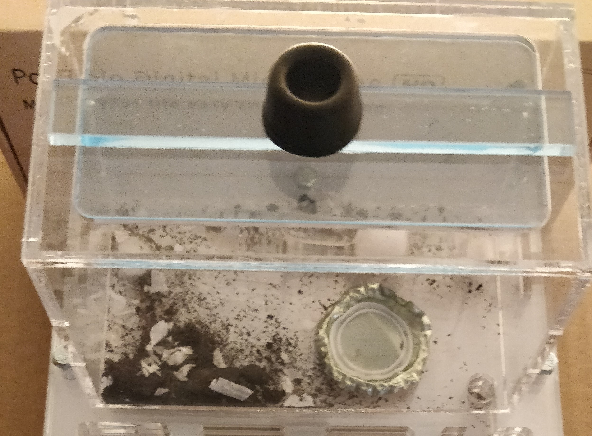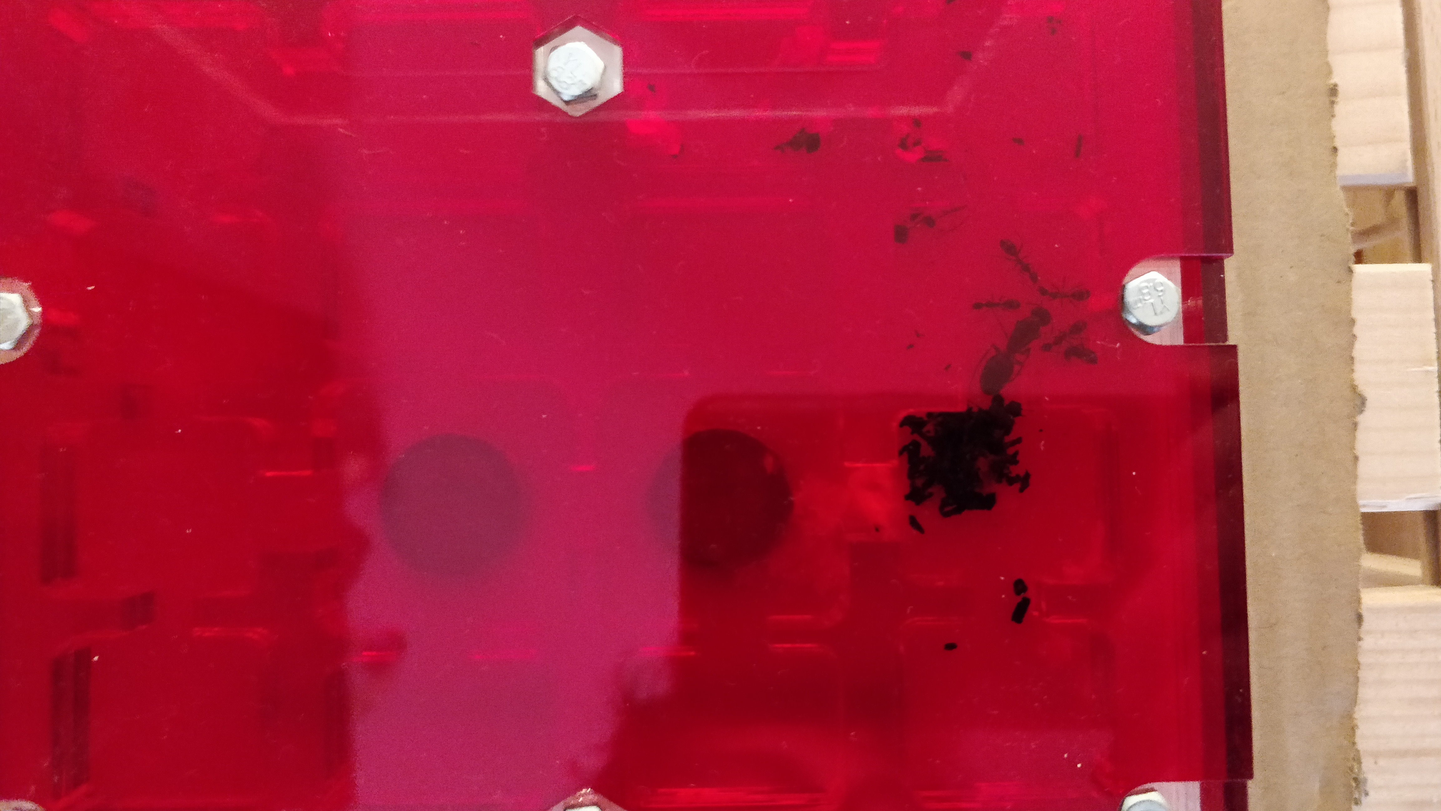 Ich habe etwas daran gearbeitet, die Kolonie beim Öffnen der Aussenwelt nicht mehr so sehr durch Erschütterung zu stören: Auf den Deckel habe ich eine Art Griff geklebt und den Kronkorken habe ich so bearbeitet, dass er sowohl leicht betretbar für die Ameisen als auch leicht mit einer Pinzette herausnehmbar ist. Seit ich damit weniger Erschütterungen erzeuge, ist dieKönigin auch wesentlich ruhiger. Interessanterweise scheint ihnen Licht weniger auszumachen, als gedacht. Denn heute war ich etwas mutig und habe ganz vorsichtig das rote Plexiglas vom Nest angehoben und es hat die Kolonie gar nicht gestört. Dadurch konnte ich tolle Bilder machen, welche ich mit euch teilen möchte: