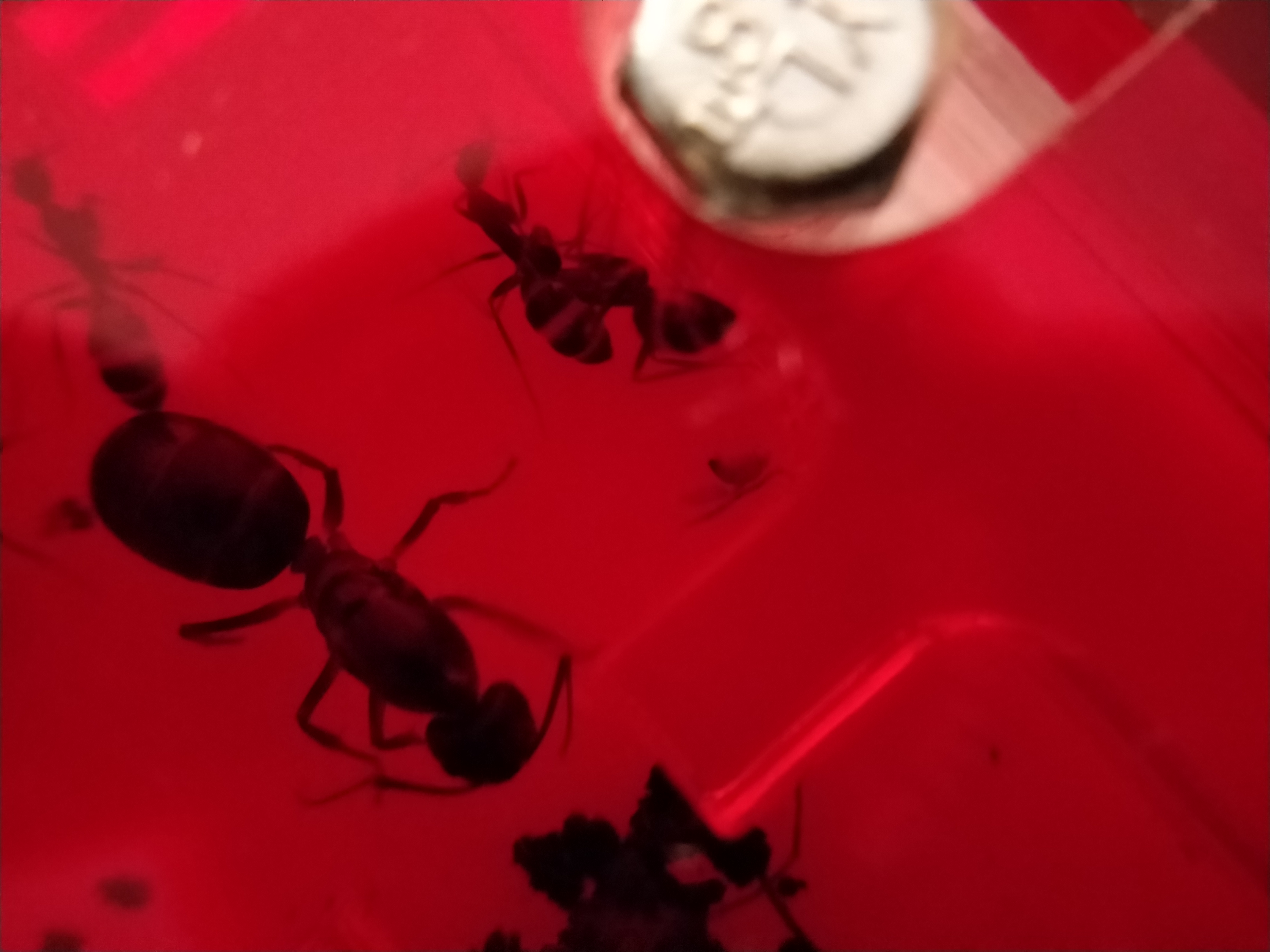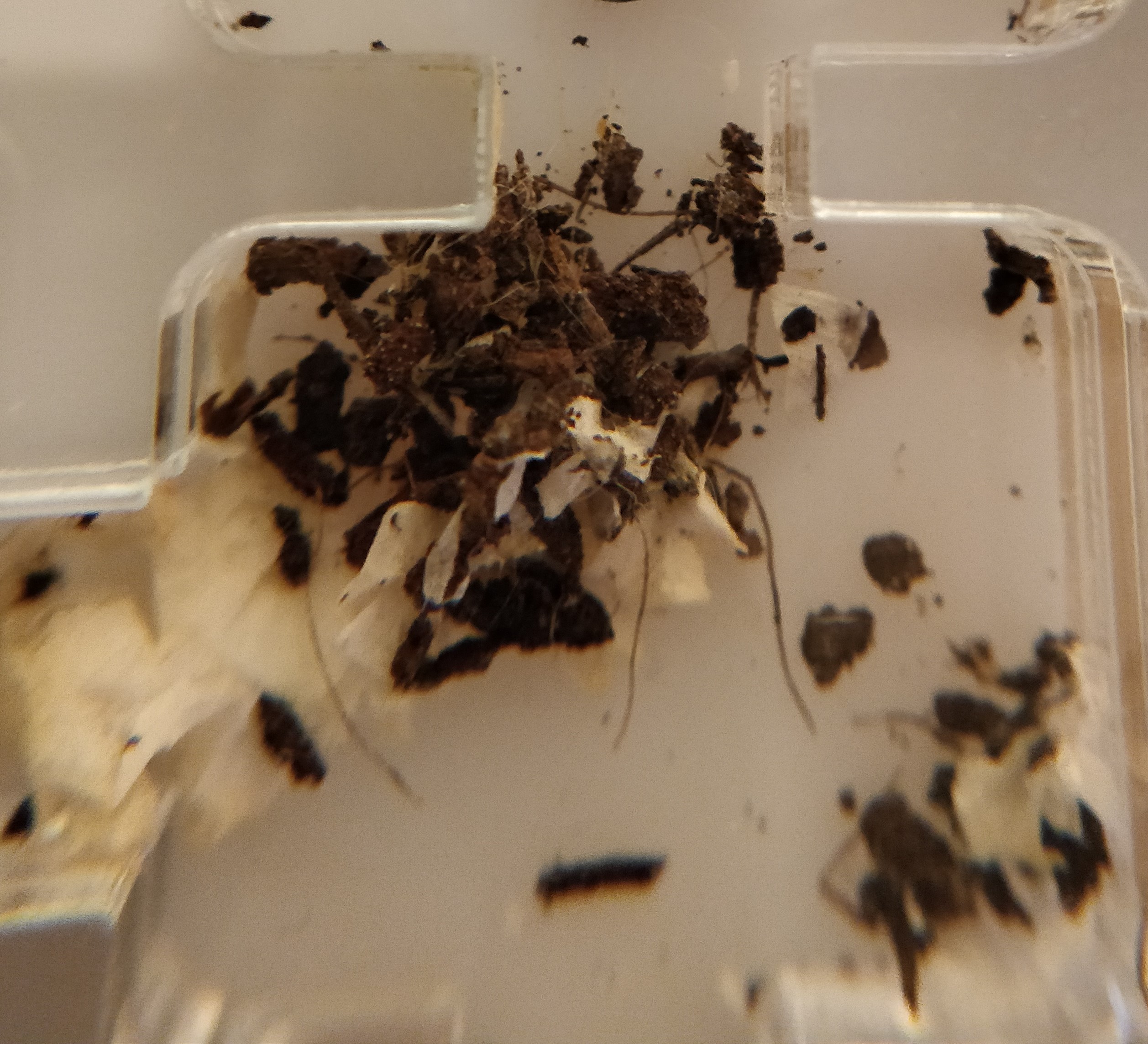 Zusätzlich würde ich euch gerne ein Update zu meiner Kolonie geben und ich muss sagen, ich bin sehr happy! Es scheint als wäre Nachwuchs unterwegs. Aber alles der Reihe nach. Ich habe der Kolonie anfangs öfters einen zerschnittenen Superworm angeboten, welcher eher zögerlich angenommen wurde. Seit es wärmer ist, konnte ich aber bereits eine Motte und eine fette Hausfliege fangen, abkochen und ebenfalls anbieten. Diese scheint wesentlich lieber angenommen zu werden. Wahrscheinlich ist es für die kleine Kolonie noch leichter als sich mit demChitin des Superworms auseinander zu setzen. Oder der Proteinbedarf hat sich erst kürzlich eingeschaltet (durch die wärmeren Bedingungen und damit verbundene Expansion der Kolonie).
