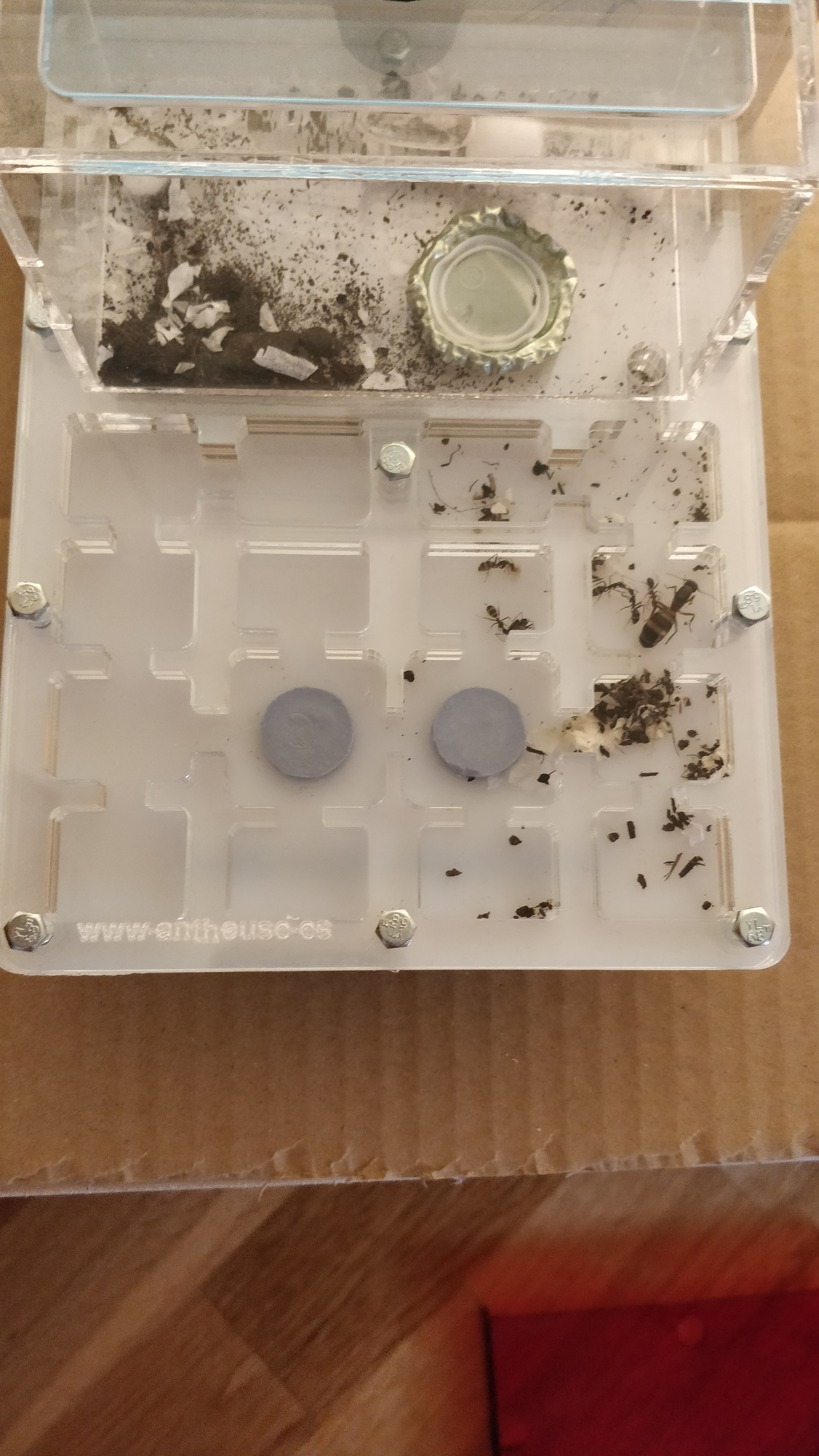 Ich habe etwas daran gearbeitet, die Kolonie beim Öffnen der Aussenwelt nicht mehr so sehr durch Erschütterung zu stören: Auf den Deckel habe ich eine Art Griff geklebt und den Kronkorken habe ich so bearbeitet, dass er sowohl leicht betretbar für die Ameisen als auch leicht mit einer Pinzette herausnehmbar ist. Seit ich damit weniger Erschütterungen erzeuge, ist die