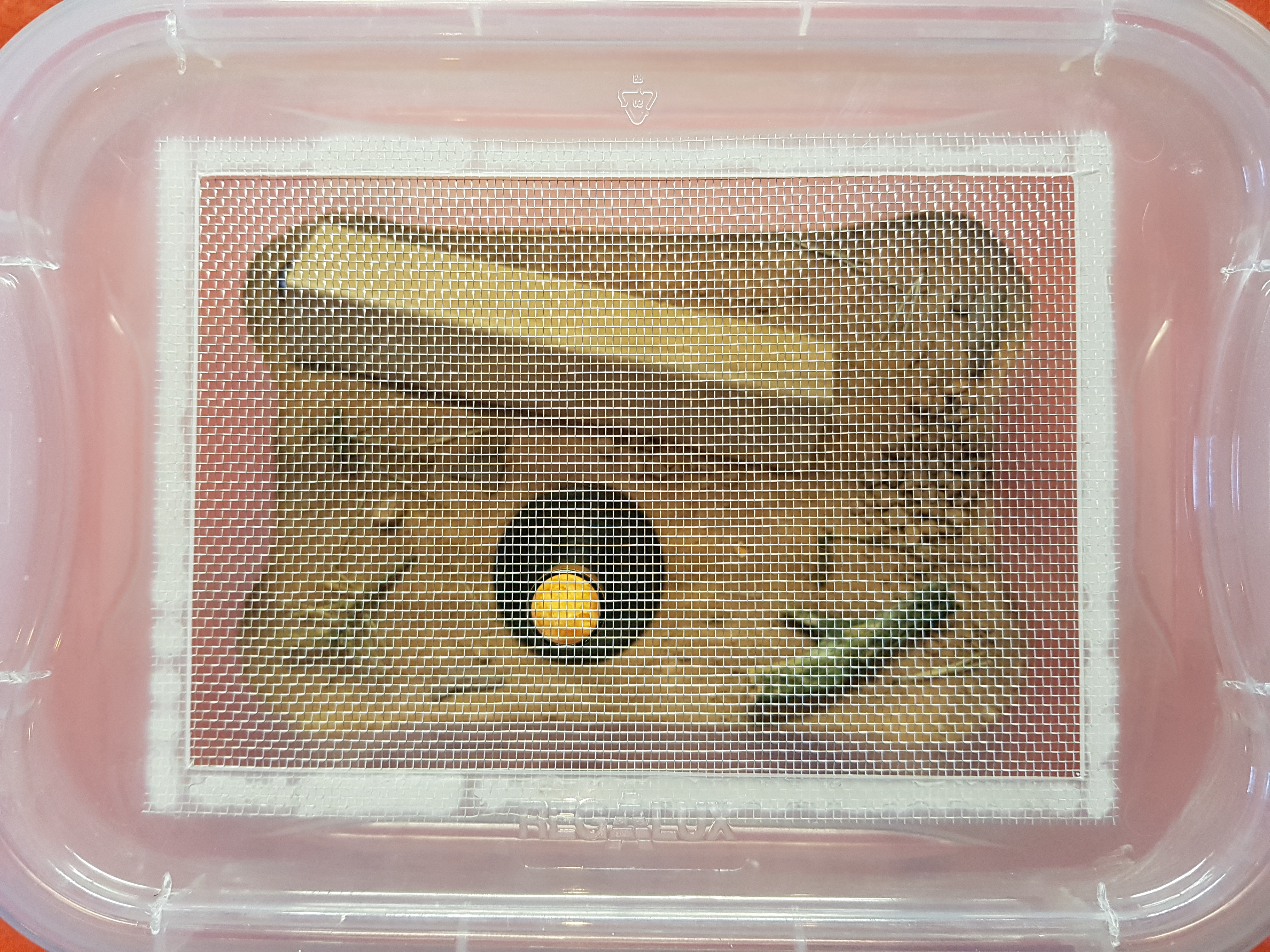 Als Ausbruchsschutz dient Talkum und damit gute Ventilation herrscht, ohne dass ungebetene Gäste hinein können, habe ich den Deckel mit Fliegengitter