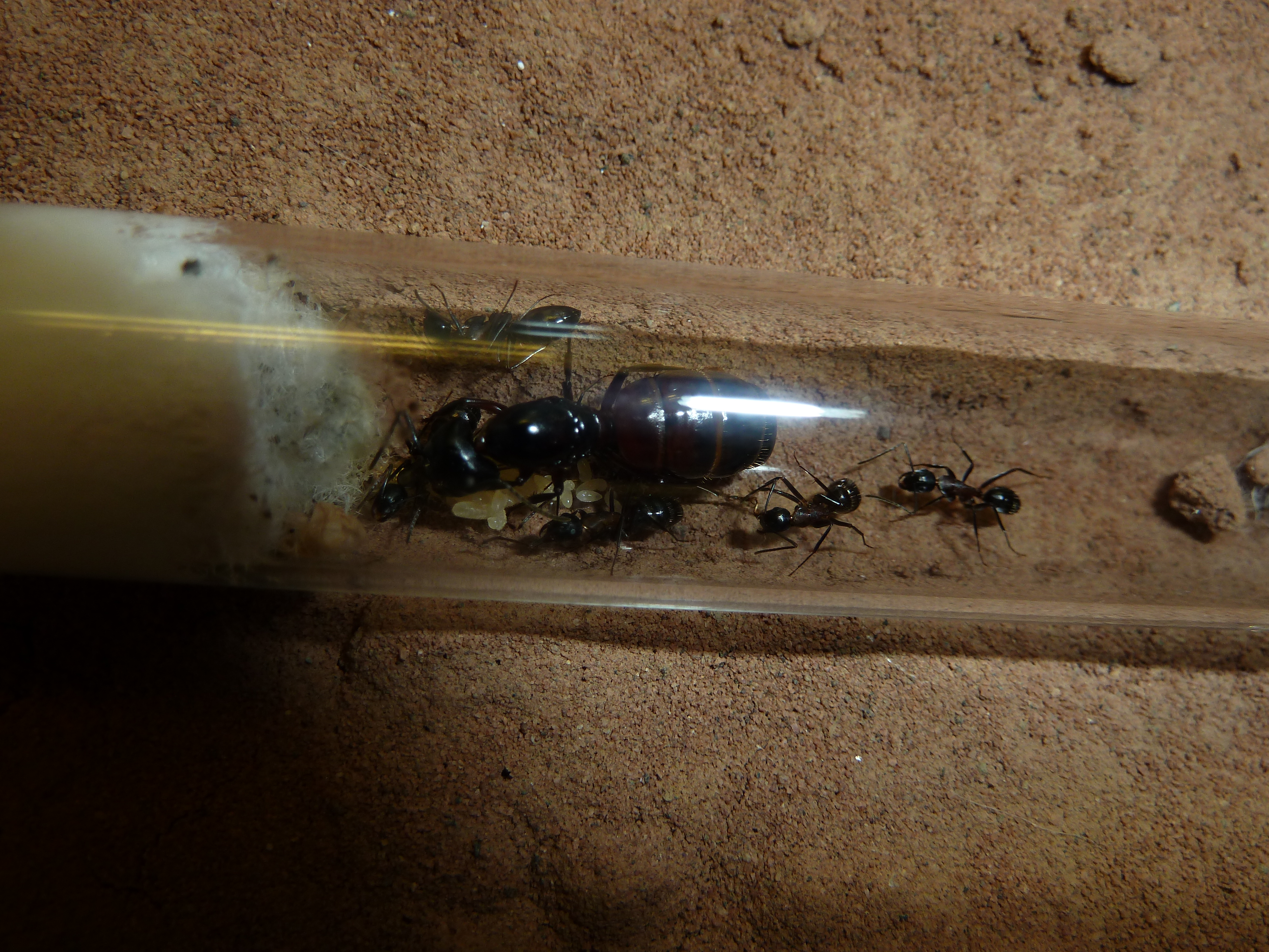 Jetzt sind sie wieder oben auf dem Schrank und können in aller Ruhe ihr neues Zuhause erkunden. Wenn alles glatt läuft, bekommen sie nächstes Jahr ihr eigenes Formicarium mit externem Nest. Mal sehen, ob die neuen Eier, welche die Gyne vor kurzem gelegt hat, noch dieses Jahr zu Arbeiterinnen werden.