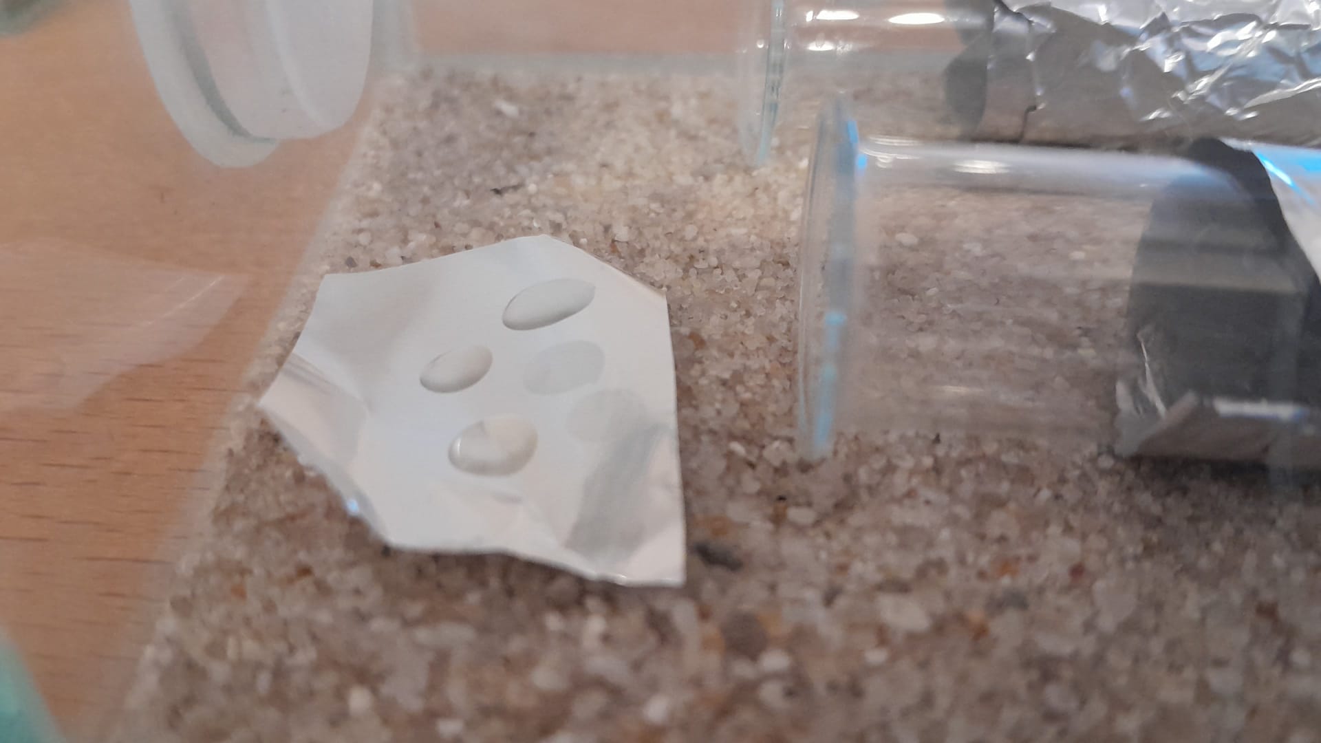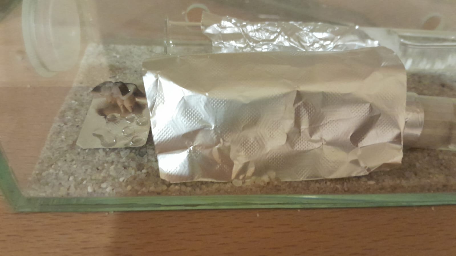 Zu Fressen biete ich aktuell Schabe und Zucker-Honig(bzw. Agavendicksaft)-Wasser an. Interessanterweise konnte ich sie heute dabei beobachten, wie sie vorsichtig aus dem Reagenzglas kam und sehr, sehr begierig das Zuckerwasser getrunken hat (ich musste jenes sogar nochmal nachliefern, da beide Tropfen in kurzer Zeit trocken gesaugt wurden!). Das hat mich darin bestärkt, dass meine Entscheidung, ihr Futter+Arena anzubieten, definitiv die richtige war. Auch sahen die