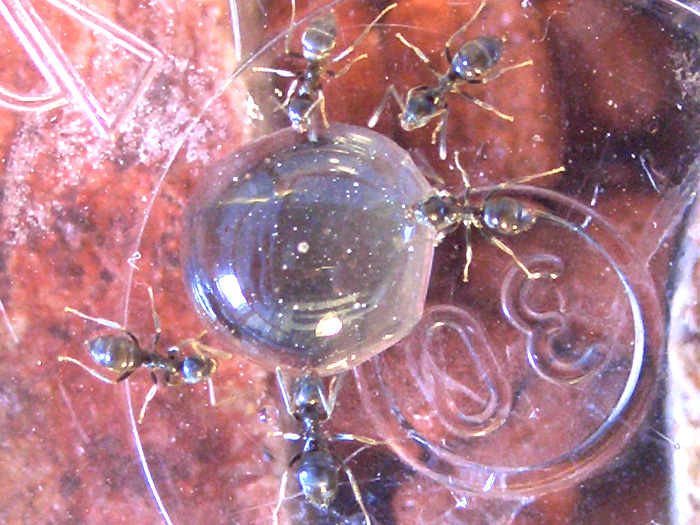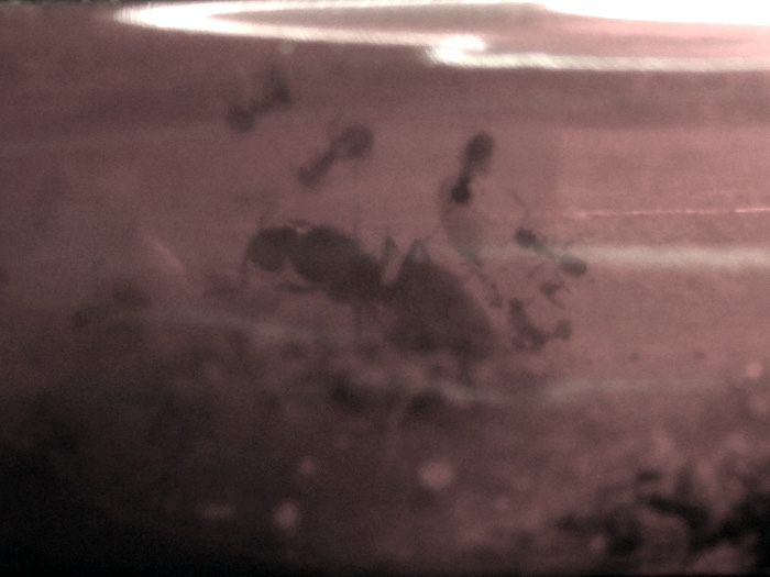 27. August 2008: Es ist viel los im Ameisenvolk. Im Inneren des Glases ist ein groĂer Umzug bzw. groĂes Umsortieren im Gange. In diesem Zuge war ich in der Lage, von auĂen mal eine Bestandsaufnahme machen zu können (siehe Bild), was die