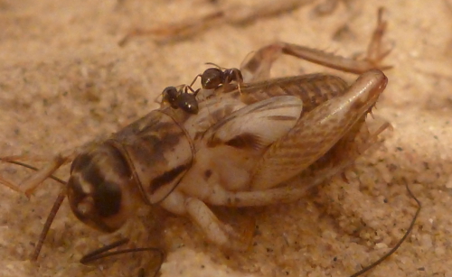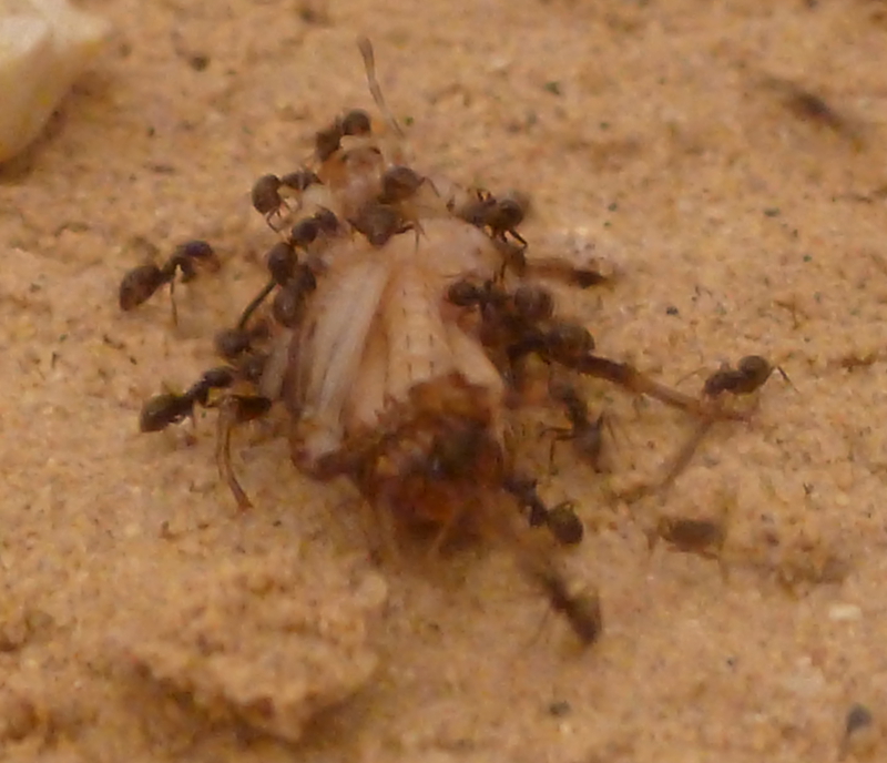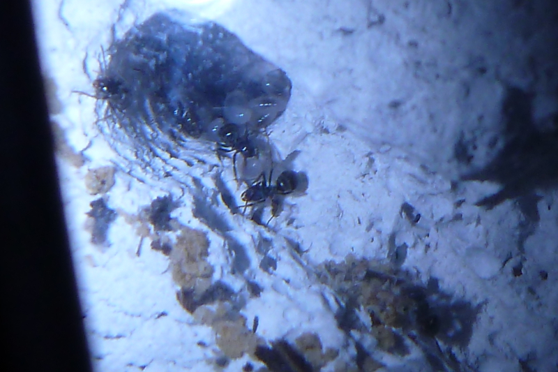 In der Zwischenzeit habe ich mir eine Lupe gekauft (dreifache Vergrößerung), die eine kleine, aber starke LED-Lampe besitzt. Mit dieser kann man die Ameisen vor allem im Nest sehr viel besser beobachten. Nach den Fotos kam ich auf die Idee, ein Stück rote Folie auf die LED zu kleben, jetzt werden die Ameisen bei Beleuchtung sehr viel weniger nervös. Die Fotos habe ich jedoch davor gemacht.